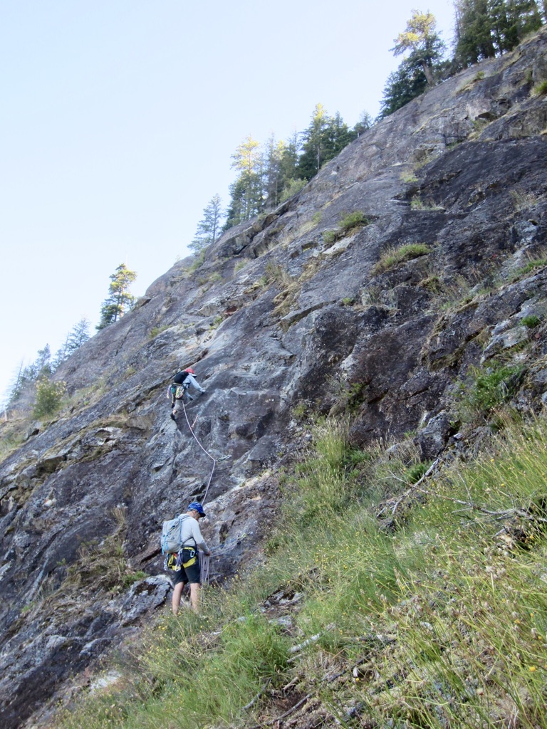 Pitch 2 of Aspergillus ends at a belay anchor located near the left edge of a grassy slope below a steep face. Pitch 2 of Fusarium arrives farther to the right on this same grassy slope at a two-bolt rappel anchor. Both routes share a belay anchor, so it is necessary to traverse leftward across the grassy slope to reach the anchor at Aspergillus. However, to avoid congestion at the belay anchor, Yoko and I chose to belay from the Fusarium rappel anchor and then begin Pitch 3 with the slope traverse. This created some rope drag but worked well otherwise.