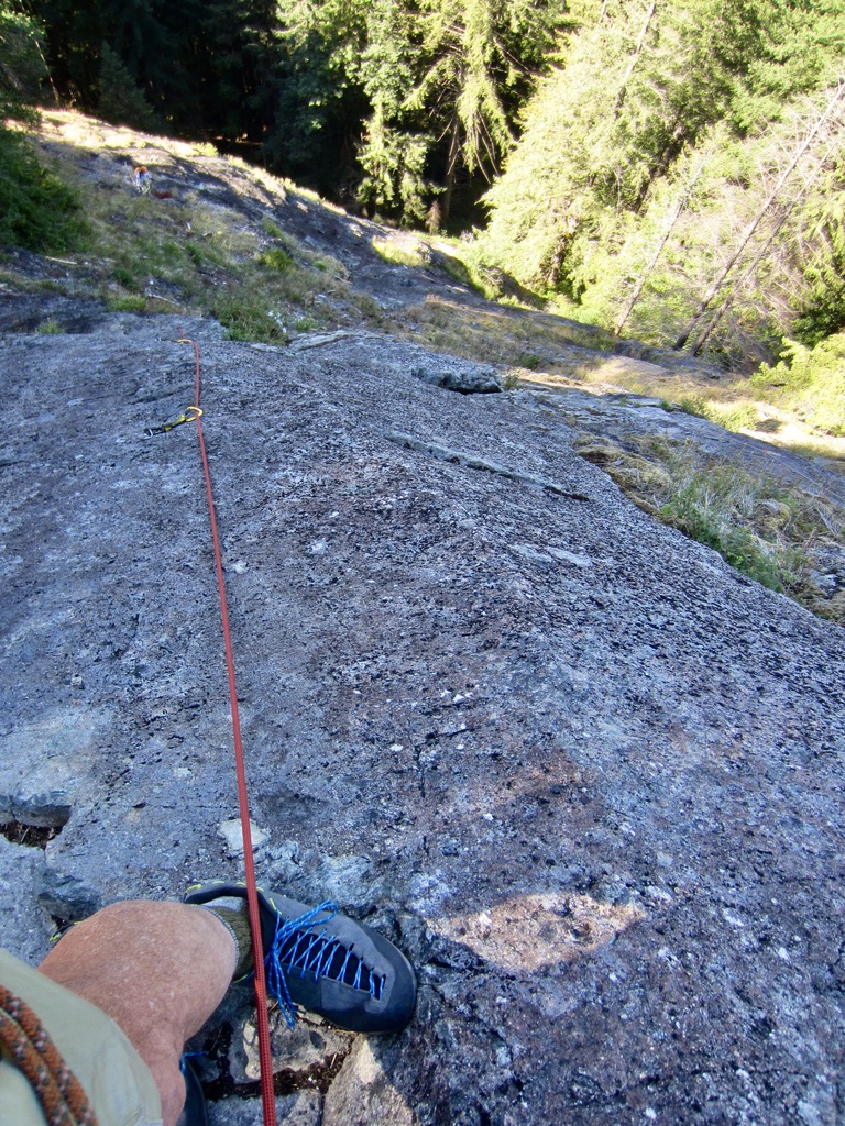 Yoko, Blaine, and Mike wore conventional rock shoes on the climb, whereas I wore La Sportiva TX Guide approach shoes (reviewed here). In the end, we each found that our footwear provided adequate friction on the gritty meta-volcanic rock.