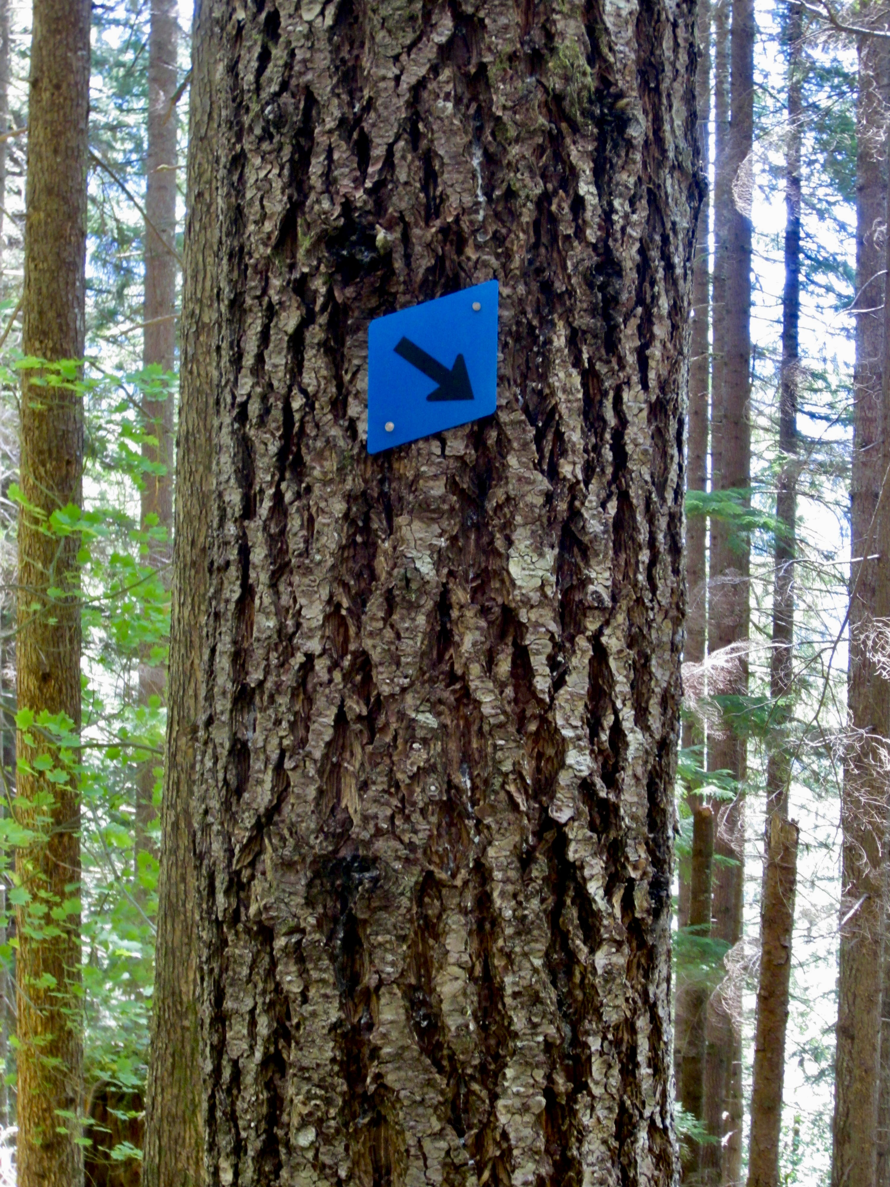 About 15 minutes of hiking took us past two minor viewpoints and up several sets of wooden stairs. Approximately 100 yards beyond the second viewpoint, the trail makes a sharp switchback to the left (0.56 miles + 400 feet from TH). This is where the Spouse Wall approach path branches off from the main trail. Look for a blue diamond on a tree, and a faint path angling downhill.