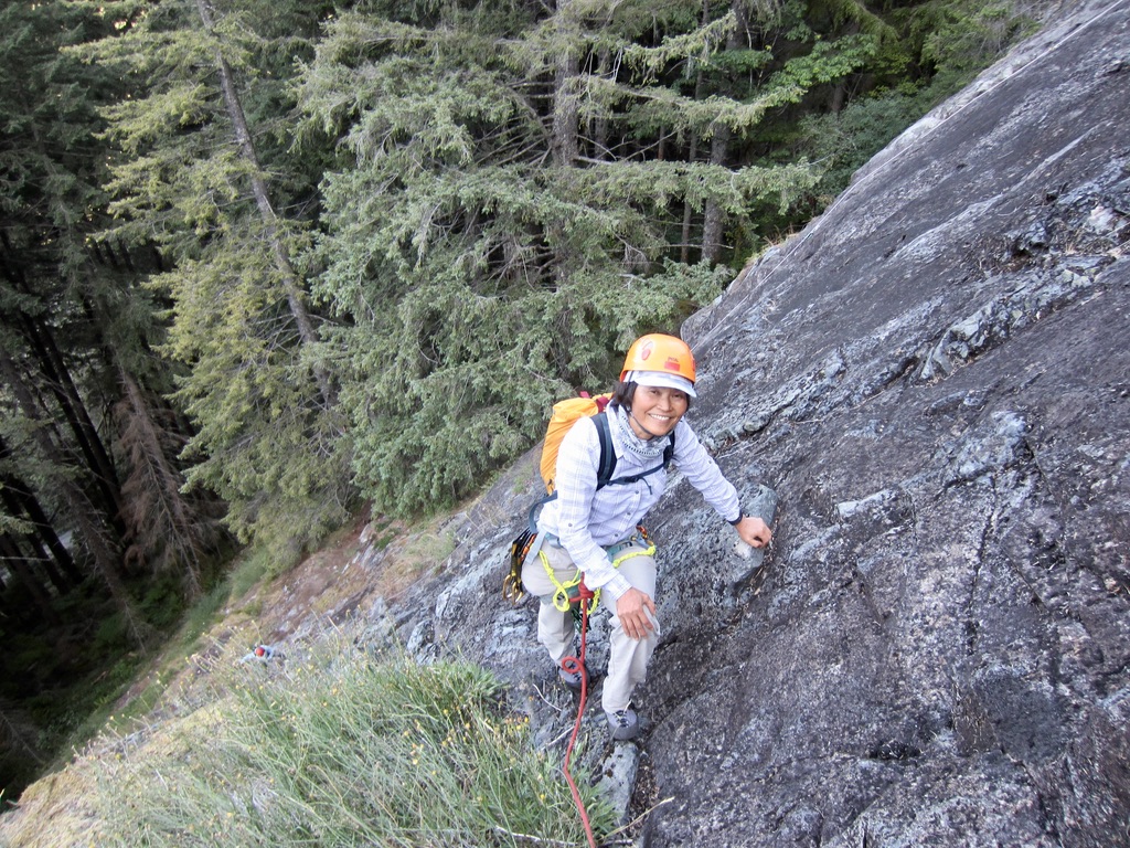 The Rappels: Our descent got off to a bad start because I mistakenly thought that Yoko and I could combine Pitches 5 and 4 into a single long rappel. Our 70-meter rope did not reach the Pitch 3 anchor on Fusarium, so we had to do a short down-climb to reach the Pitch 3 anchor on Aspergillus. From there, we made a long rappel down to the grassy slope, then walked over to the Pitch 2 anchor on Fusarium. Two more rappels got us down to the base ledge. My take-aways from this experience are as follows: