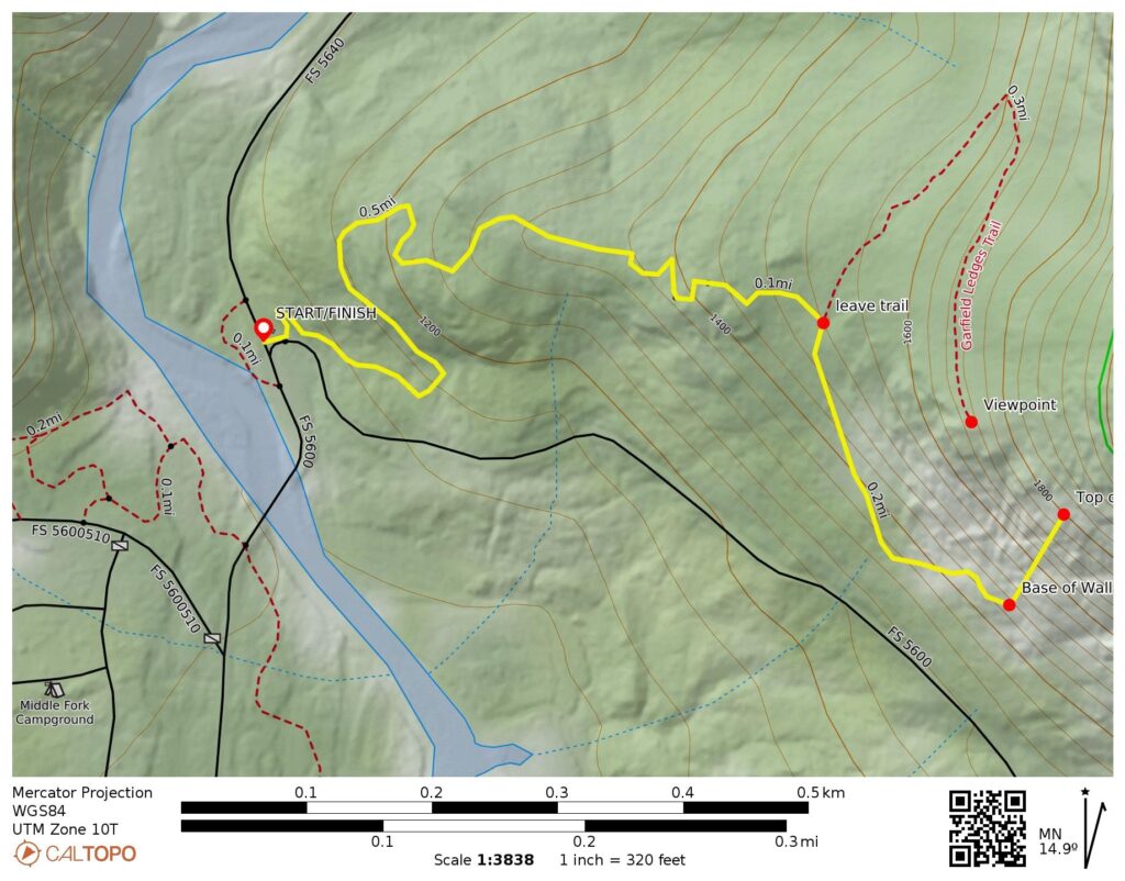 Approach Starting & Ending Point: Garfield Ledges Trailhead at junction of Middle Fork Snoqualmie River Road #5620 & Taylor River Road #5640 (Elev. 1100 feet)