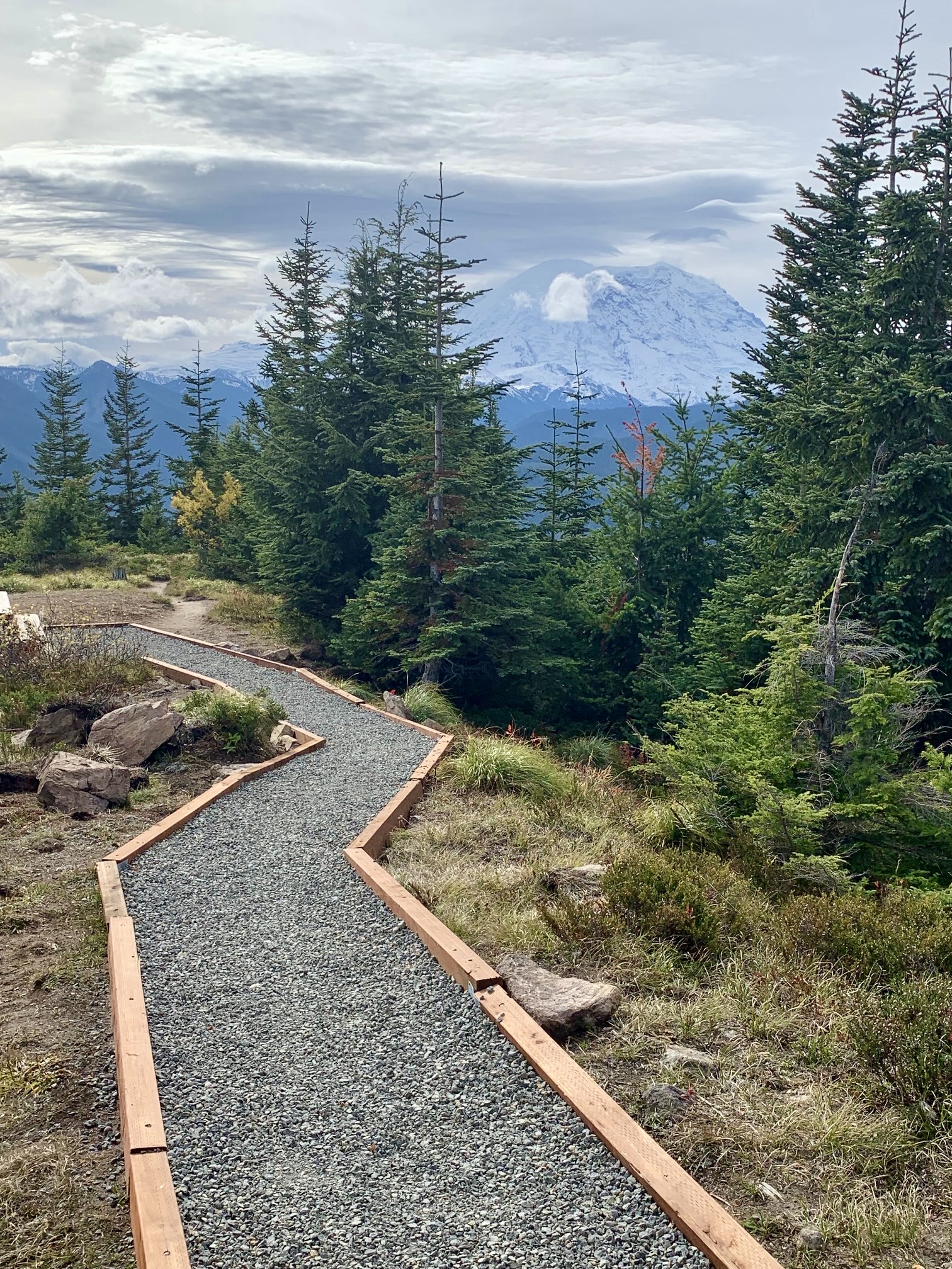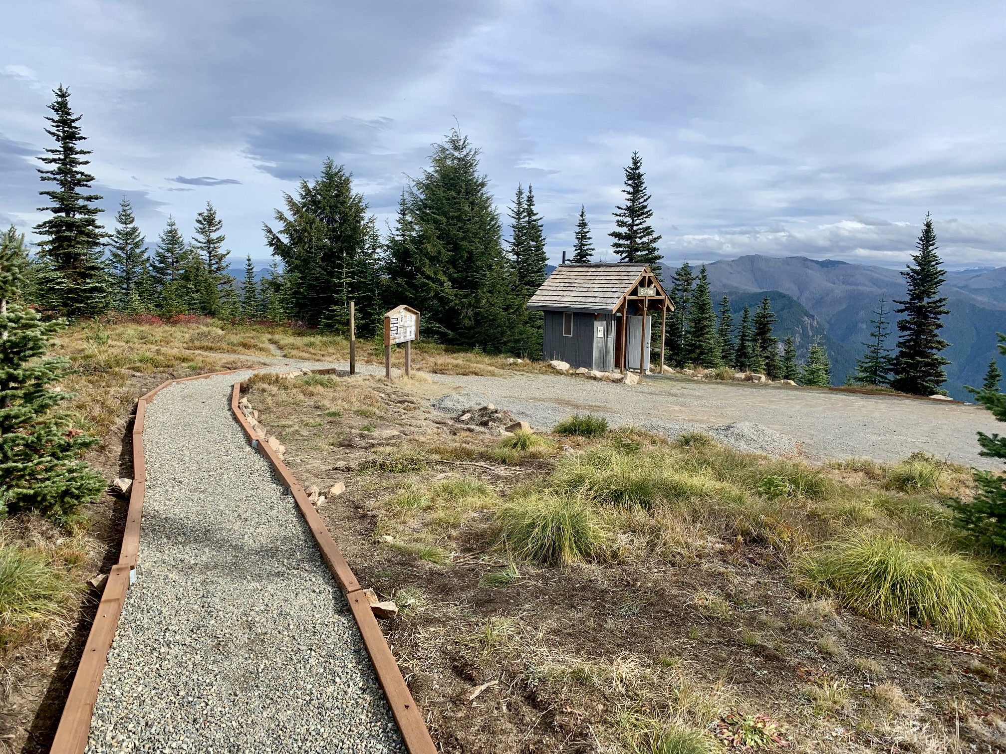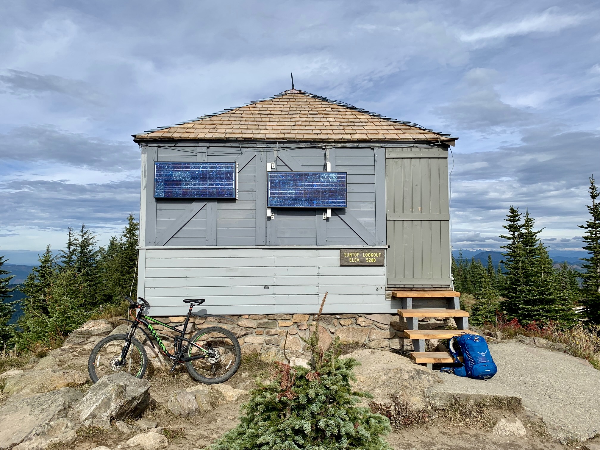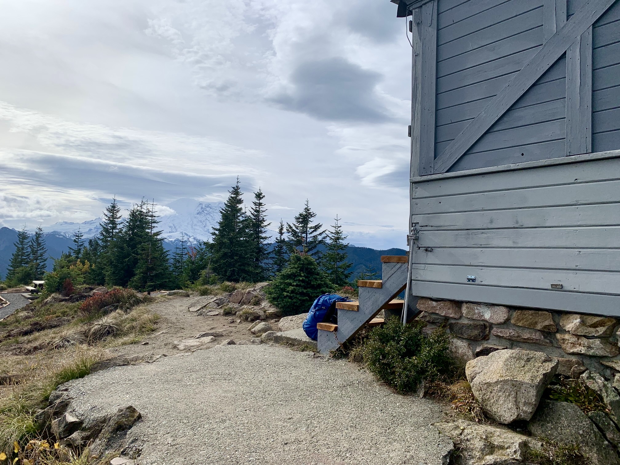 The old fire lookout cabin appears to be in good condition and has received various upgrades in recent years, including a new shake roof, fresh paint, and small solar panels. The entire summit area is nicely landscaped, with gravel walkways and a picnic site. Mt. Rainier was visible through a cloudy sky to the south.
