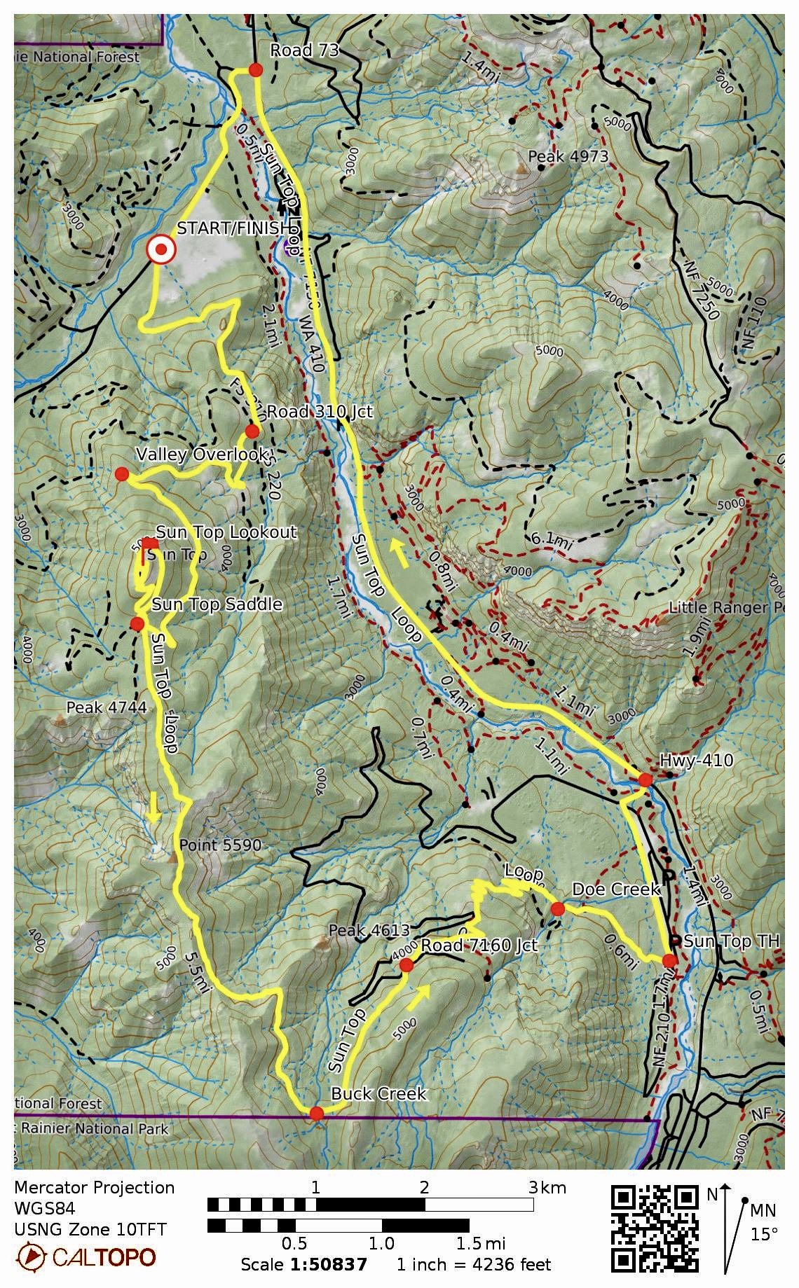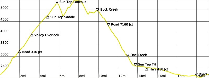 Way Points: Road 7315 junction & Huckleberry Valley Overlook & Sun Top Saddle & Sun Top summit/Lookout & Sun Top Saddle & Point 5590 & Buck Creek & Road 7160 crossing & Doe Creek & Sun Top Trailhead / Road 7160-210 junction & Ranger Creek Landing Strip & Road 7160 junction & White River Bridge & Highway 410 junction & Road 73 junction & White River Bridge & Road 73 pullout (bike ride via Sun Top Road #7315—Sun Top Trail #1183—Road #7160-210—Highway 410—Road #73)