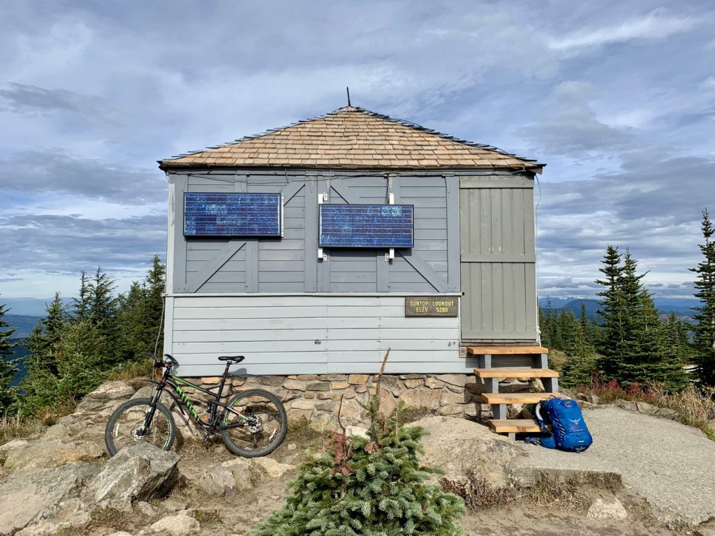 To perform this semi-popular mountain biking loop, I parked at the Sno-Park pullout on Huckleberry Creek Road #73 and pedaled up Sun Top Road #7315. This road ascends at a steady and moderate grade, passing a junction with Road #7315-310 (2.1 miles + 1000 feet) and Huckleberry Valley Overlook (3.4 miles + 1750 feet) before reaching 4760-foot Sun Top Saddle (4.9 miles + 2500 feet). From there, I continued riding up the road as it spirals around the uppermost part of Sun Top and ends at the summit lookout cabin (5.9 miles + 3050 feet + 2.0 hours from starting point).