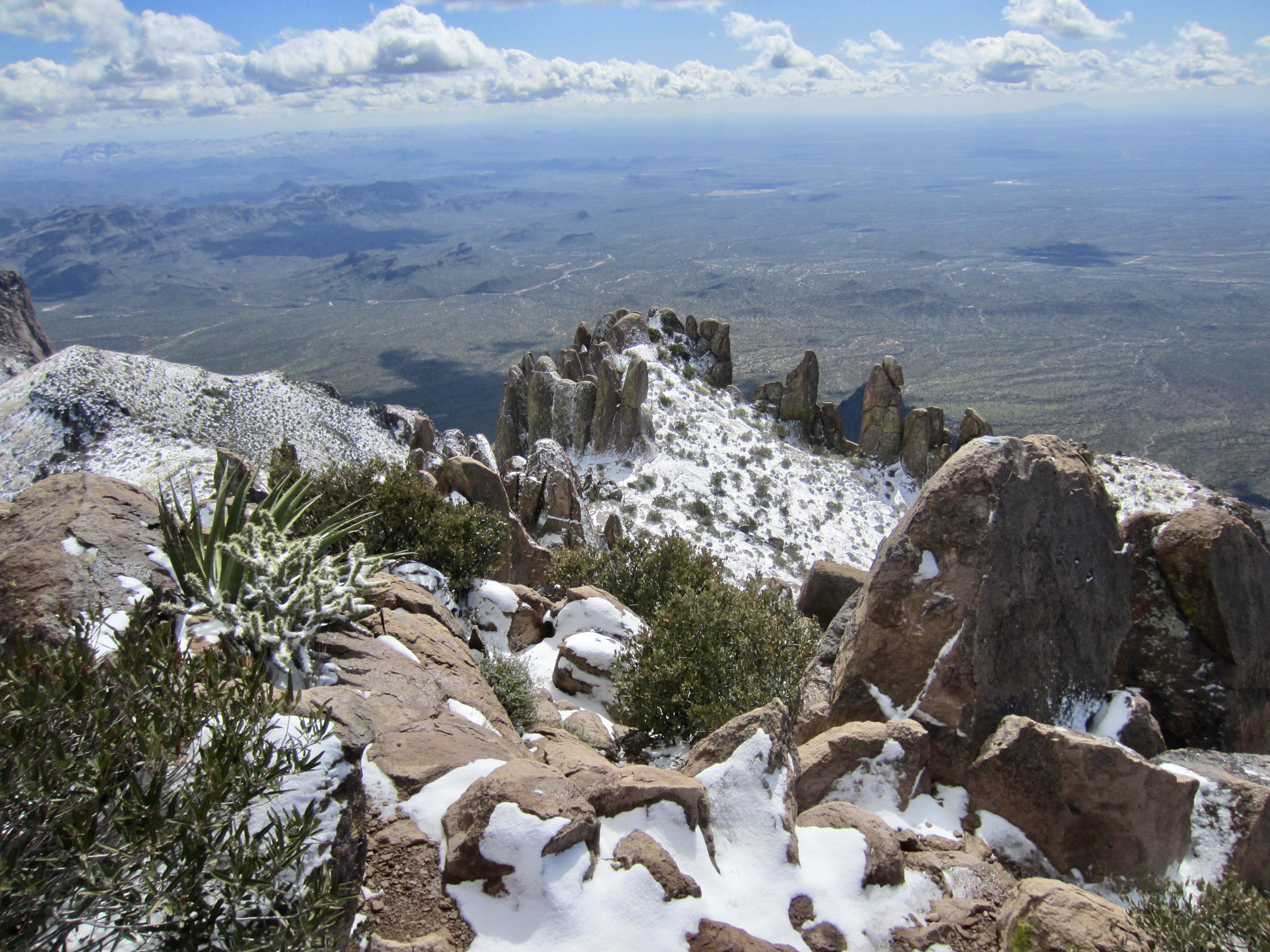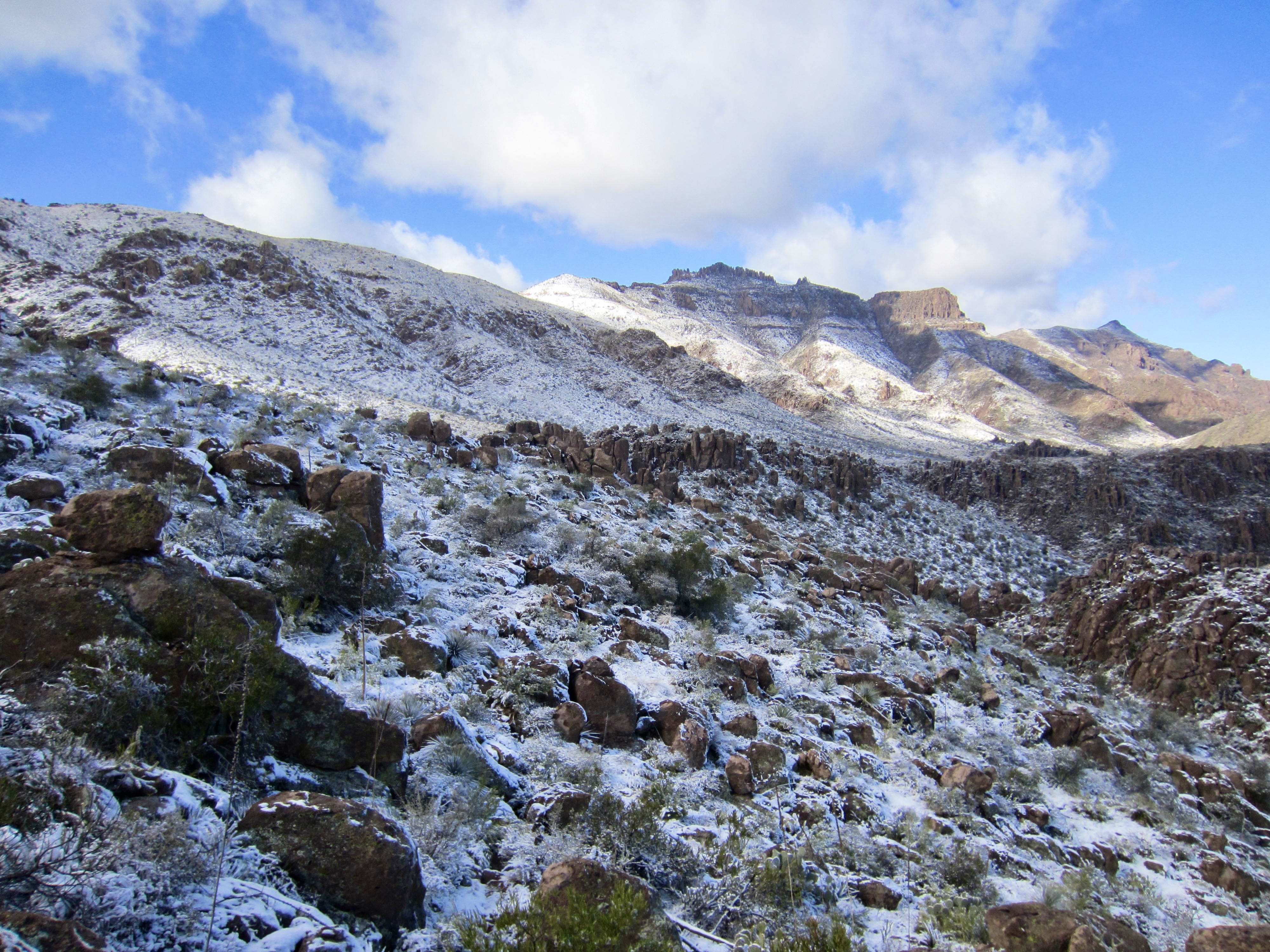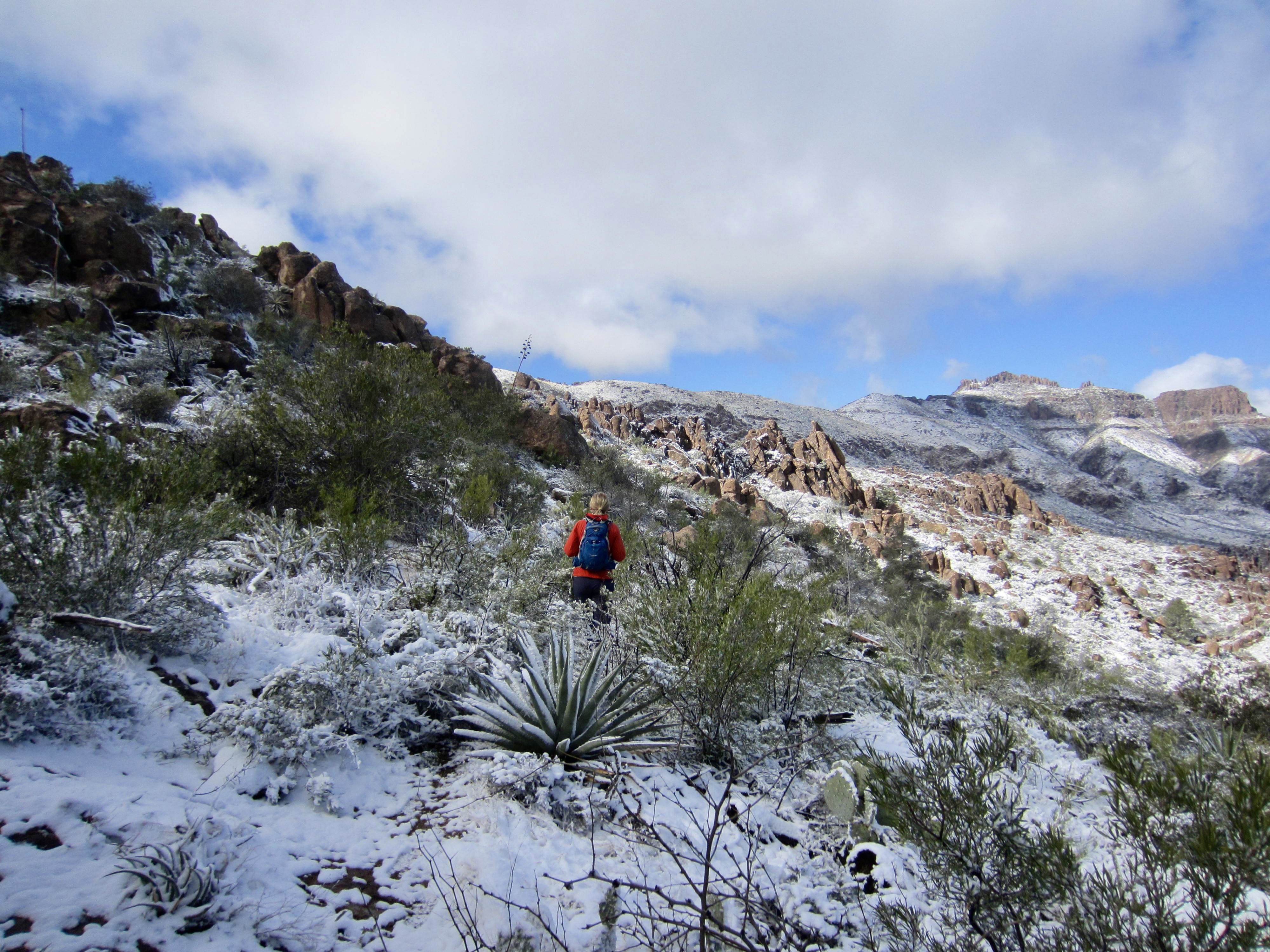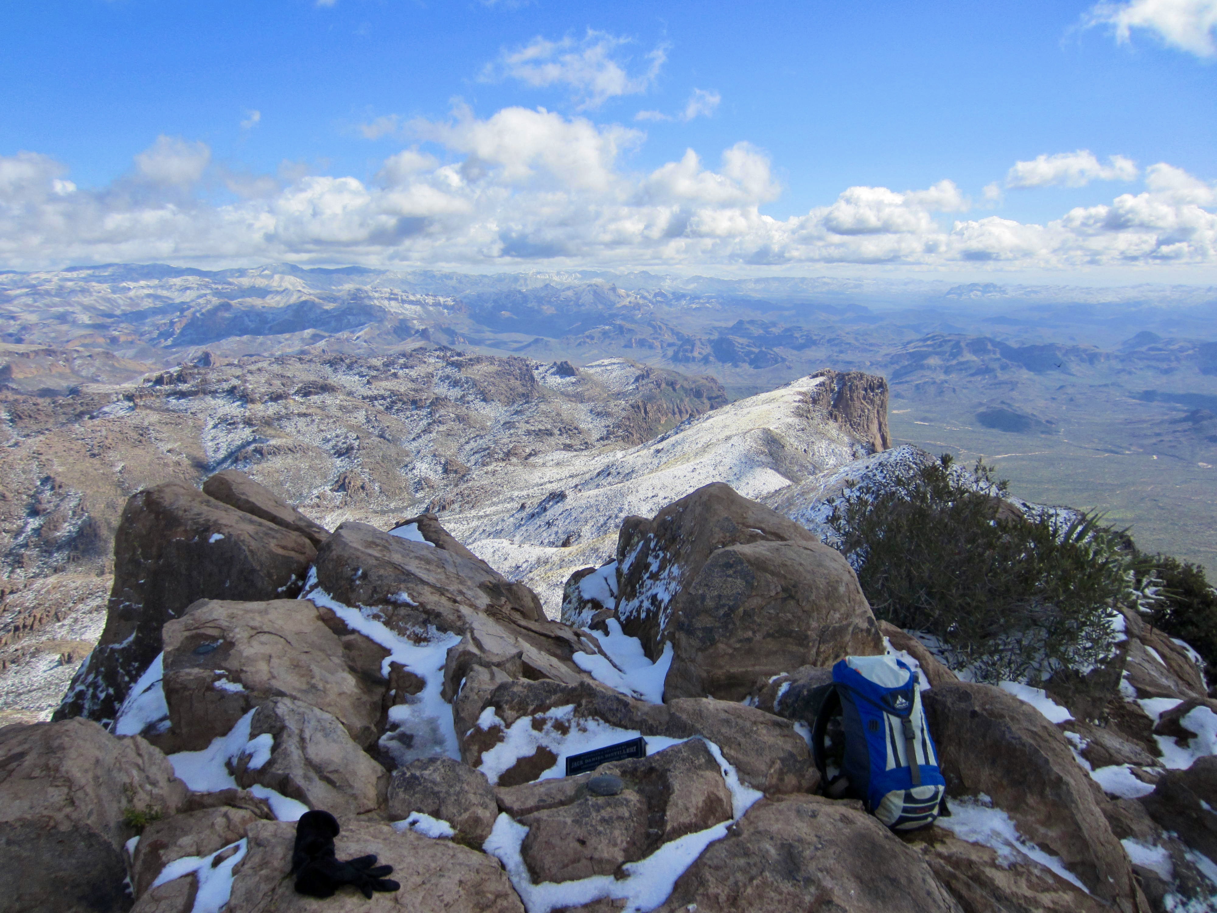 Ever since doing a traverse of Superstition Ridge from Siphon Draw to Hieroglyphic Canyon three years ago, Eileen and I had wanted to climb Superstition Peak—the 5057-foot high-point of the entire ridge and the namesake summit of the Superstition Mountains (fondly known as the “Supes”). We got an opportunity during a February trip to Phoenix, but our outing was hampered by a spell of unusually wintry weather.