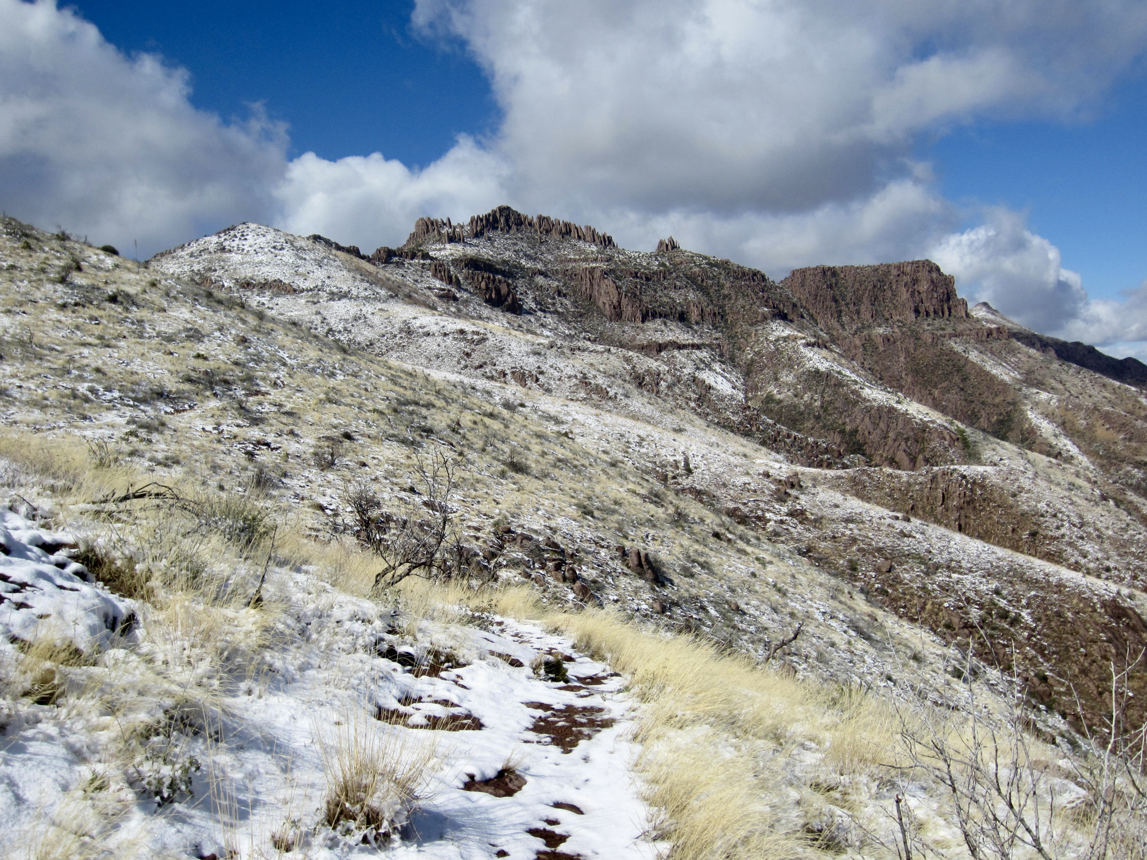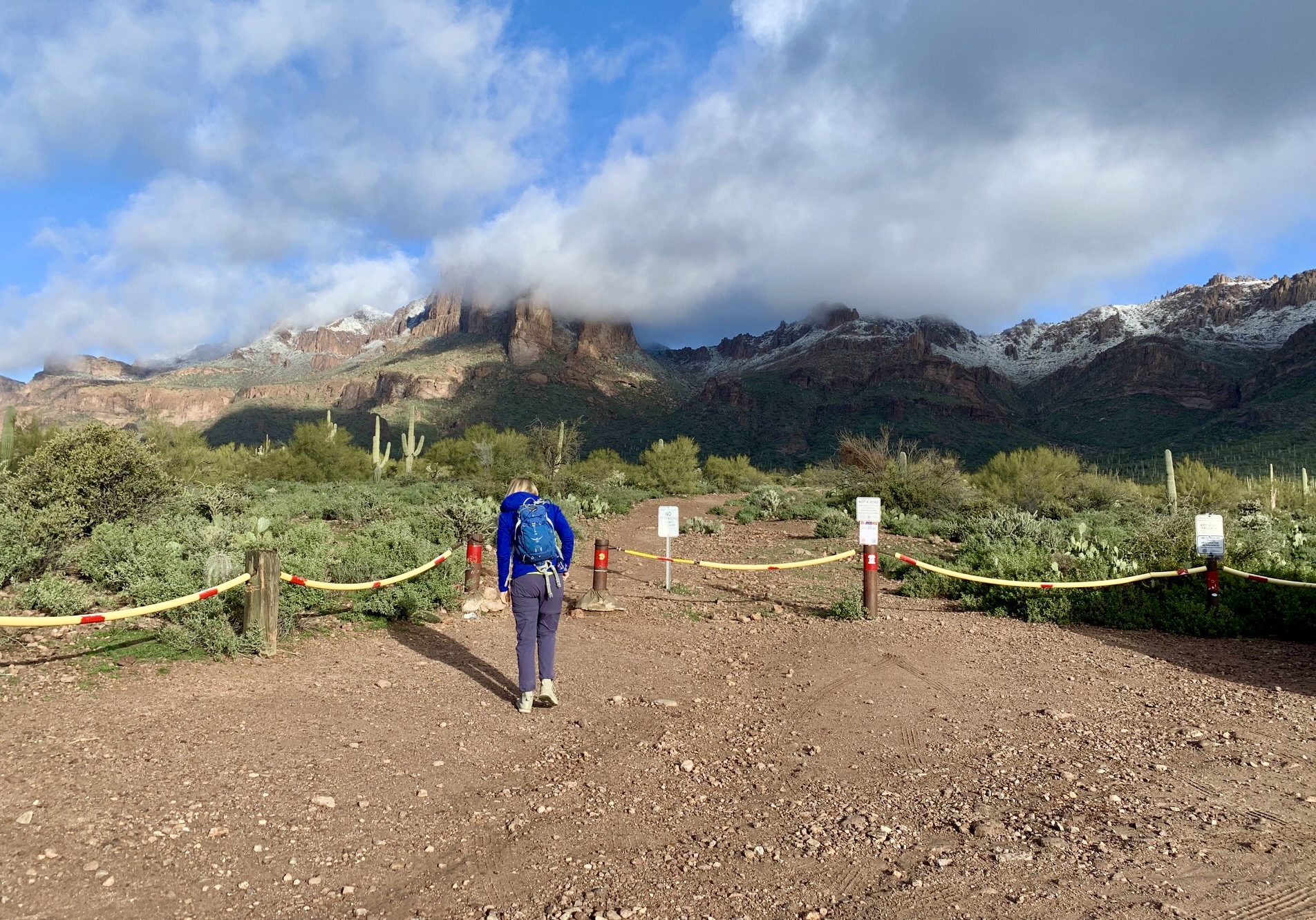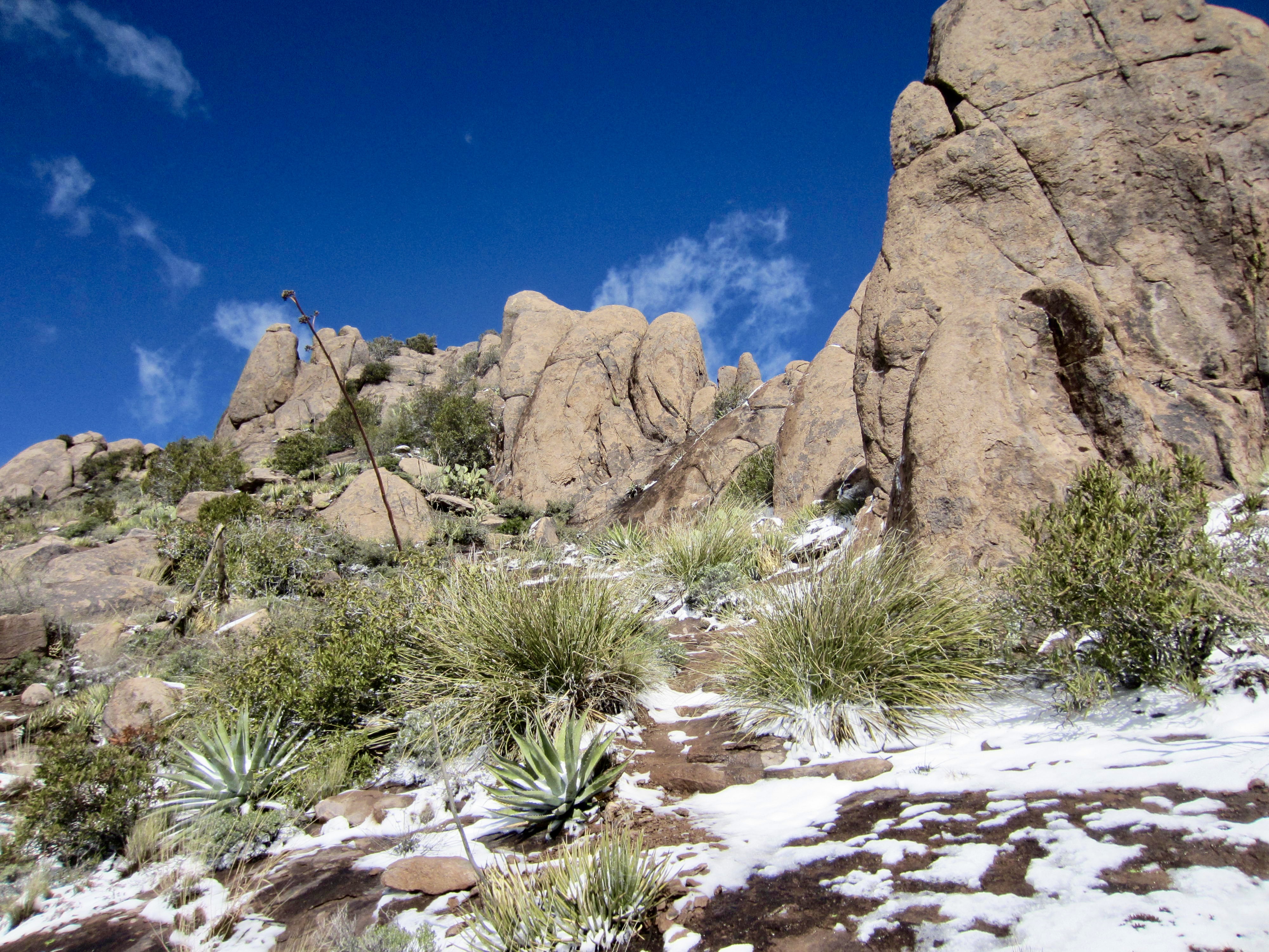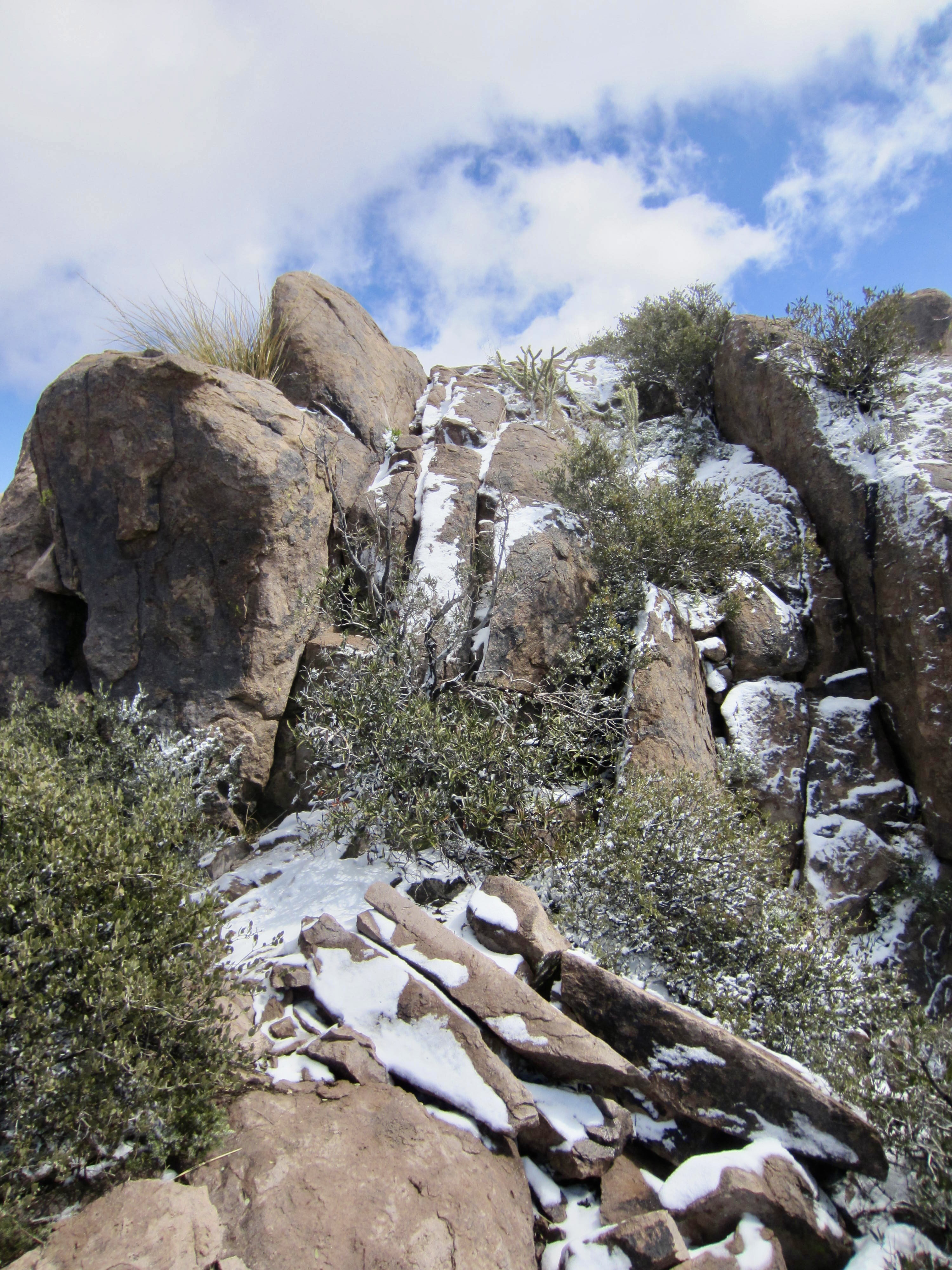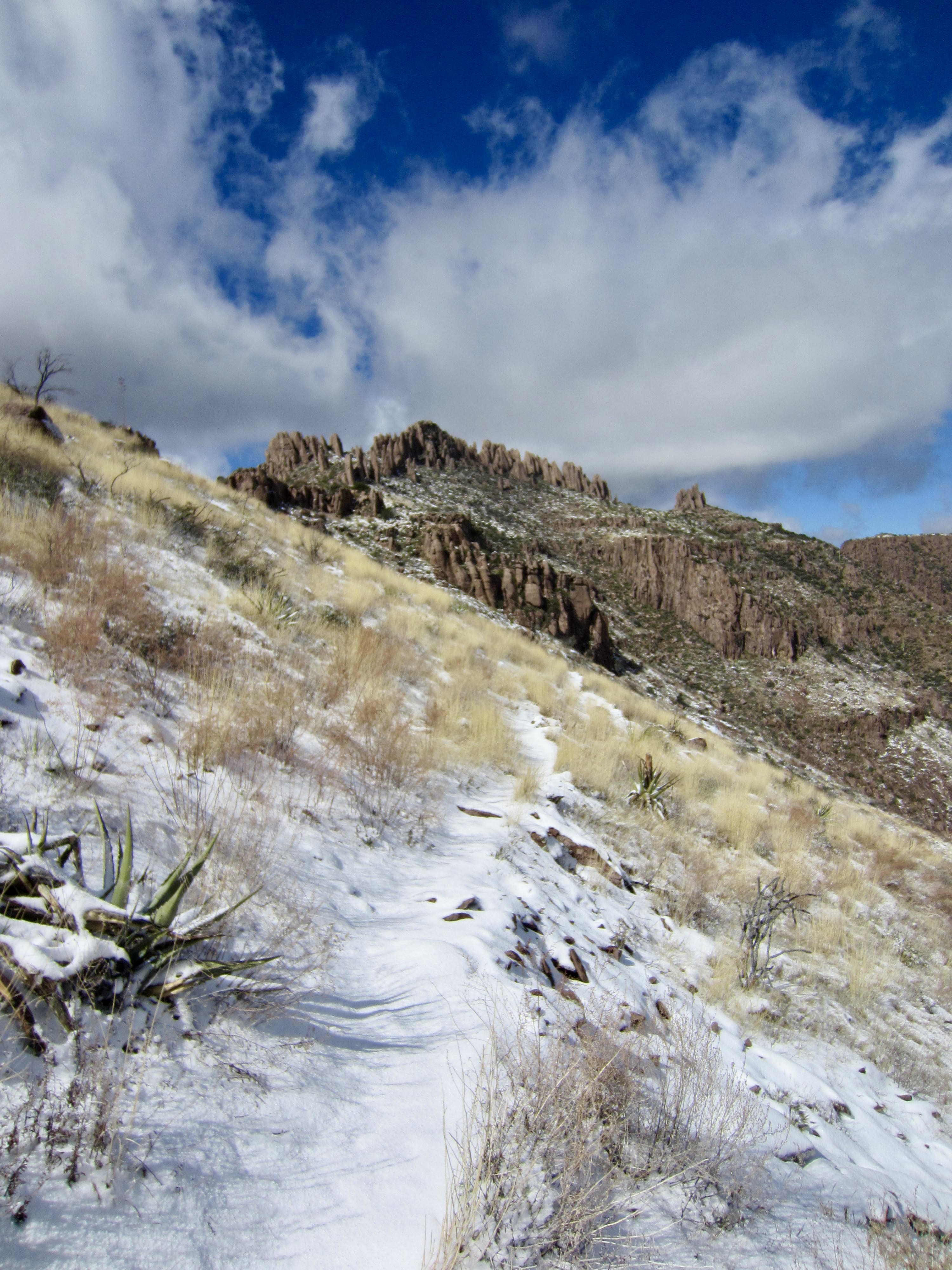 Ever since doing a traverse of Superstition Ridge from Siphon Draw to Hieroglyphic Canyon three years ago, Eileen and I had wanted to climb Superstition Peak—the 5057-foot high-point of the entire ridge and the namesake summit of the Superstition Mountains (fondly known as the “Supes”). We got an opportunity during a February trip to Phoenix, but our outing was hampered by a spell of unusually wintry weather.