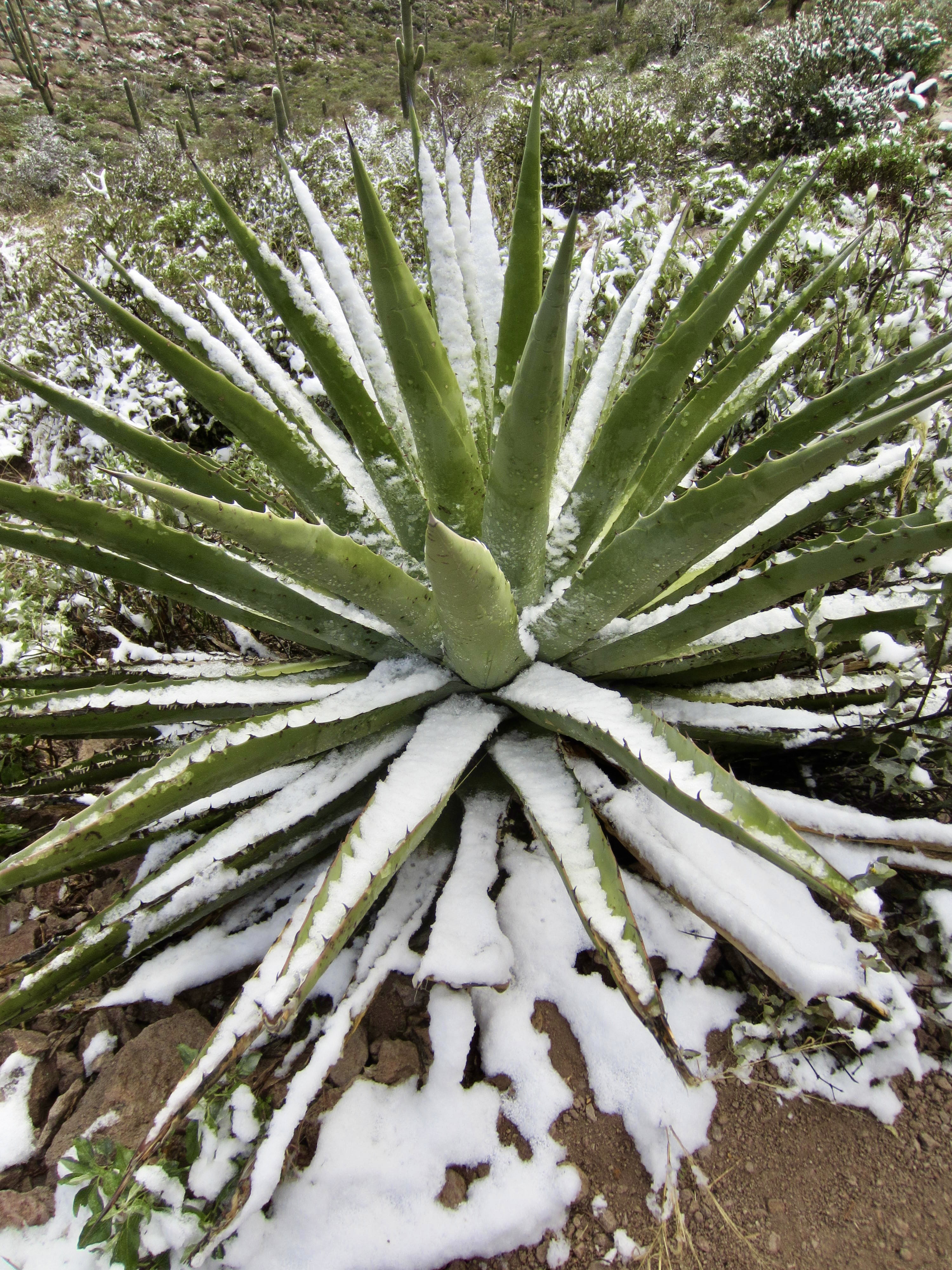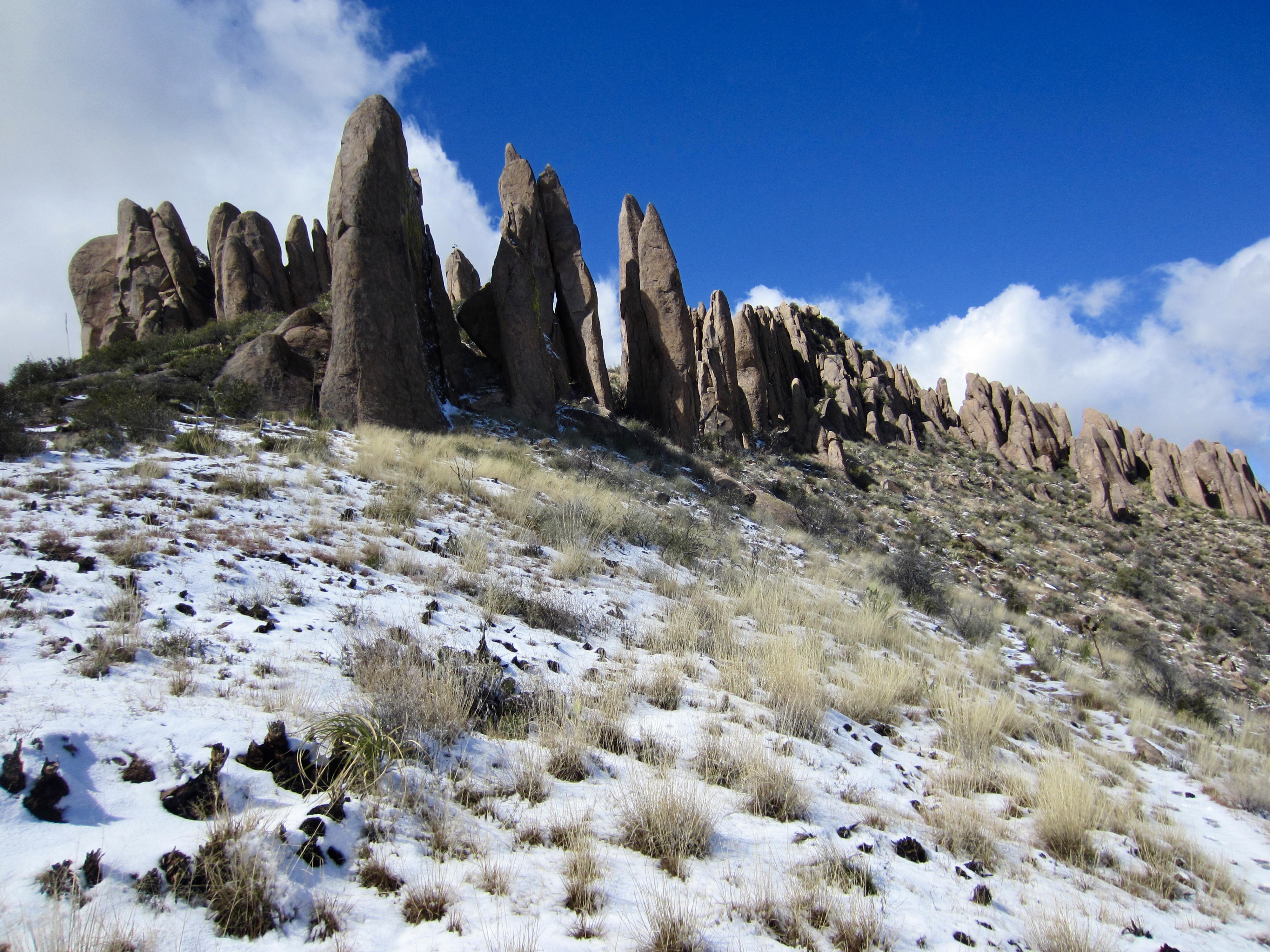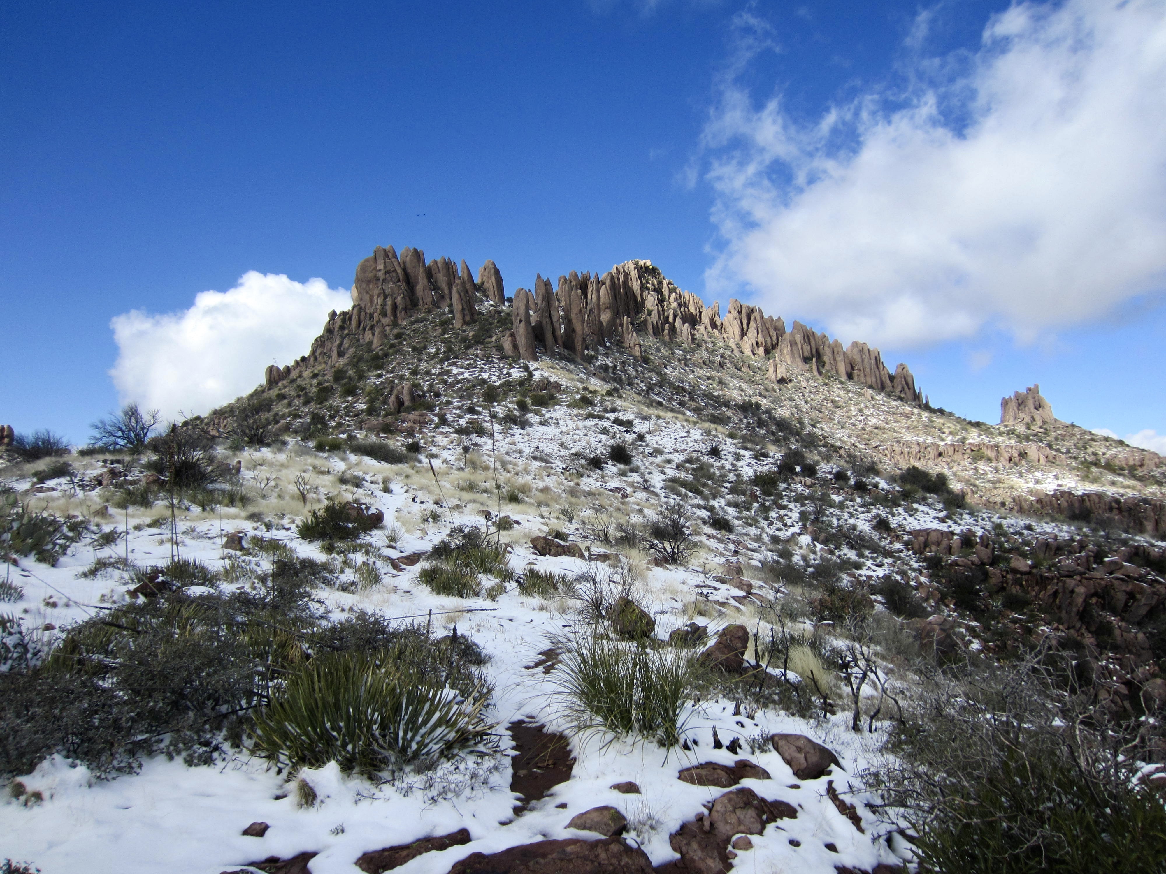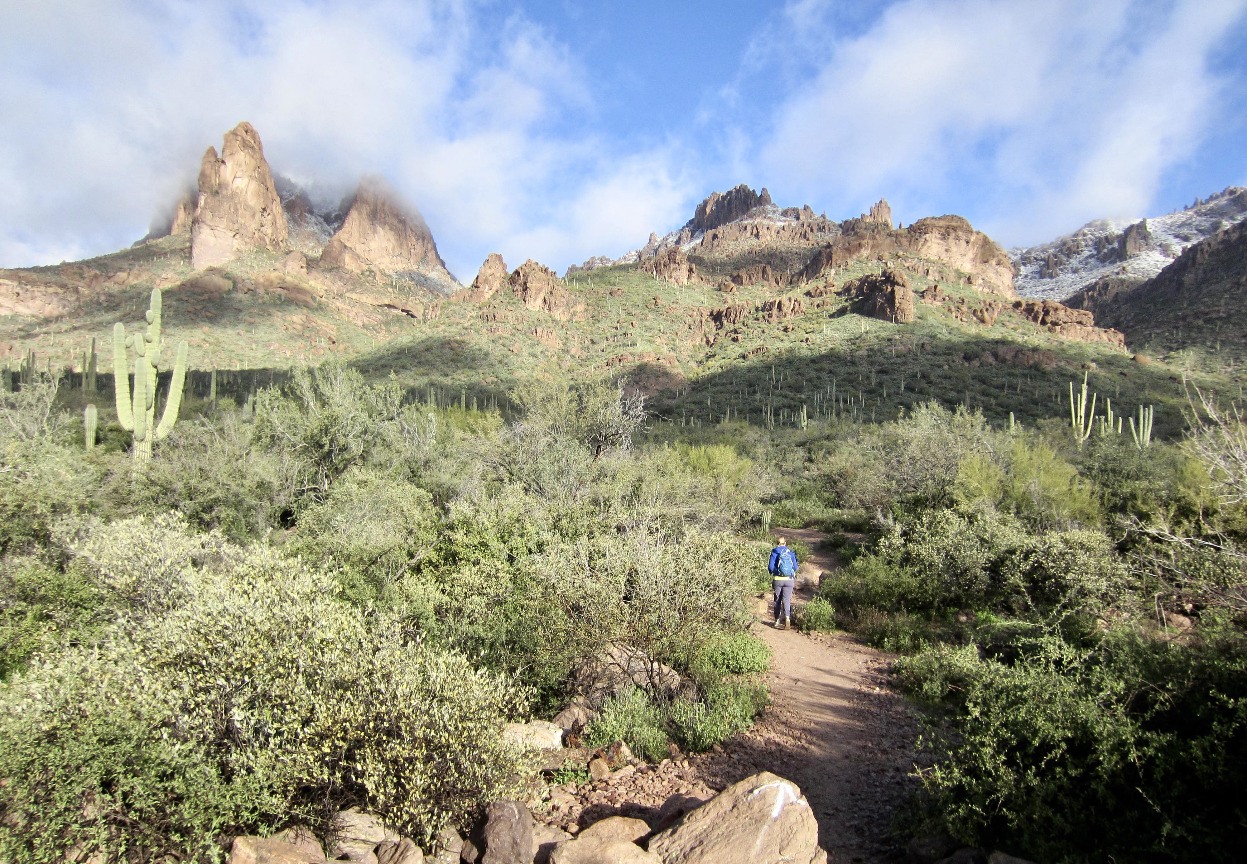 Ever since doing a traverse of Superstition Ridge from Siphon Draw to Hieroglyphic Canyon three years ago, Eileen and I had wanted to climb Superstition Peak—the 5057-foot high-point of the entire ridge and the namesake summit of the Superstition Mountains (fondly known as the “Supes”). We got an opportunity during a February trip to Phoenix, but our outing was hampered by a spell of unusually wintry weather.