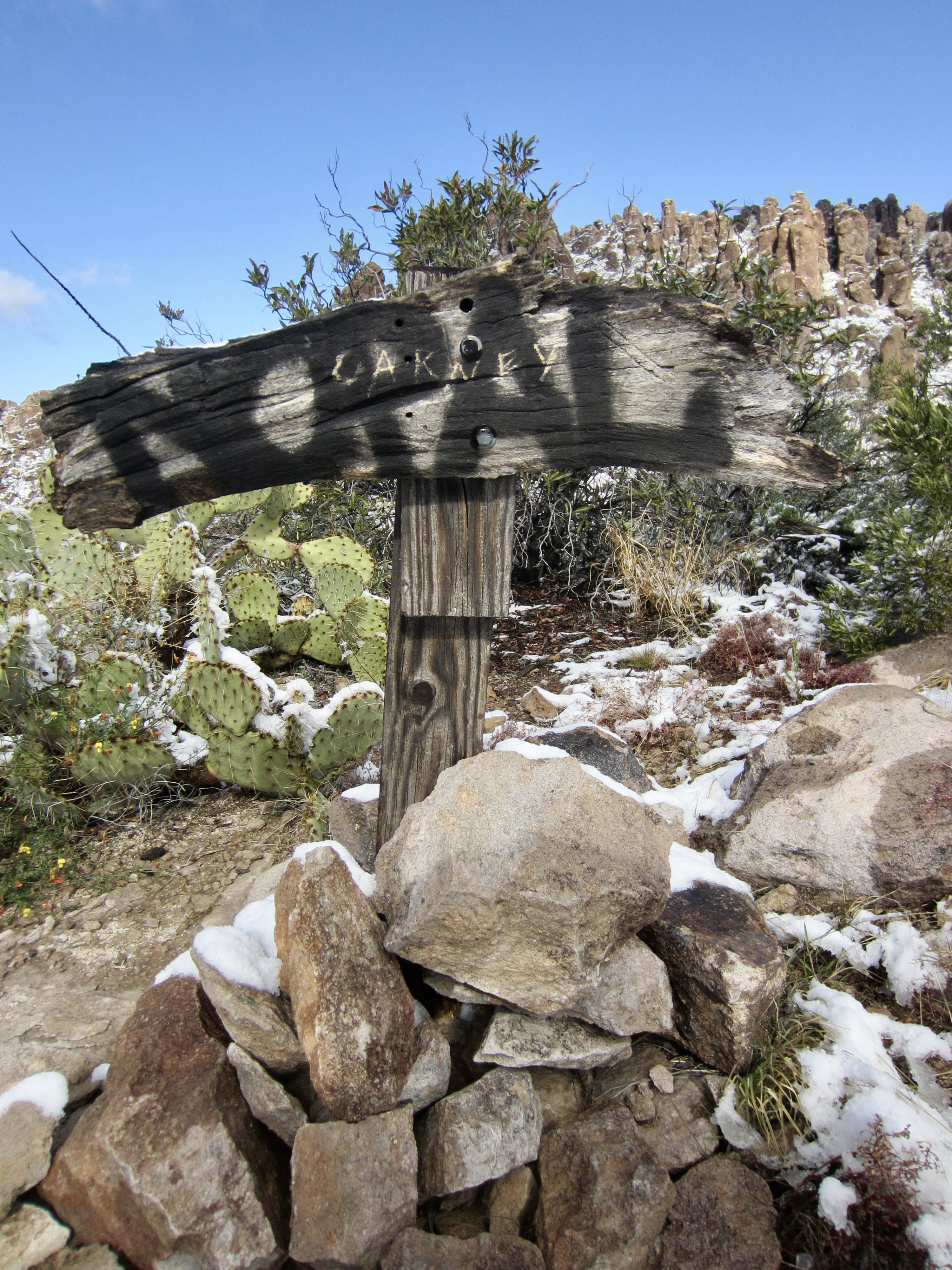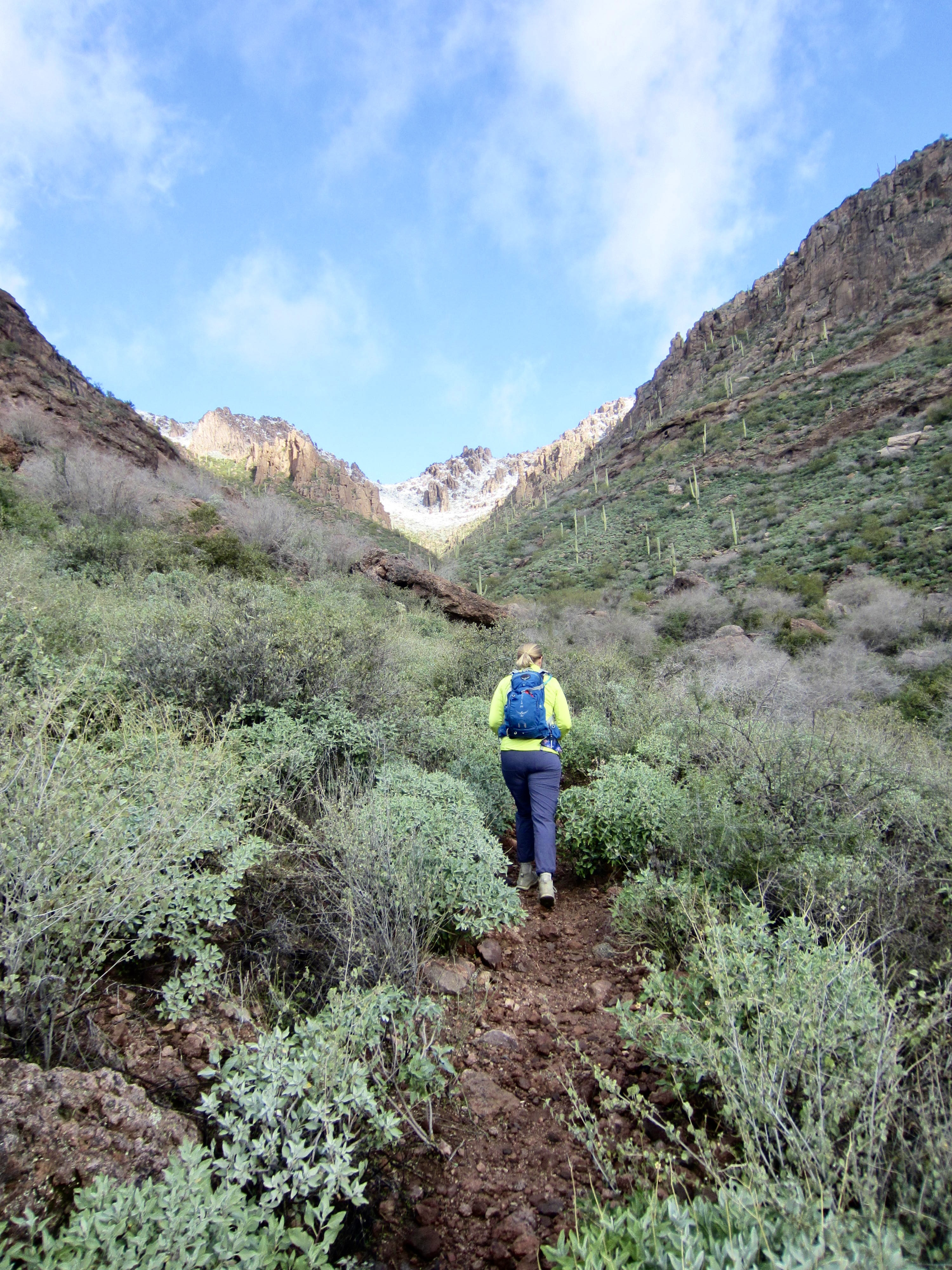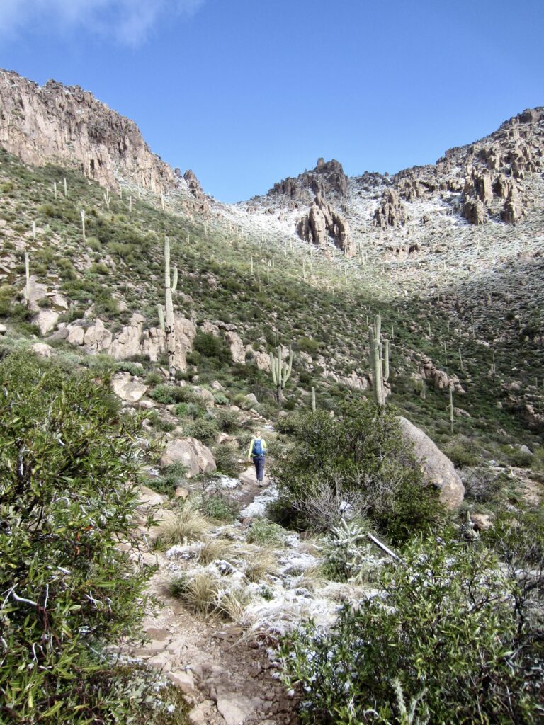 We left the Carney Trailhead on a sunny but very cold Wednesday morning. The temperature was 37°F and the Superstition Mountains were dusted with fresh snow. No doubt, this would be an interesting day, especially where the route involved rock scrambling.