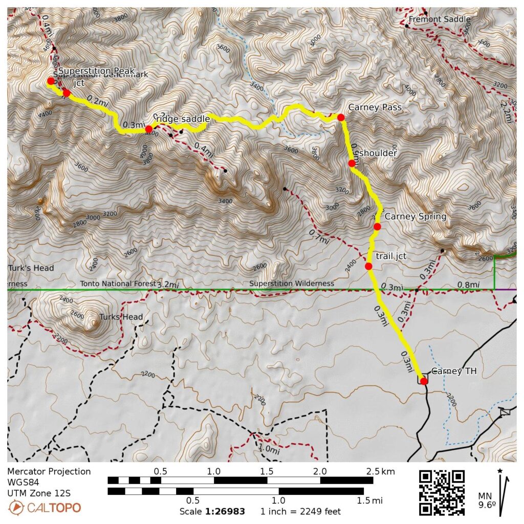 Way Points: Superstition Wilderness boundary fence & Wind Cave Trail junction & Carney Spring & Carney Gulch shoulder & Carney Pass & Superstition Ridge saddle & Superstition Peak summit (trail hike & trail scramble & off-trail scramble)