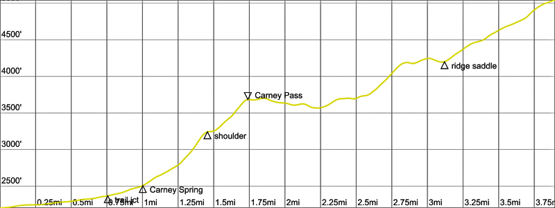 Taking the right fork, we soon passed Carney Spring and entered Carney Gulch. The trail becomes increasingly steeper and rougher in the gulch, with many scrambly sections but no real difficulties. Just after a particularly steep section, we gained a flat shoulder and got a close-up view of Carney Pass—a low saddle in the craggy ridge above.