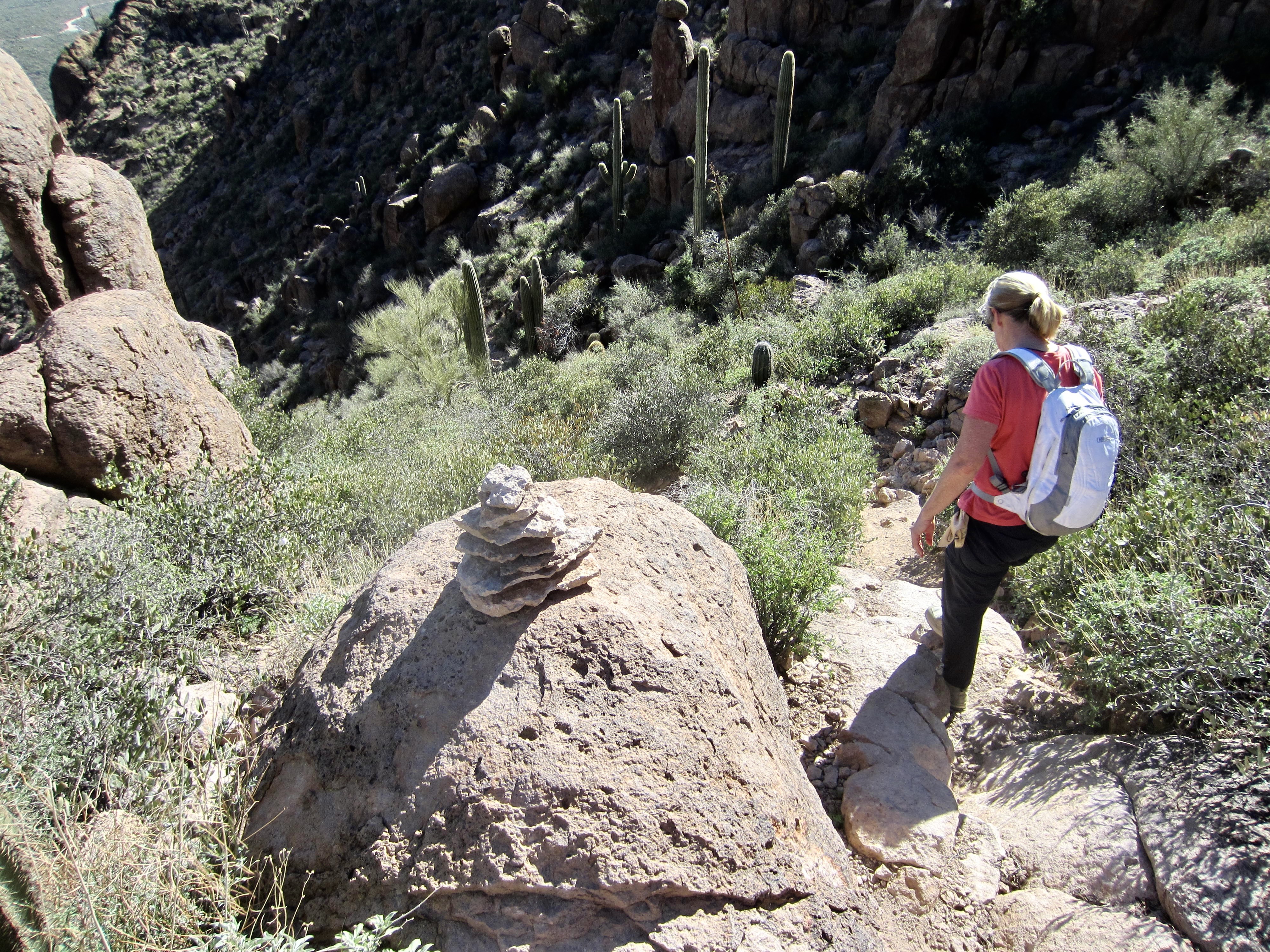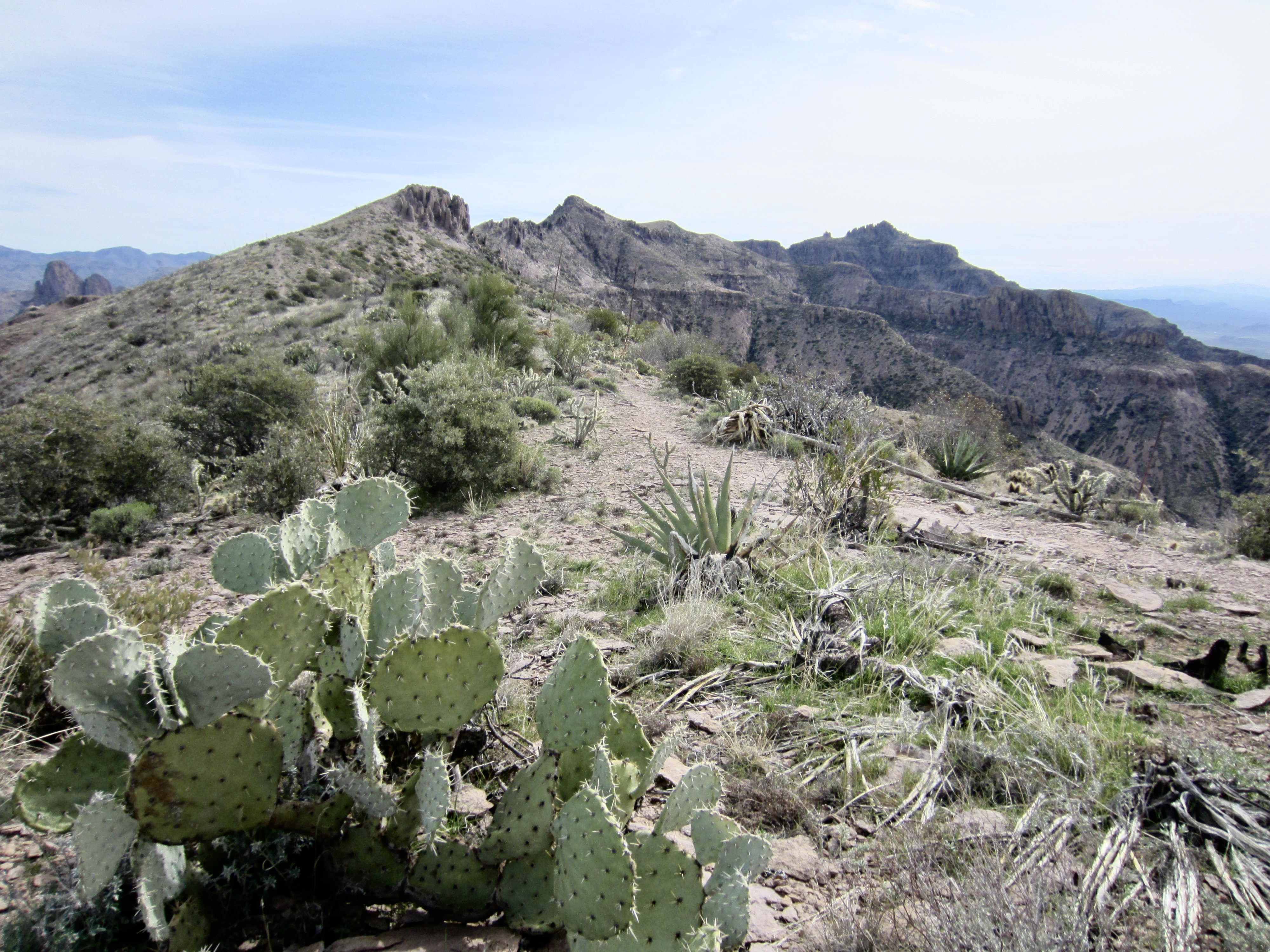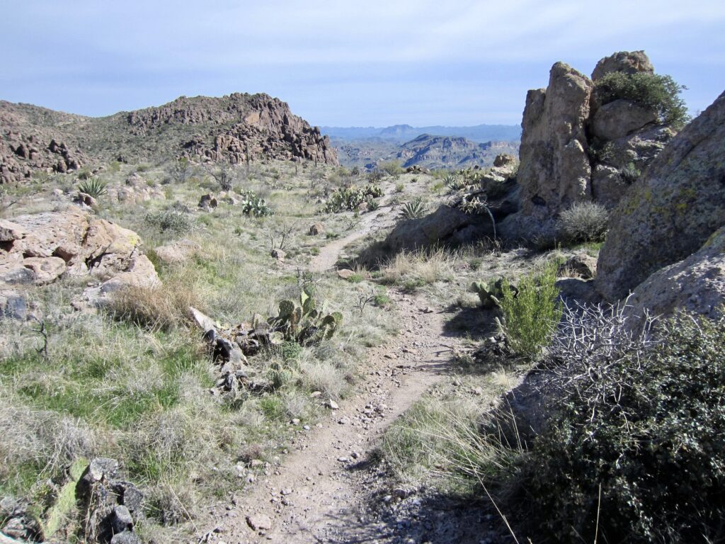 The primitive Superstition Ridge Trail runs along the entire ridge, wandering back and forth along the crest, going around deep canyons, climbing over rock outcrops, and dipping into low saddles. But don’t be misled by the word trail, because it is more of a desert high route. There are enough sketchy areas, side paths, and scrambly sections to keep you on your toes. Fortunately, most of the route is well-marked with ducks, cairns, and painted arrows, so route-finding is generally not too difficult. Nonetheless, a brief moment of inattention could quickly send you wayward. Even when carefully staying on trail, there are countless chollas and yuccas reaching out for your legs, so full-length canvas trousers would not be your worst garment choice.