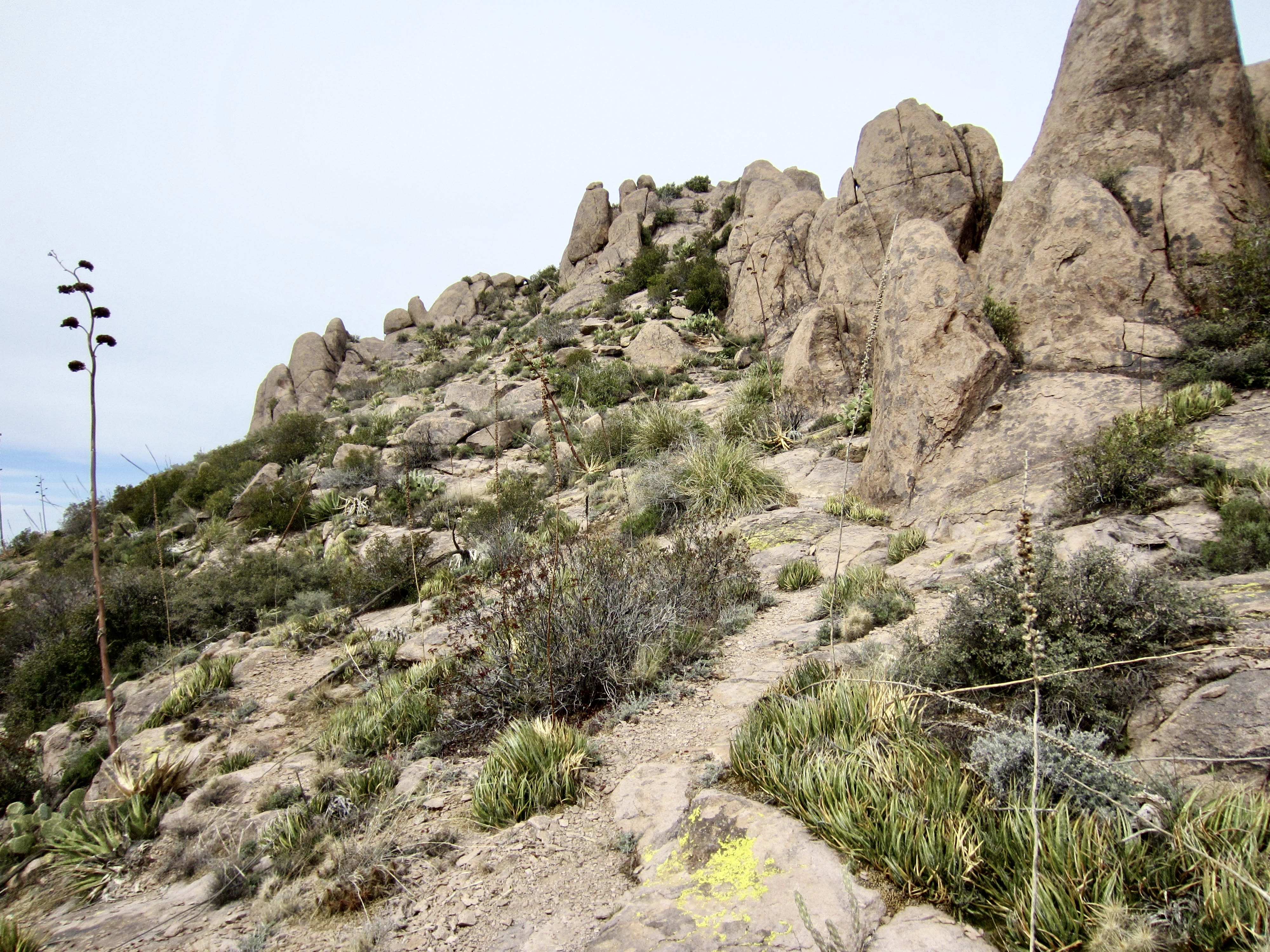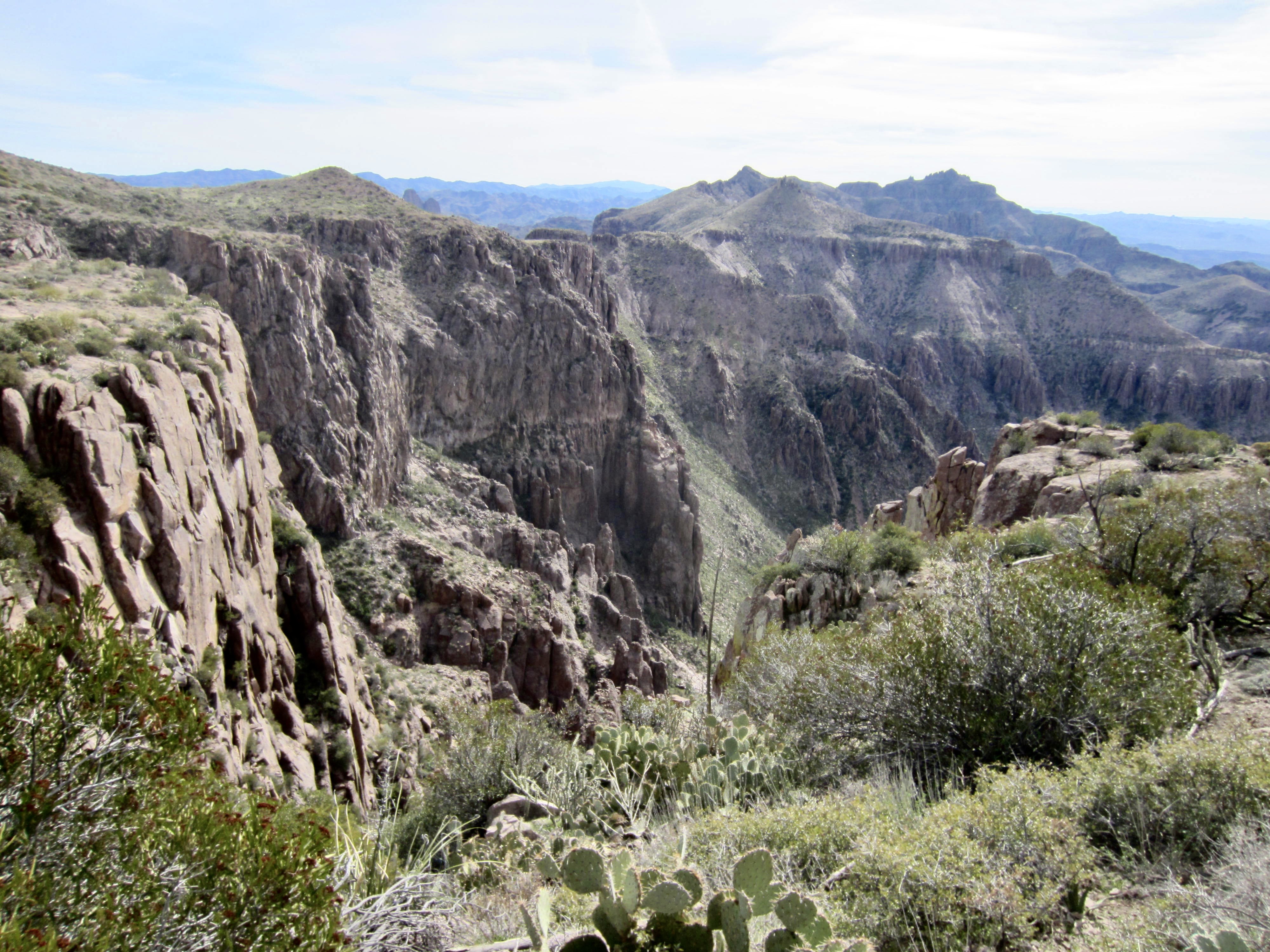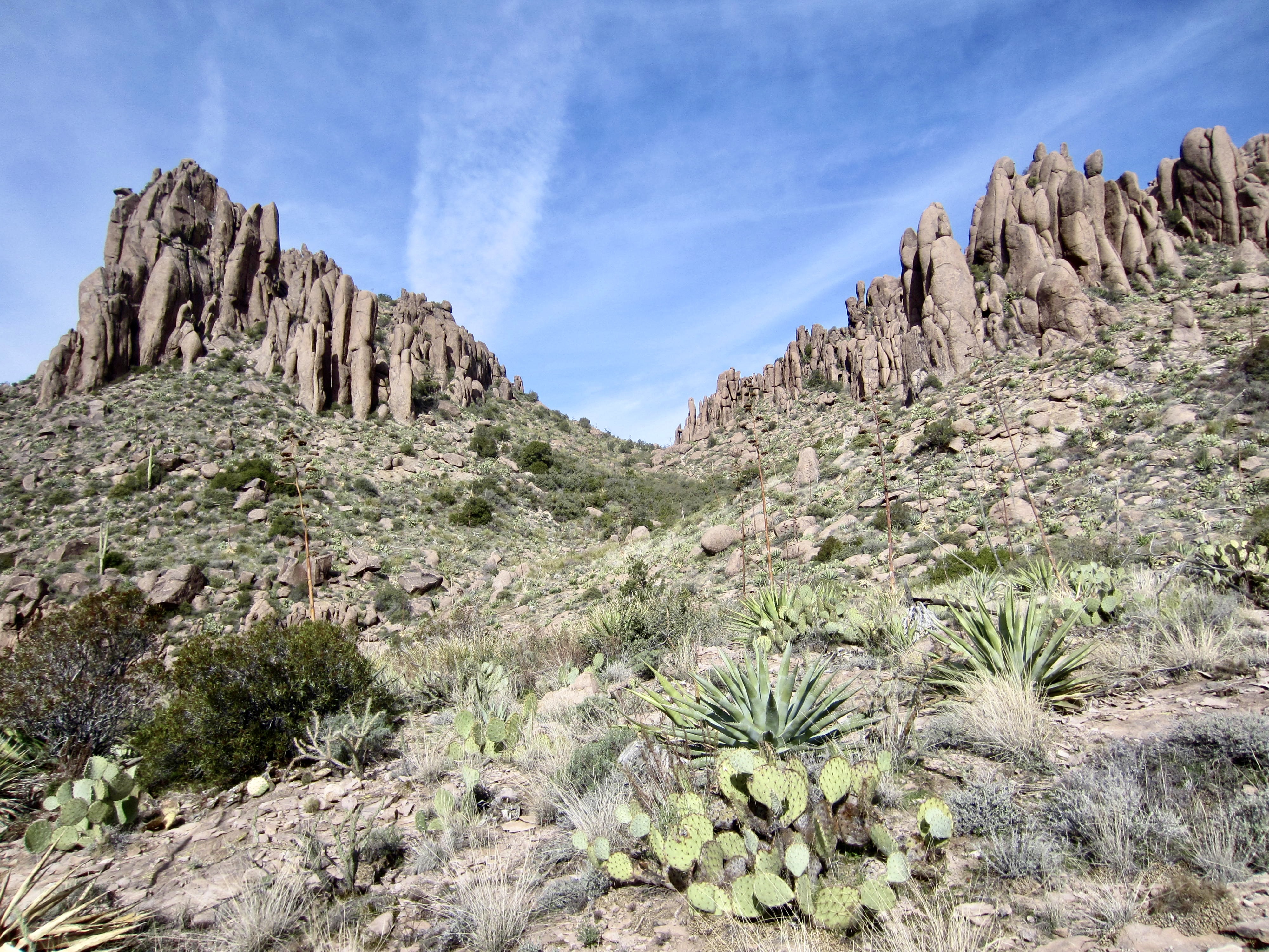 The primitive Superstition Ridge Trail runs along the entire ridge, wandering back and forth along the crest, going around deep canyons, climbing over rock outcrops, and dipping into low saddles. But don’t be misled by the word trail, because it is more of a desert high route. There are enough sketchy areas, side paths, and scrambly sections to keep you on your toes. Fortunately, most of the route is well-marked with ducks, cairns, and painted arrows, so route-finding is generally not too difficult. Nonetheless, a brief moment of inattention could quickly send you wayward. Even when carefully staying on trail, there are countless chollas and yuccas reaching out for your legs, so full-length canvas trousers would not be your worst garment choice.