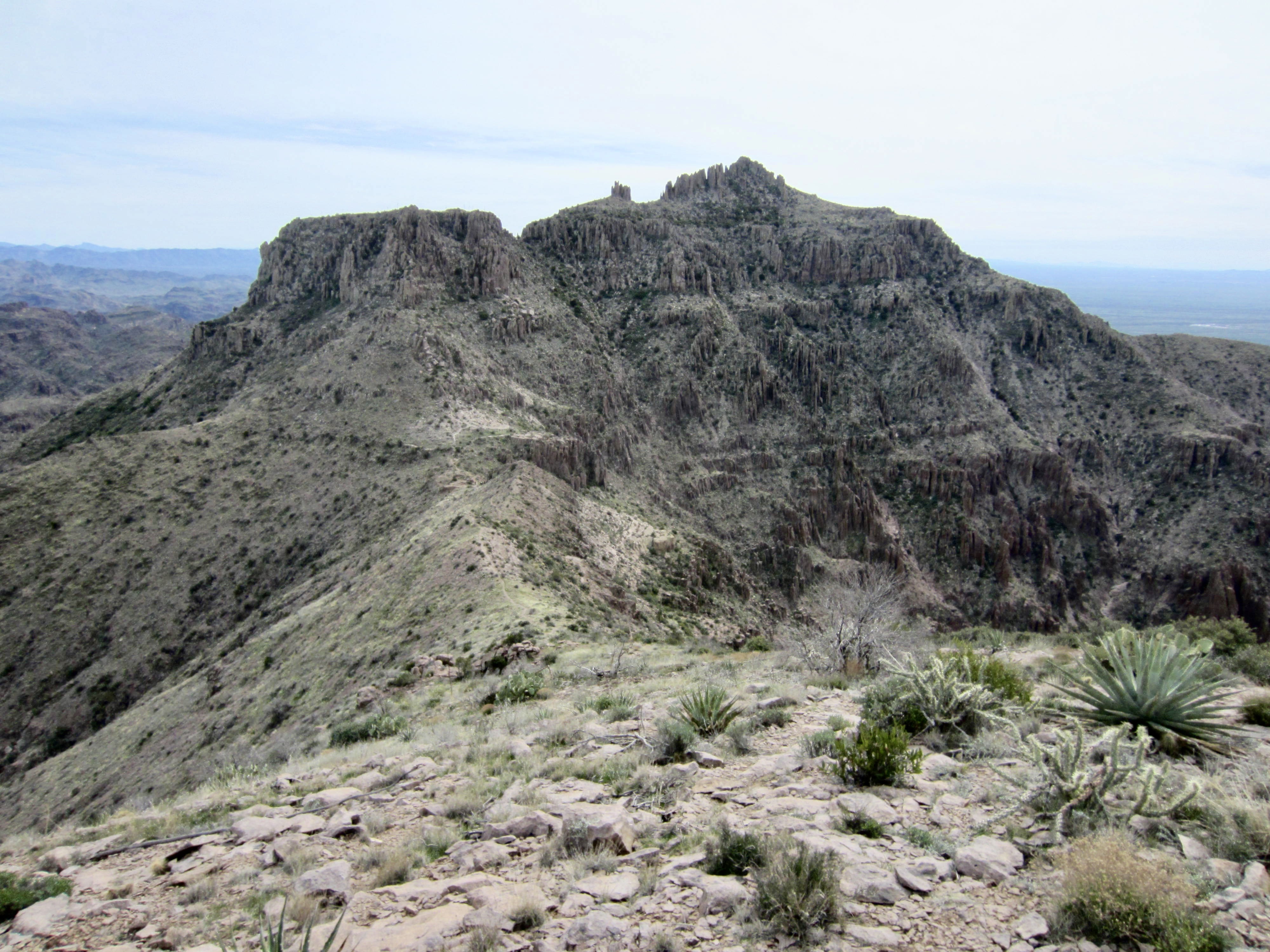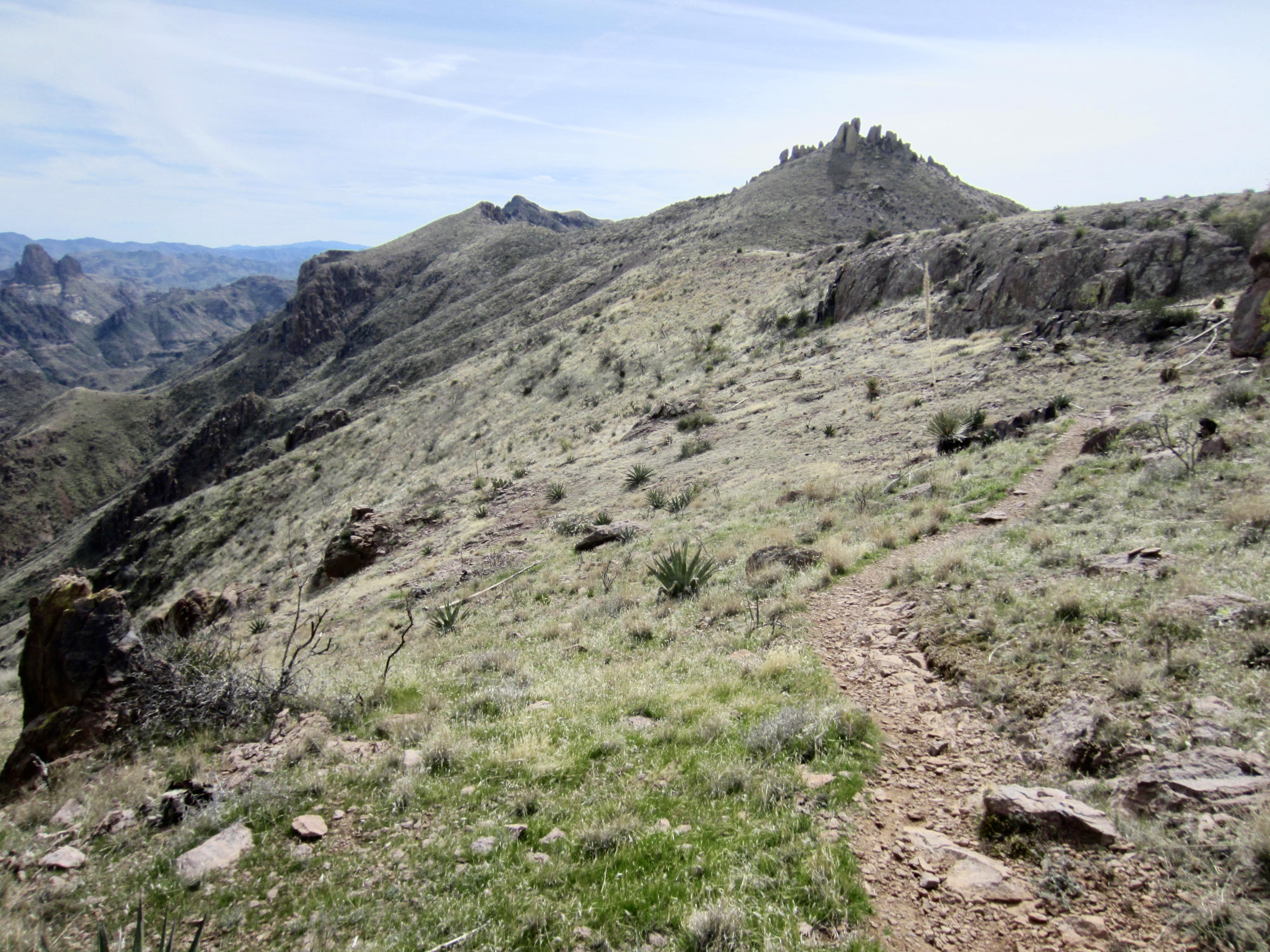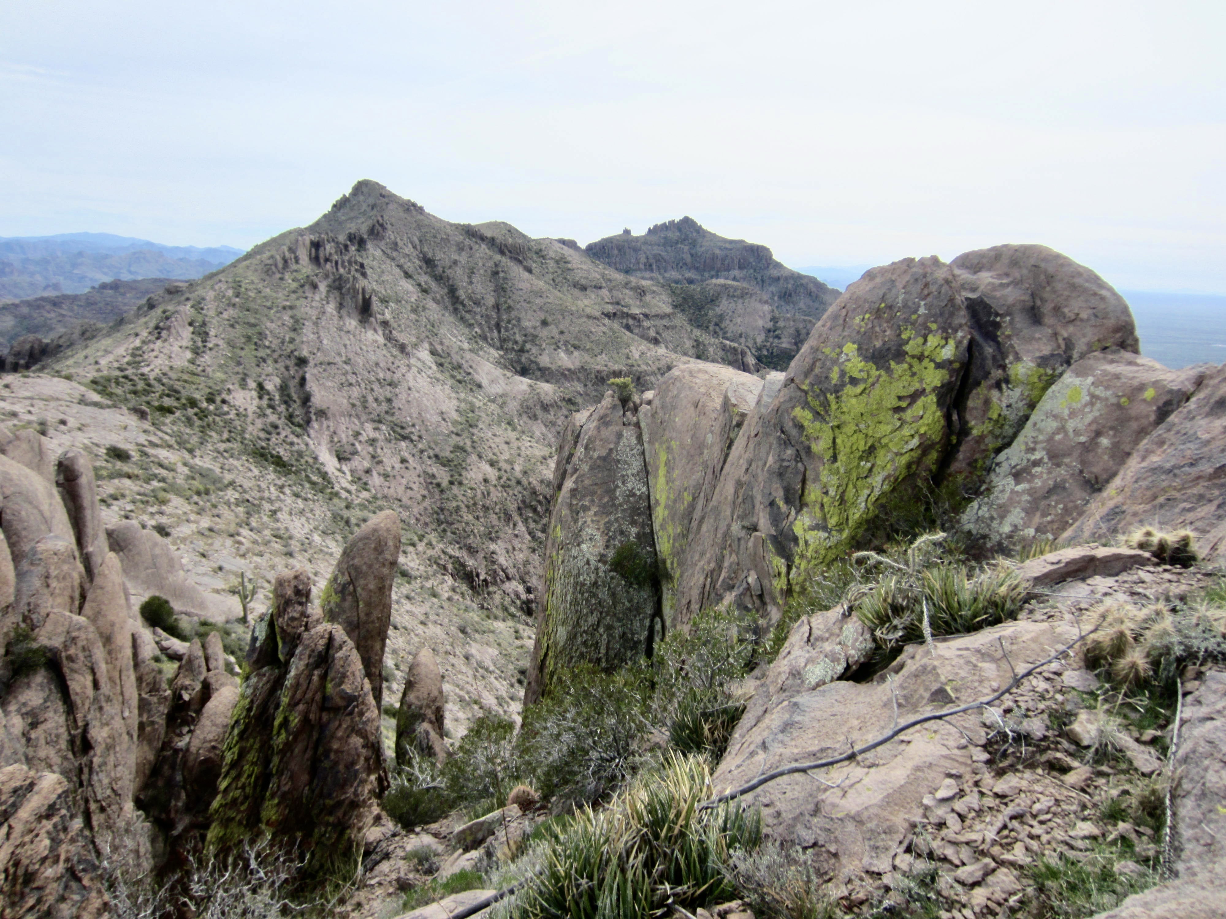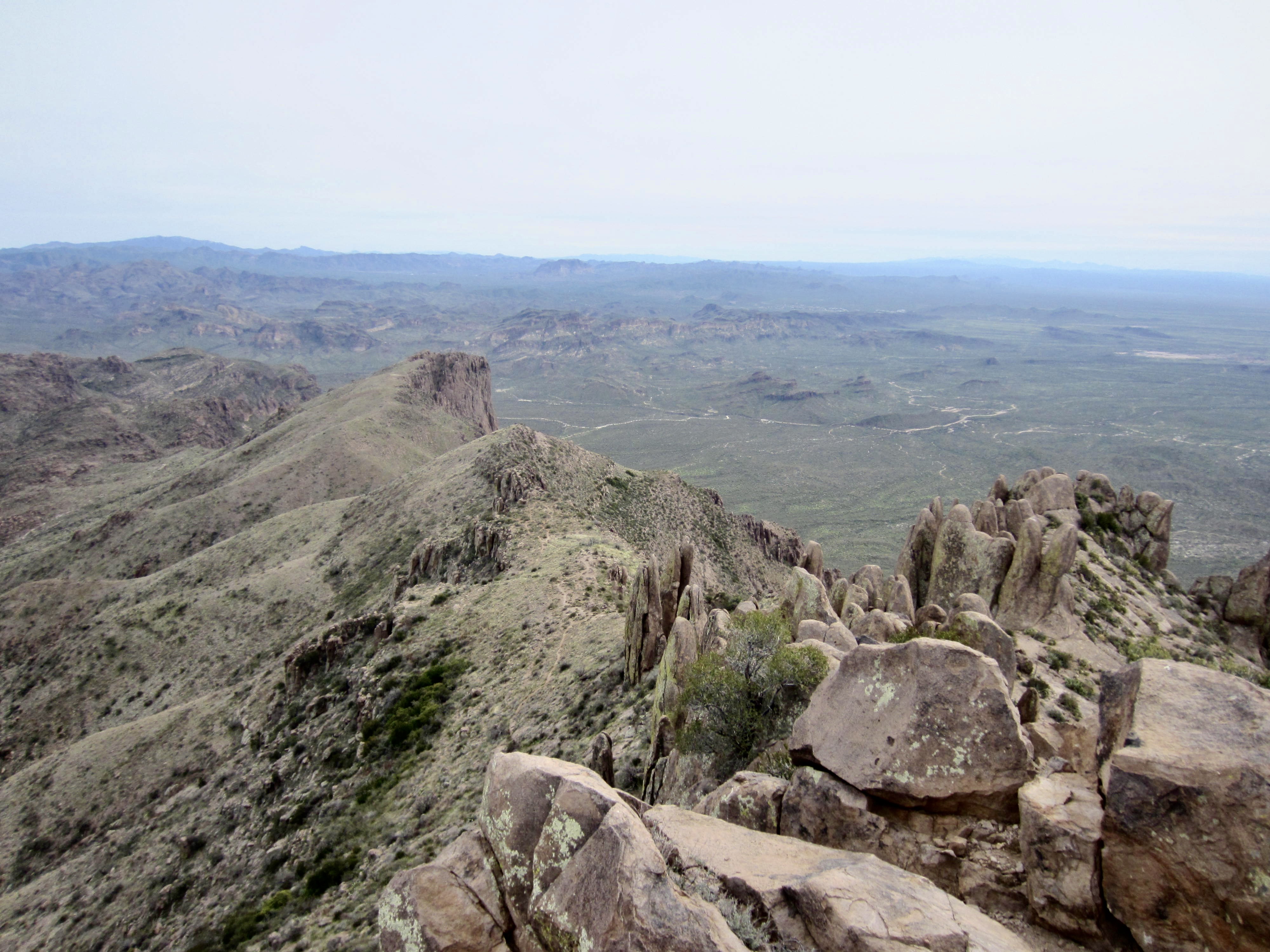 After making a wide swing around the head of a deep canyon, I dropped into West Superstition Gap. This 4200-foot saddle is one of several notable low points in the ridge crest, and it roughly marks the one-third point in the full traverse. As you descend into the gap and back up the other side, there are several rocky outcrops that require a bit of Class 2 scrambling.