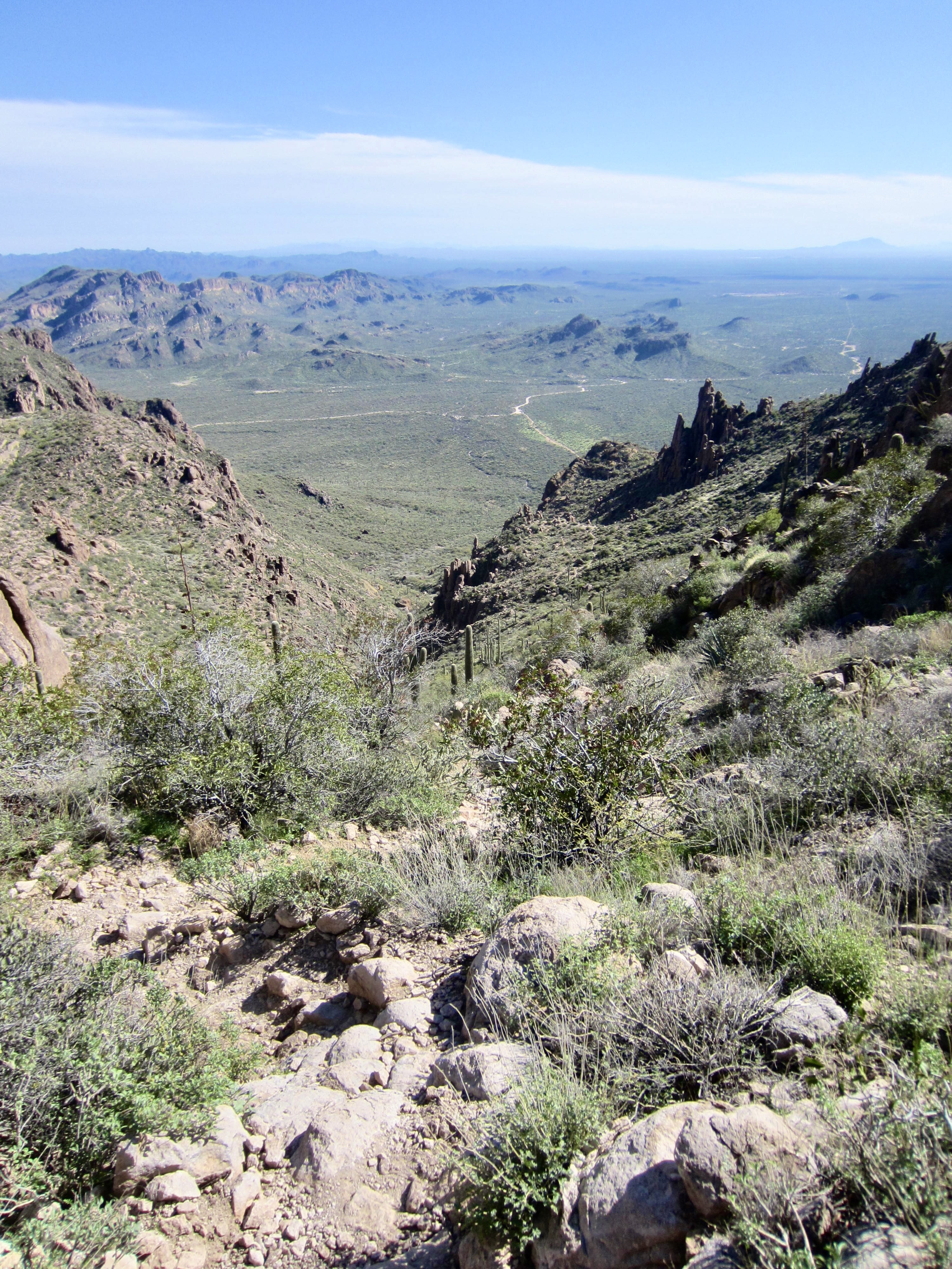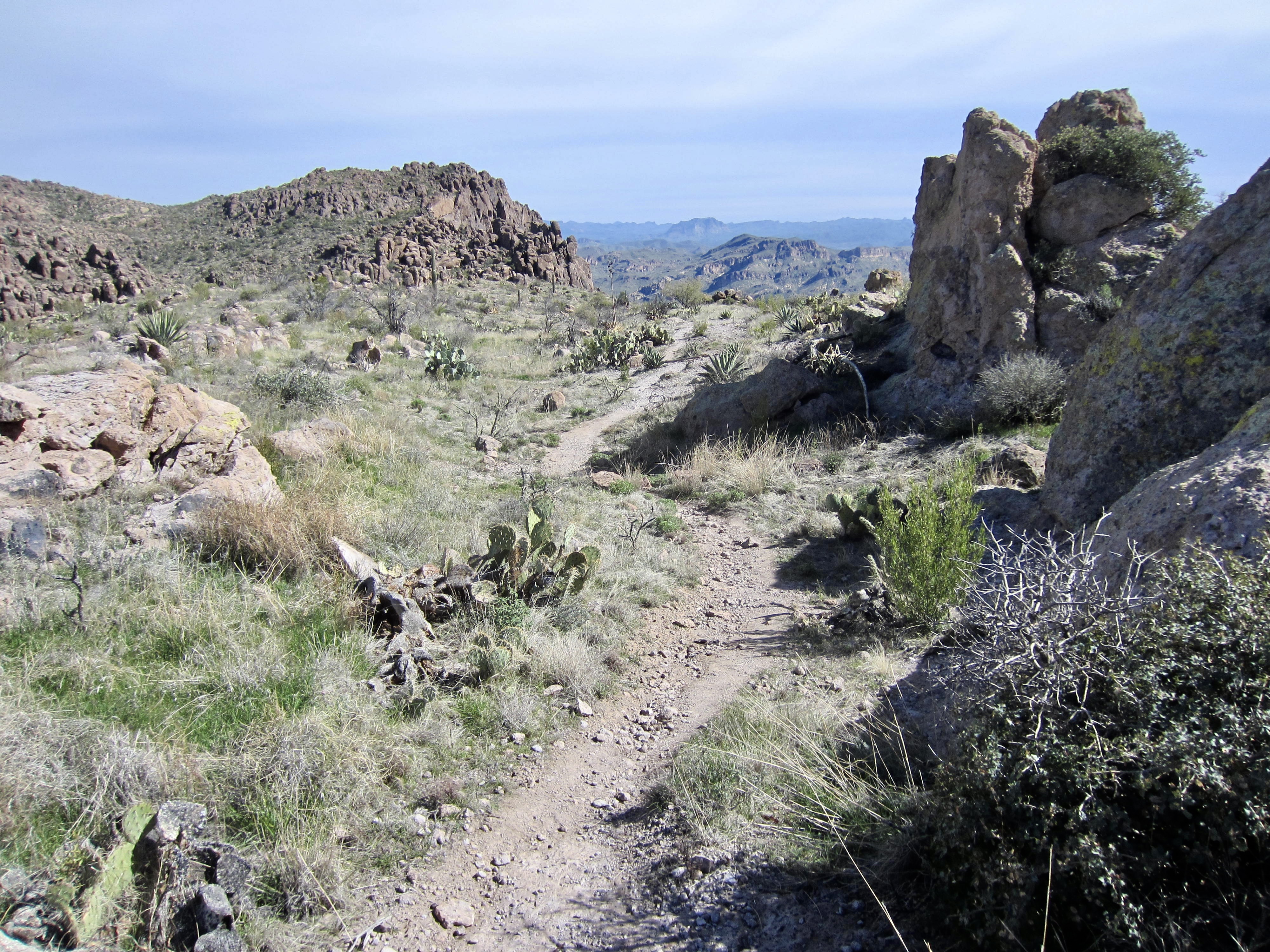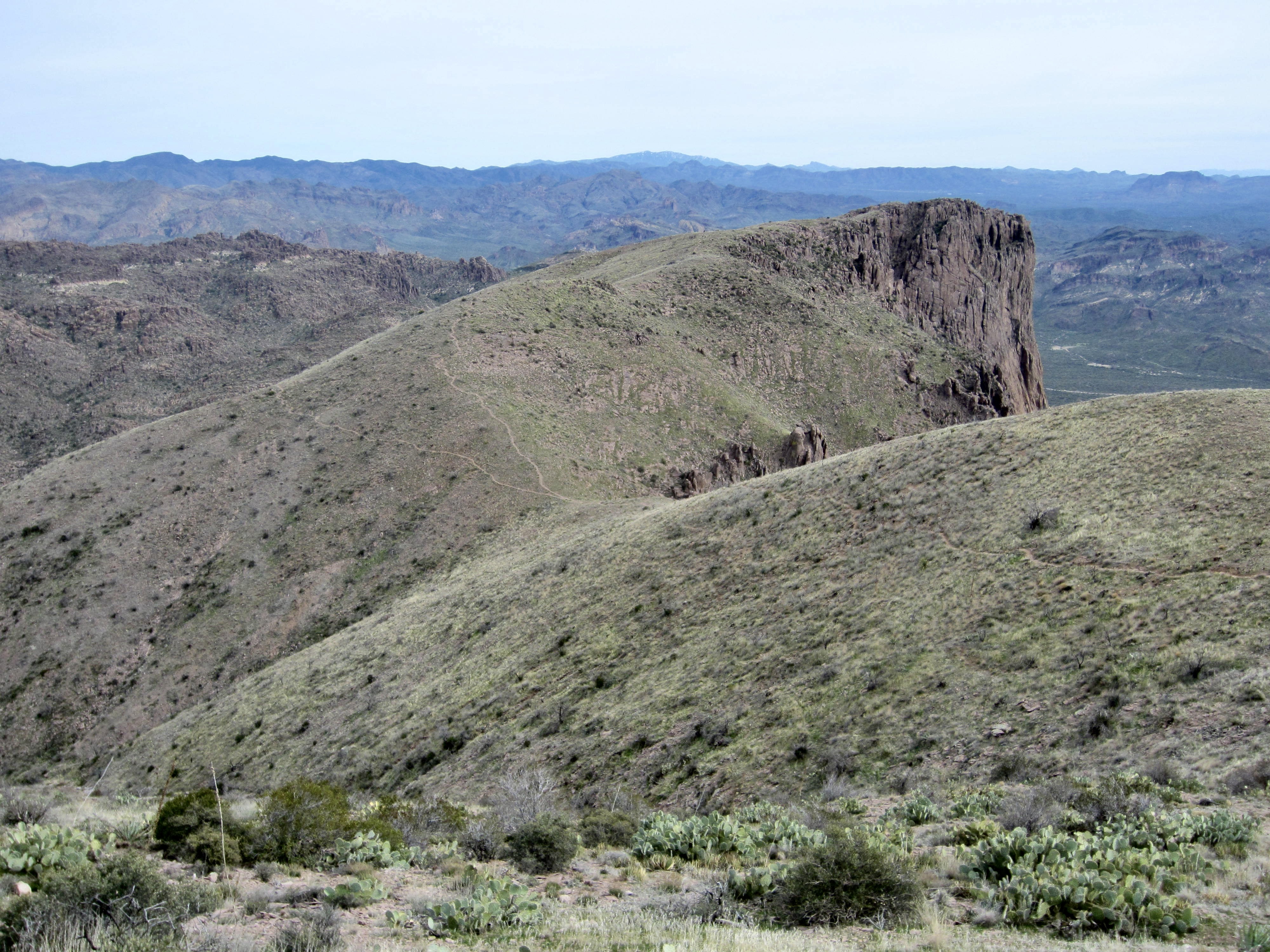 I quickly retraced my route back to the trail junction, completing a 30-minute round trip to the summit, and then continued hiking down the ridge. Following good trail, I dropped into East Superstition Gap, a broad 4200-foot saddle that roughly marks the two-thirds point of the full traverse. The backward view of Superstition Peak is particularly striking from this part of the trail. The northerly view is dominated by Weavers Needle and Four Peaks Mountain.