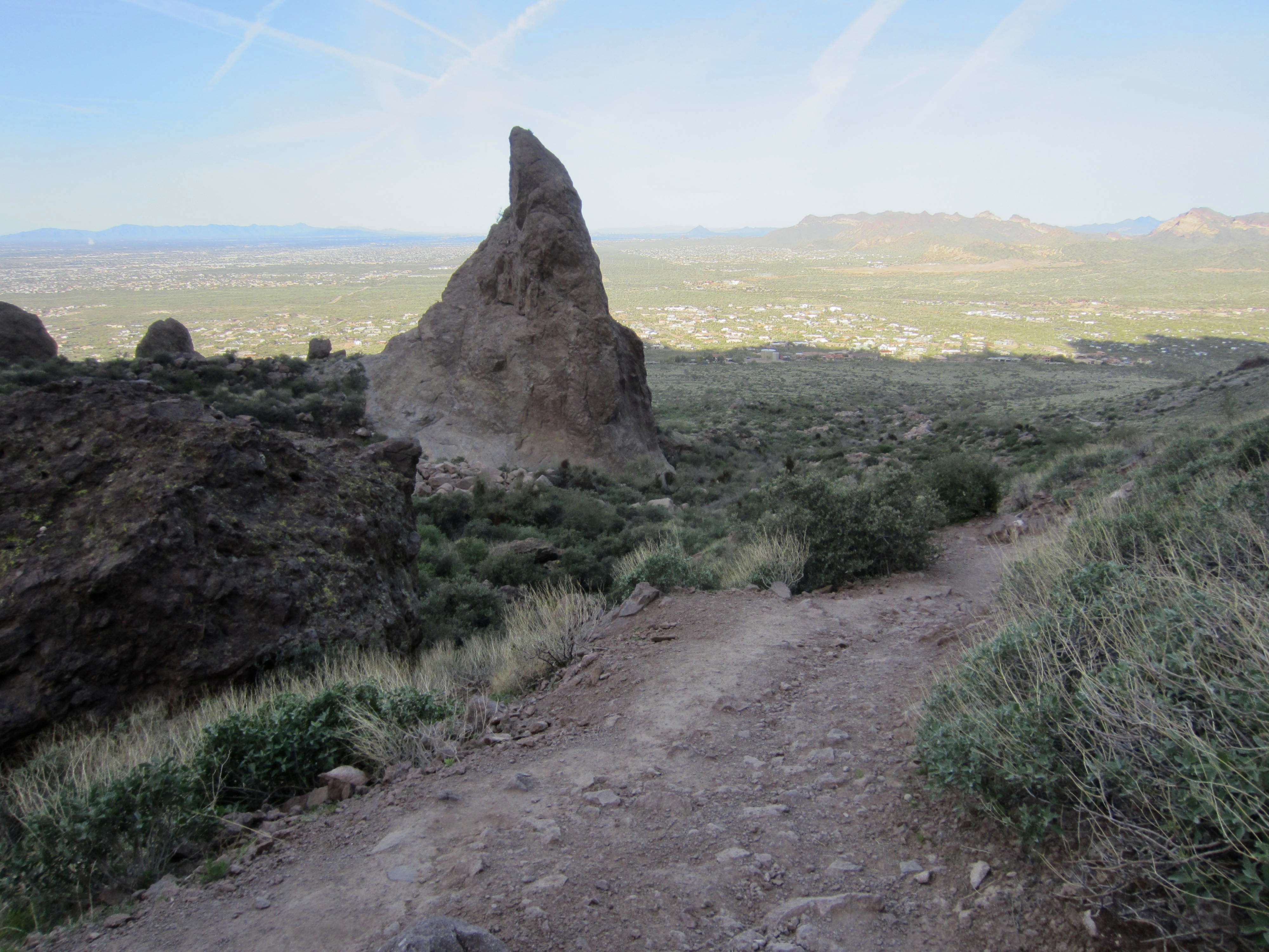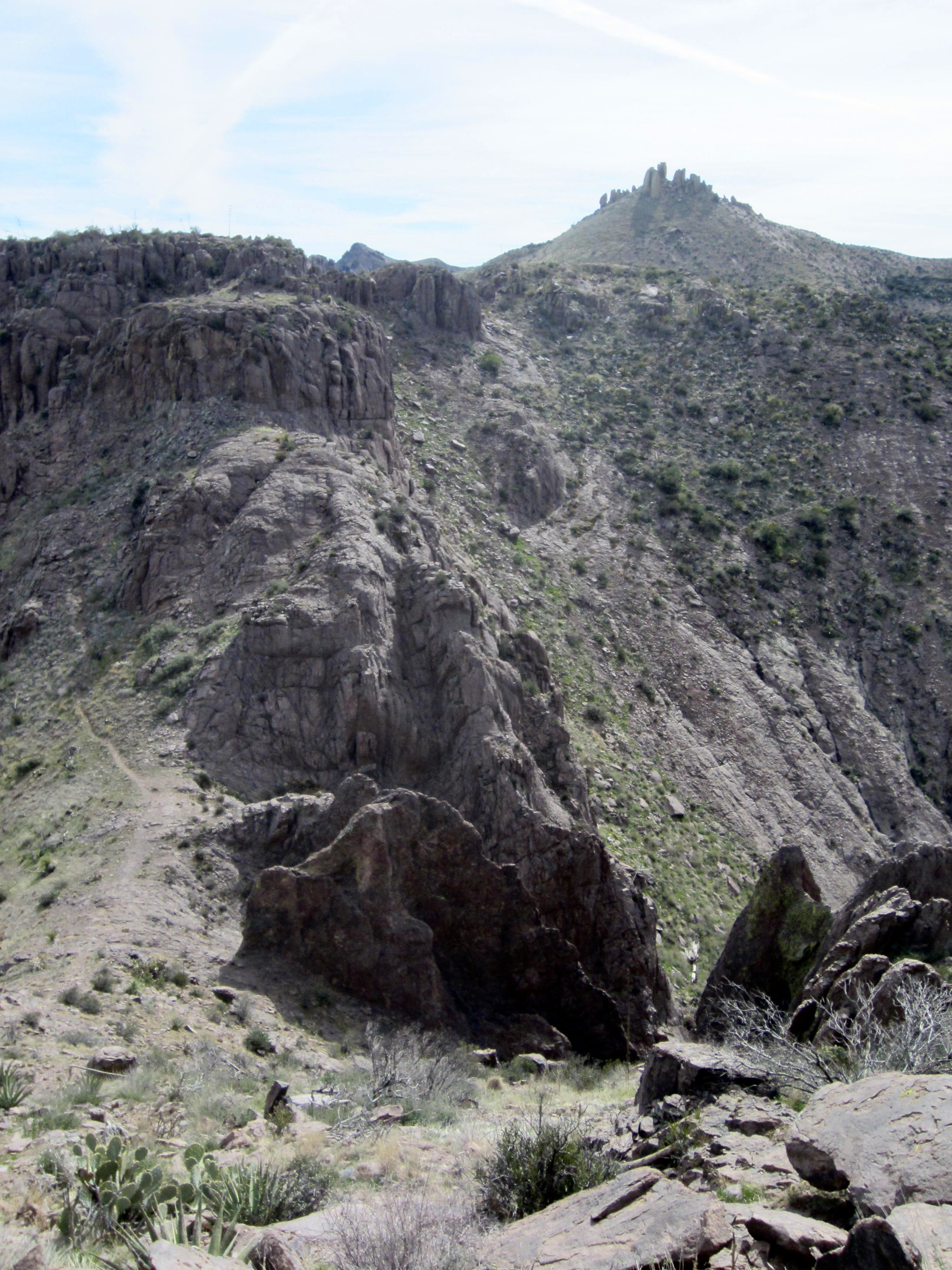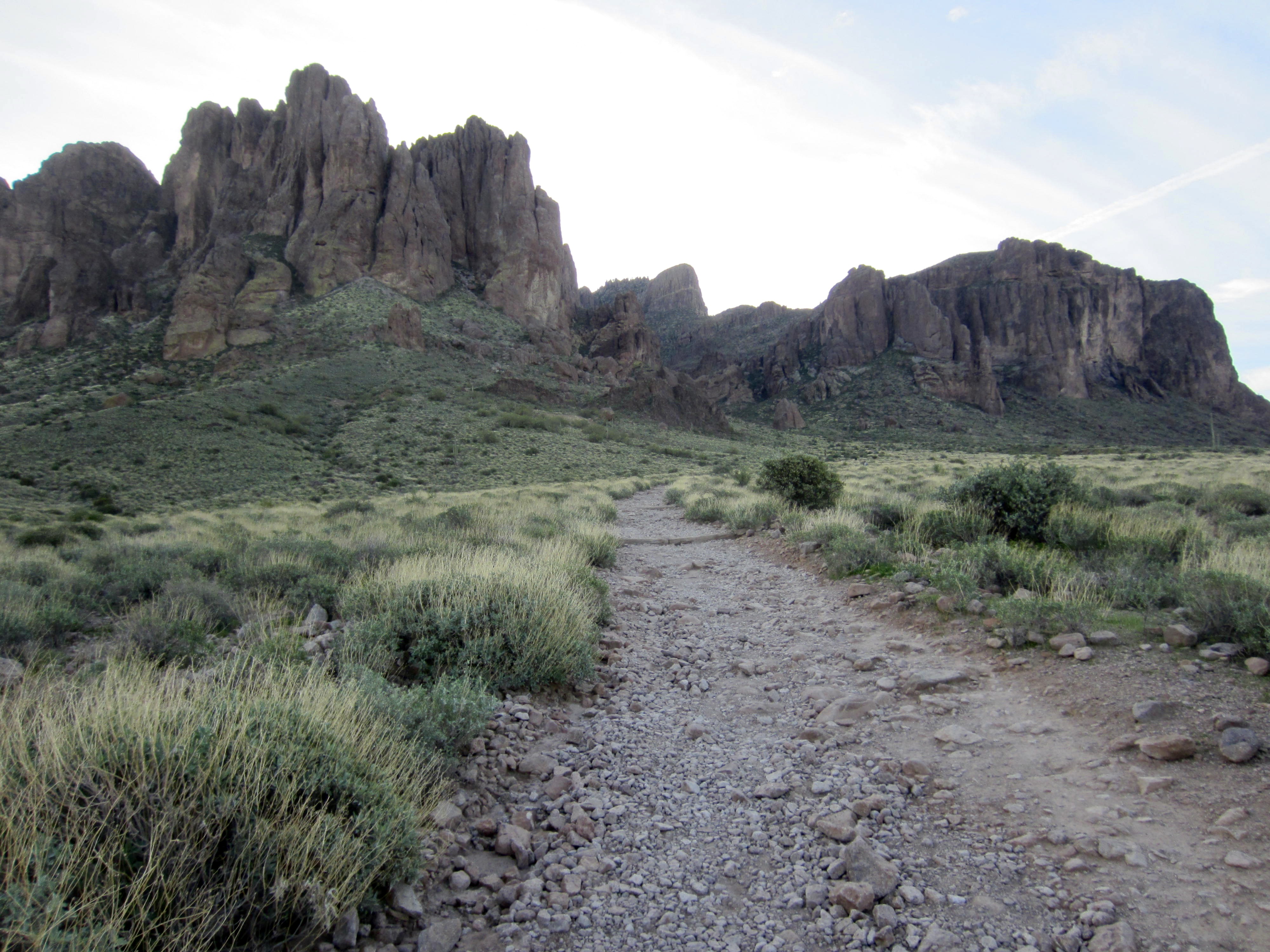 The dauntingly steep and deeply creviced ramparts of the Superstition Mountains rose up directly in front of me. Various geomorphic features, including The Praying Hands, Thumb Rock, and—most famous of all—The Flatiron, were visible from the trail.
