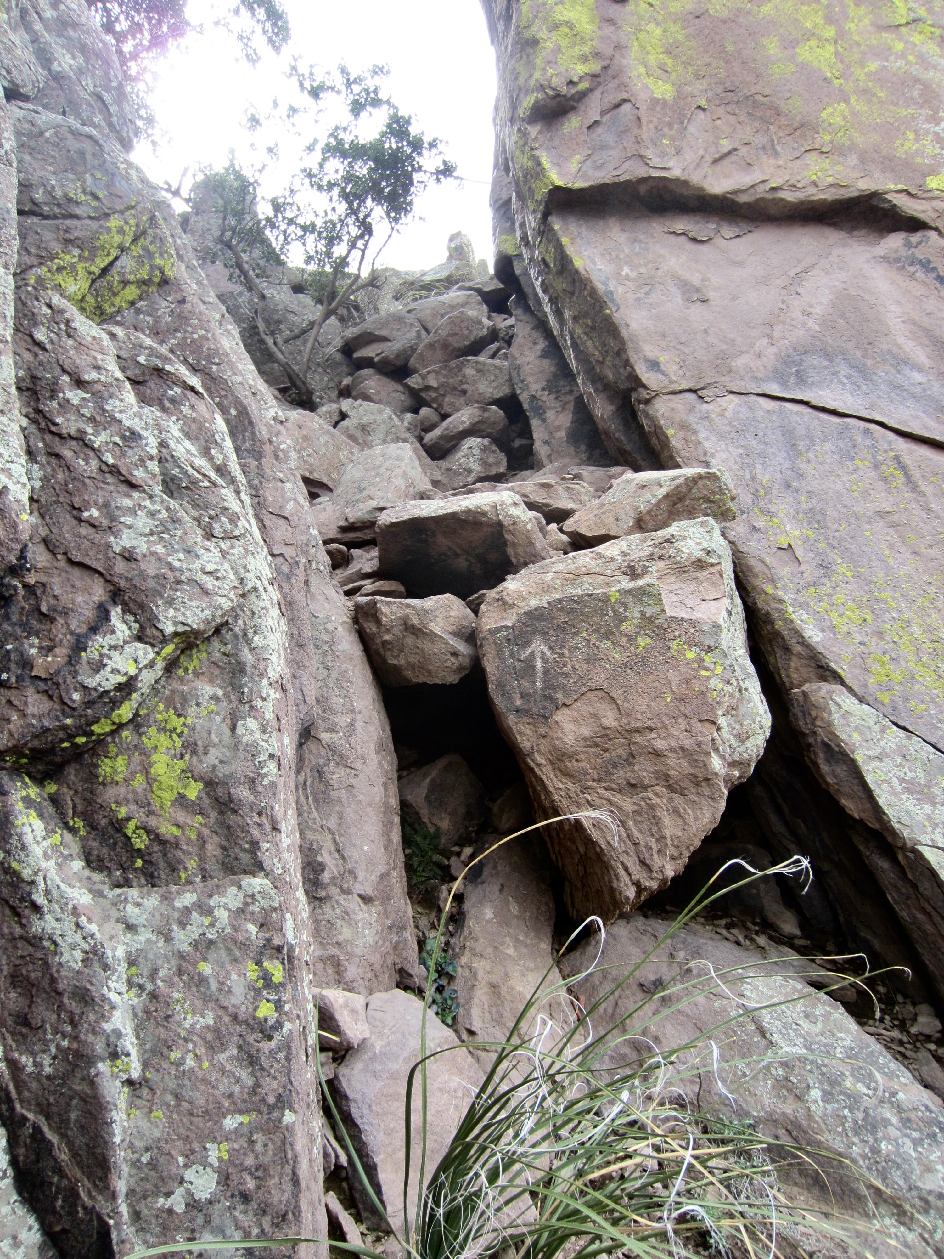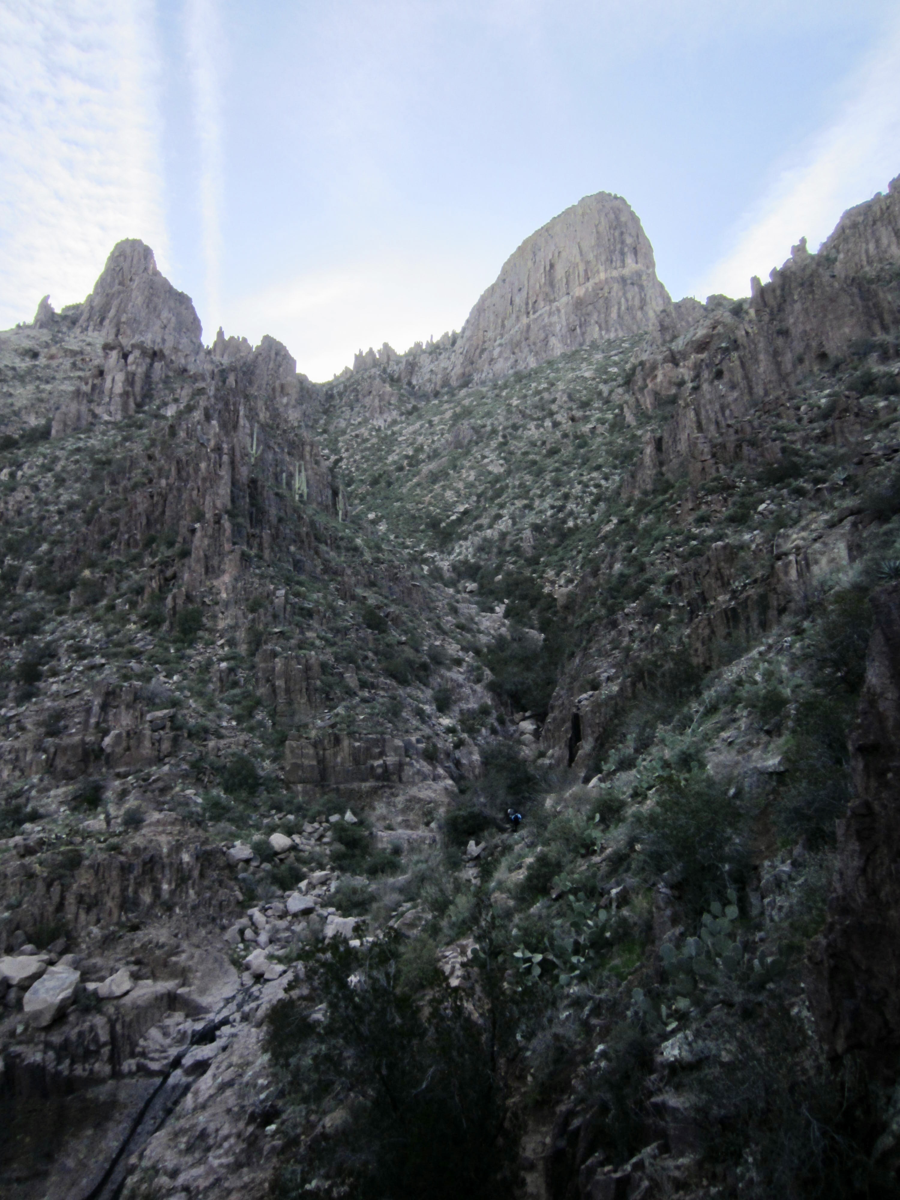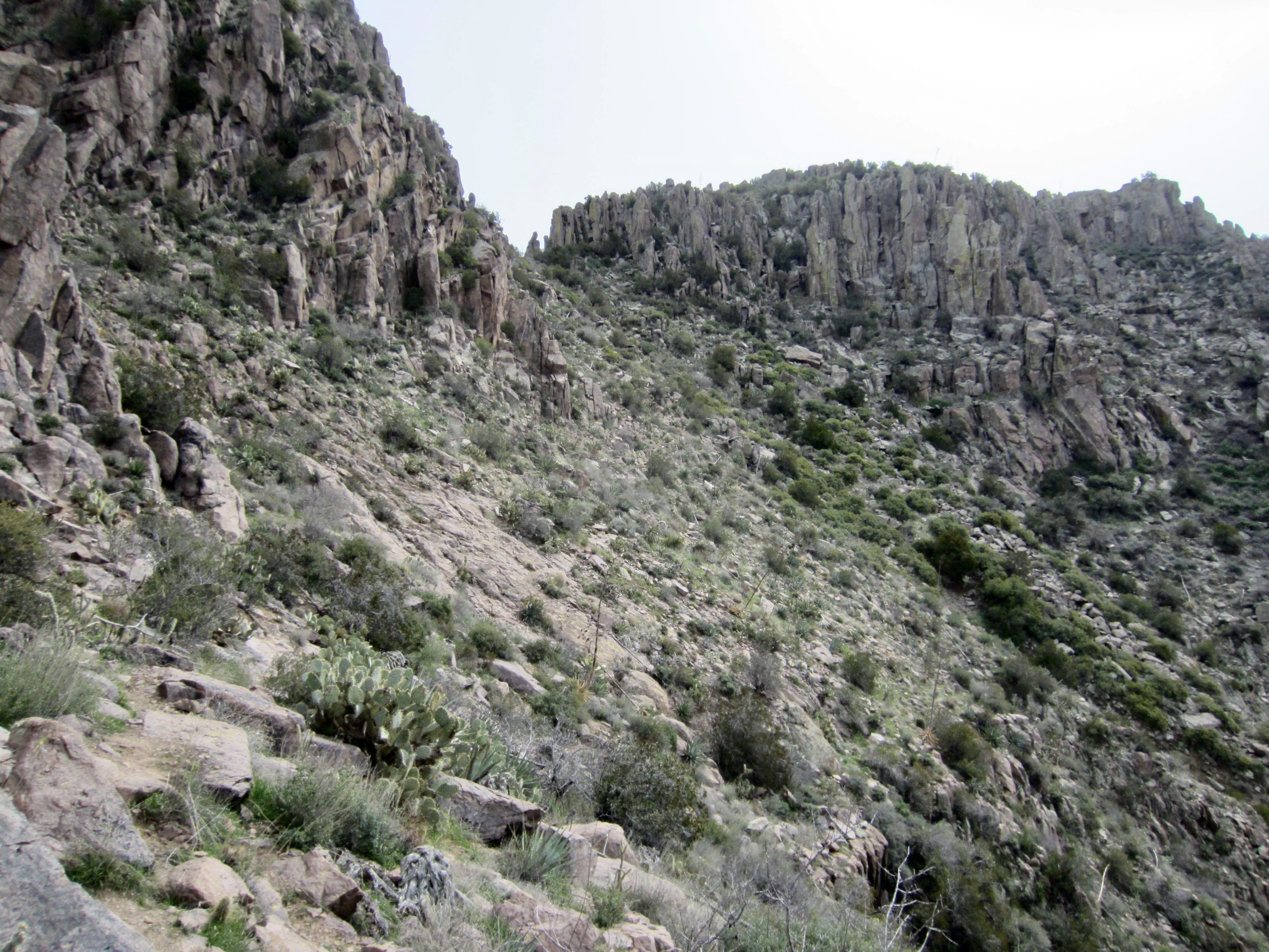 There are three trails leading out of Hieroglyphic Gap, in addition to the one that drops straight down the canyon. I chose the middle trail, which heads directly up the ridge crest and then veers rightward around the southwestern side of Point 4790. This trail becomes very hard to follow in some places as it traverses the hillside, but it ultimately leads to a 4700-foot saddle between Point 4790 and Superstition Peak. Upon arriving at the saddle, I mistakenly crossed over to the other side but quickly encountered vertical cliffs. I backtracked to the saddle and discovered that the correct route ascends a narrow, bouldery slot. It initially looked like a Class 4 climb, but the presence of excellent handholds make it a straightforward Class 3 scramble.