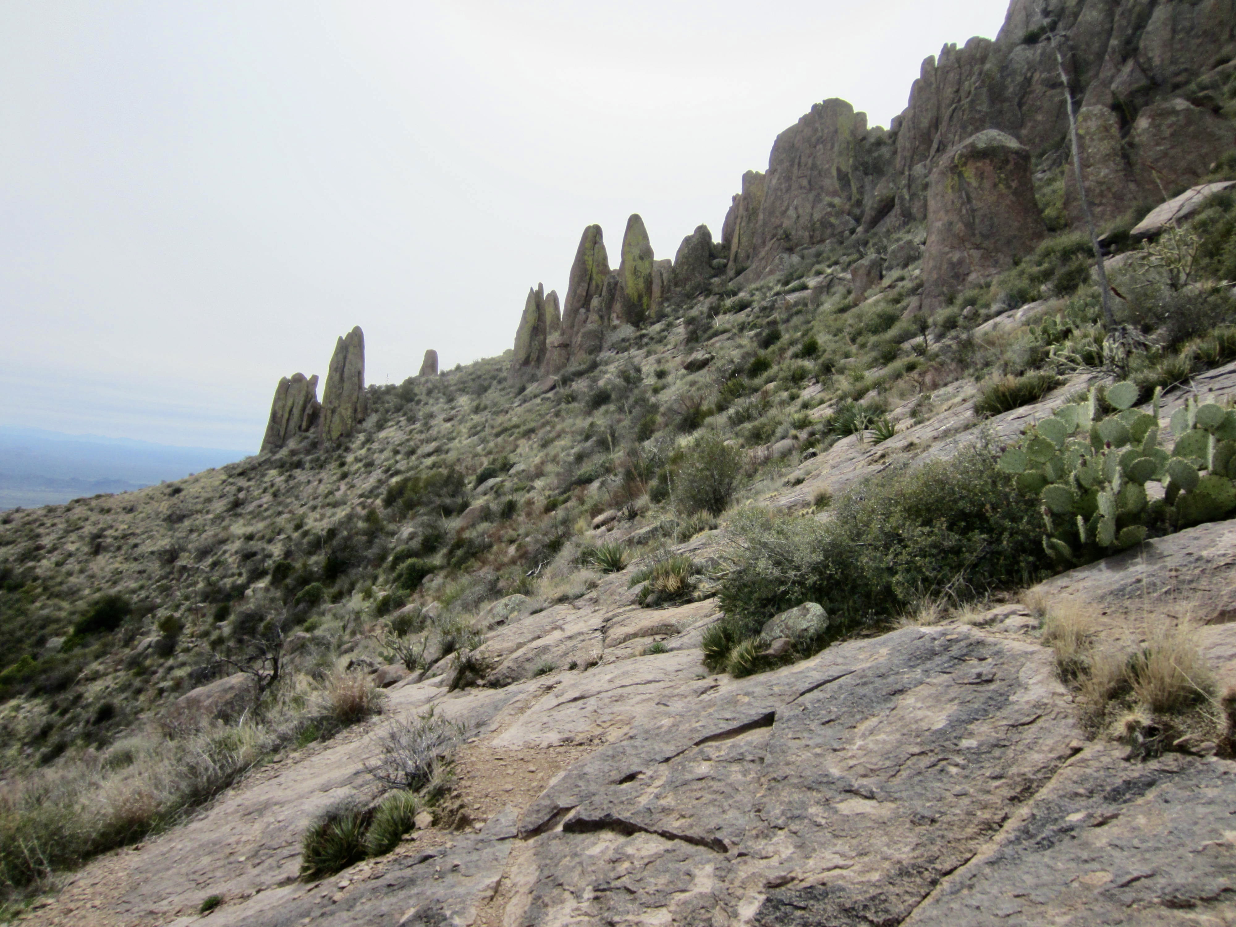 Above the Class 3 slot, a good trail leads up the rounded crest and over a broad shoulder on Superstition Peak’s north ridge. This trail ducks through a high notch and then traverses around the eastern face of the peak. Before long, I arrived at junction on the peak’s southeast ridge (5.4 hours + 7.6 miles + 4100 feet from starting point).