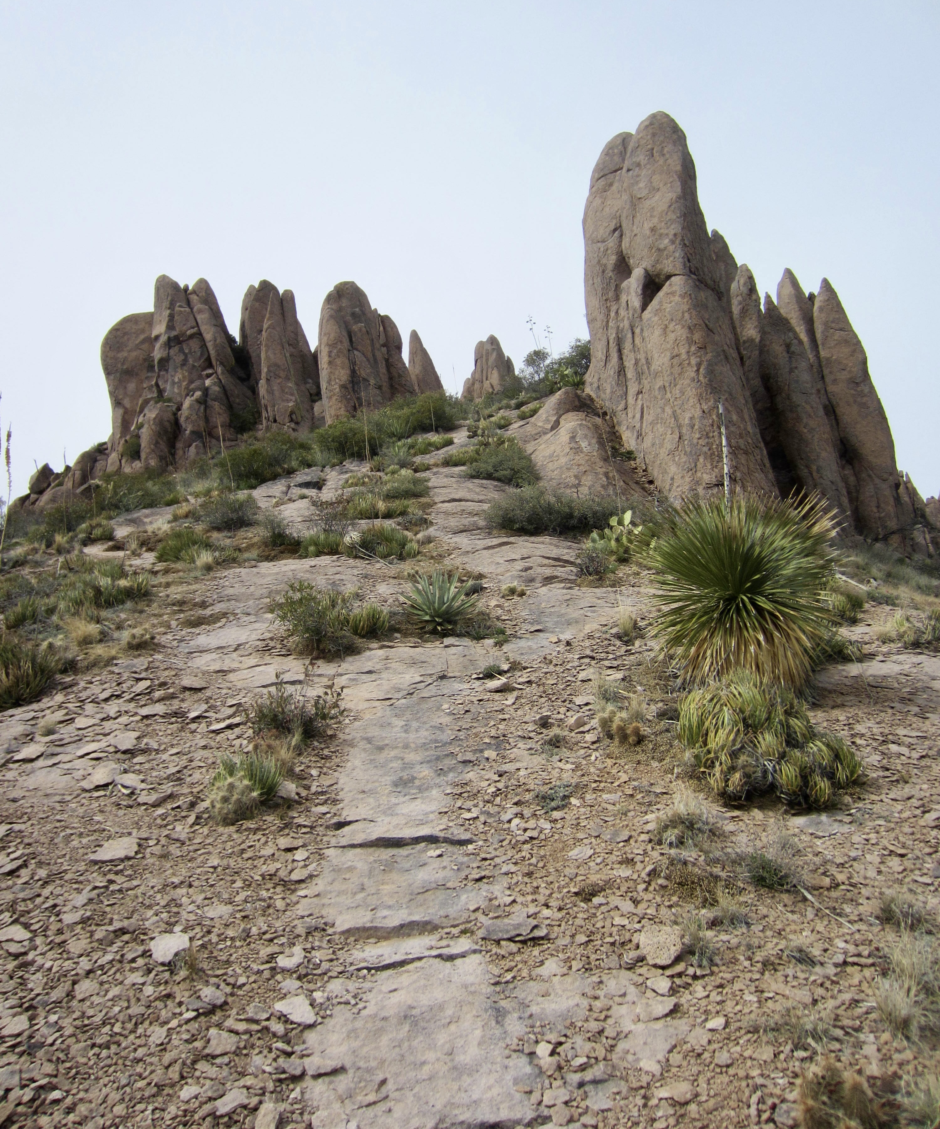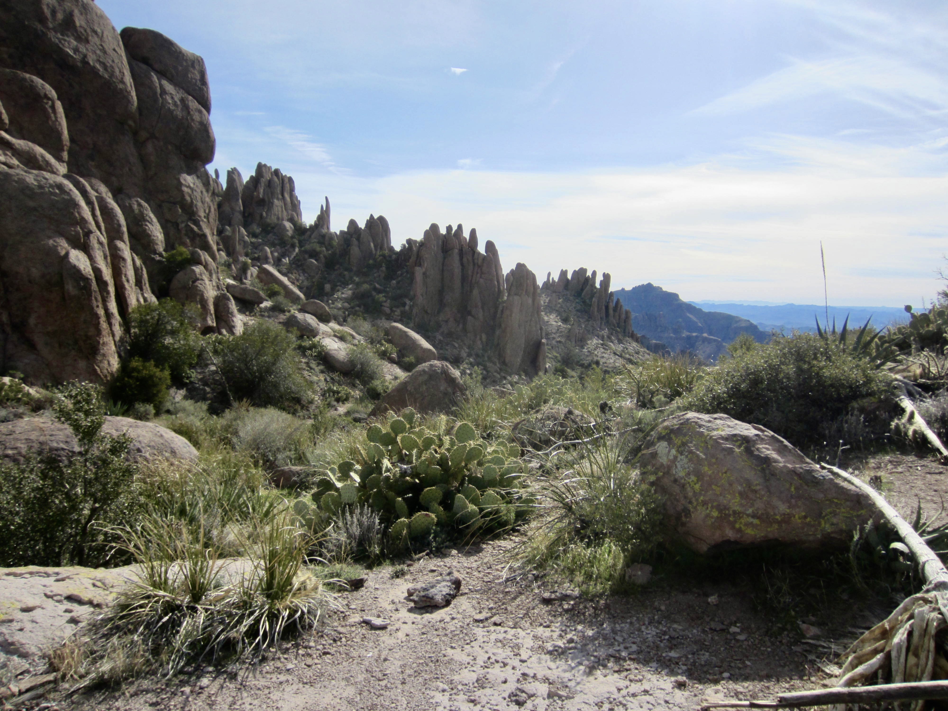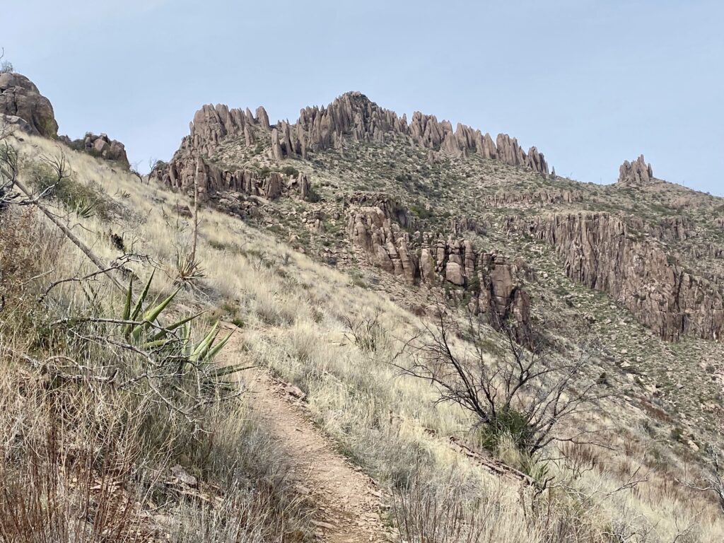 As I headed southeast from Siphon Pass, I was treated to a variety of geologic delights. The weather was very foggy when Eileen and I did this part of the traverse four years ago, but today’s clear weather allowed me to see what we’d missed. There were hundreds of stone hoodoos above the trail, and dramatic canyons below it. Best of all was the view of Superstition Peak, acting like a beacon at the southeastern end of the ridge.
