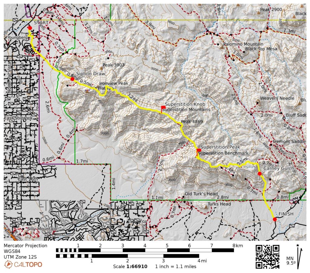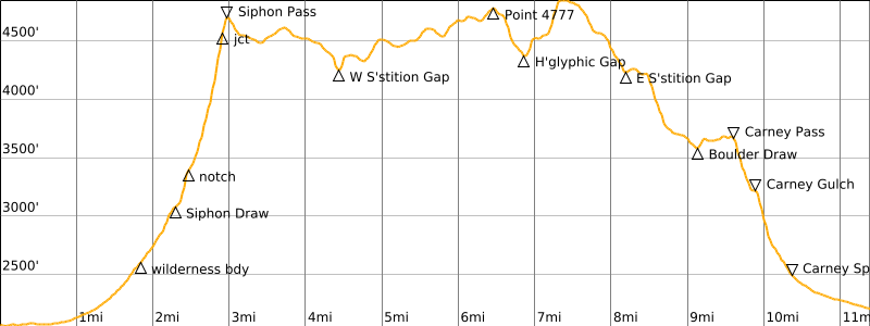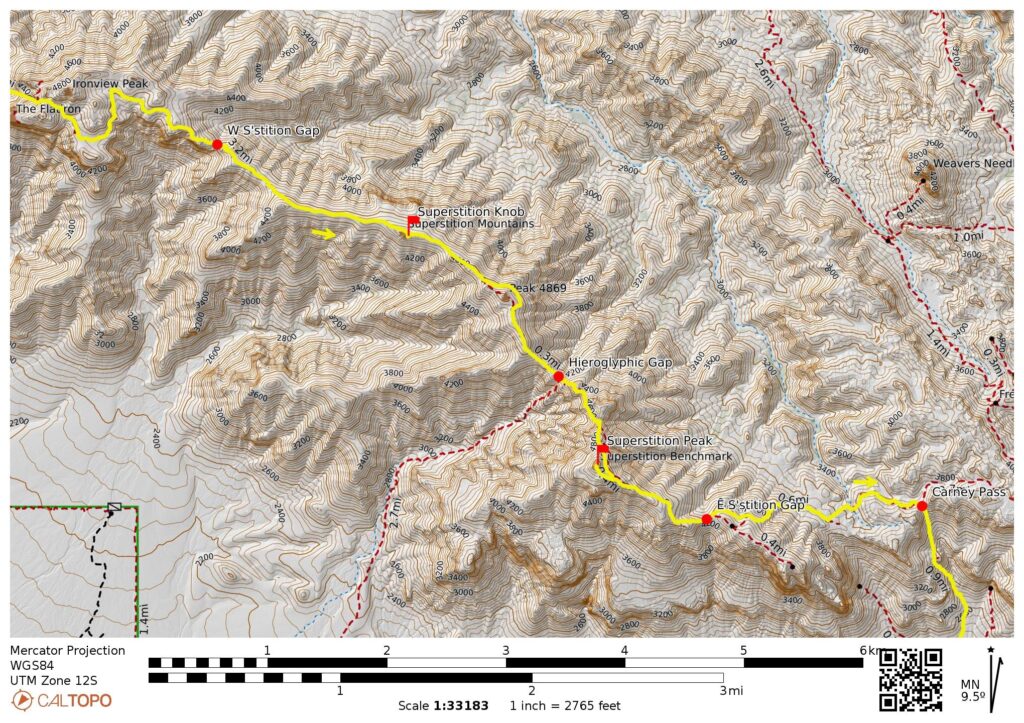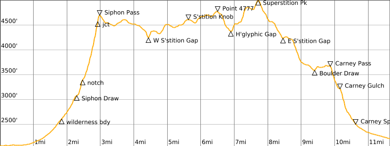 Way Points: Siphon Draw Trailhead & Superstition Wilderness boundary & Siphon Draw Basin & Siphon Notch & Siphon Rim & Siphon Pass & West Superstition Gap & Point 4402 & Saddle 4453 & Saddle 4517 & Point 4869 & Point 4777 & Hieroglyphic Gap & Superstition Peak shoulder & Summit Trail junction & East Superstition Gap & Boulder Draw & Carney Pass & Carney Gulch shoulder & Carney Spring & Superstition Wilderness boundary & Carney Springs Trailhead (trail hike & trail scramble)