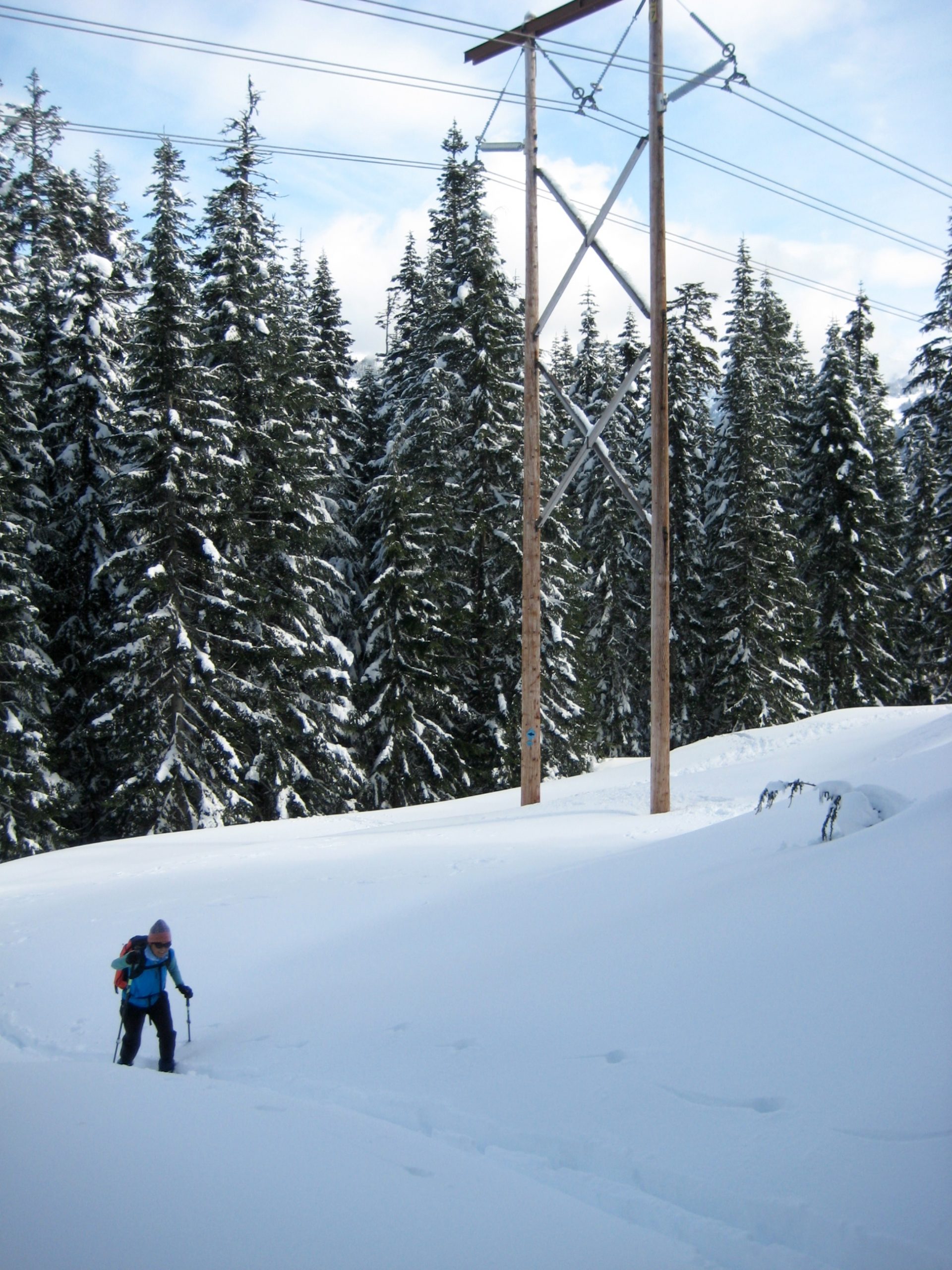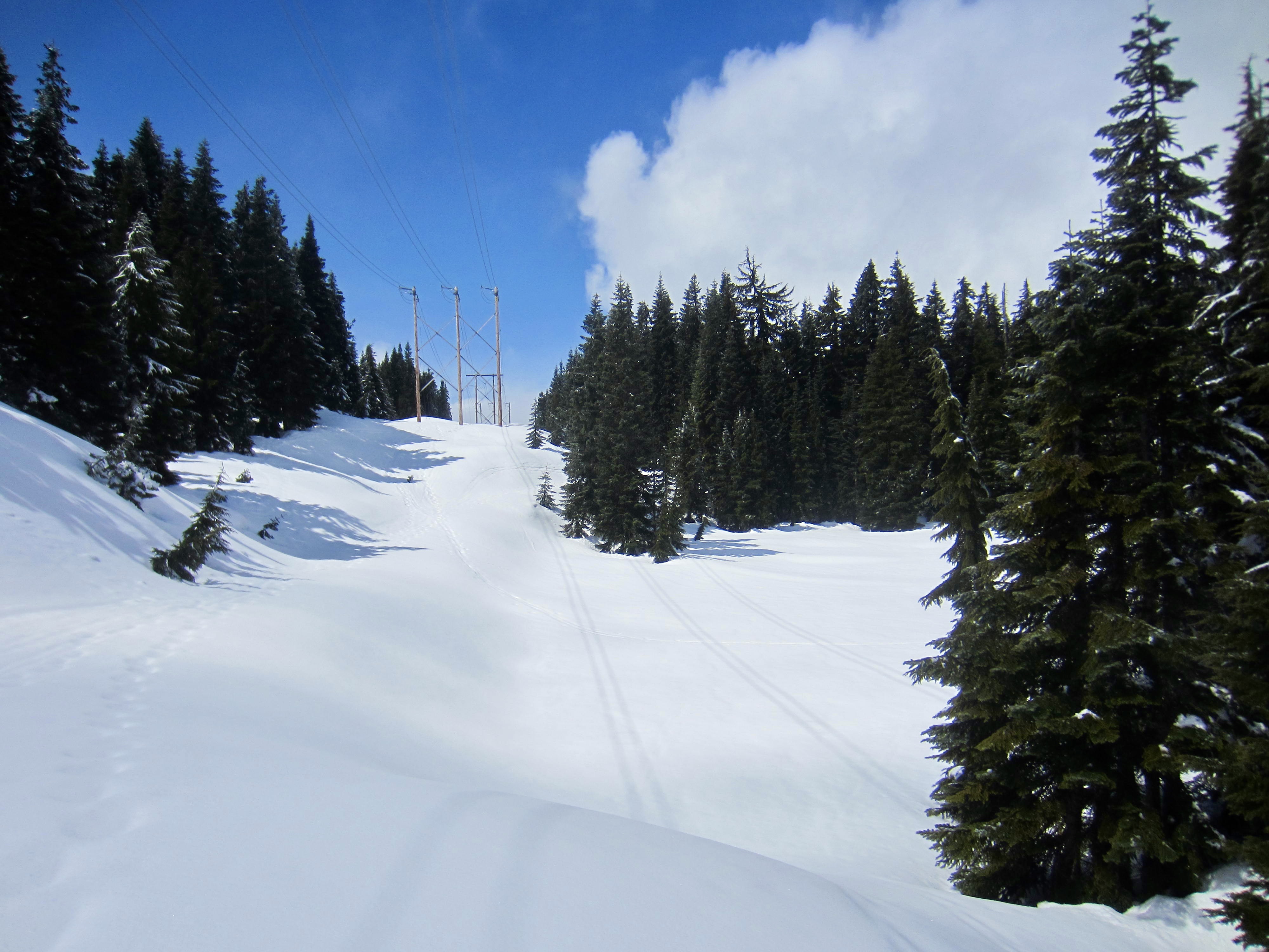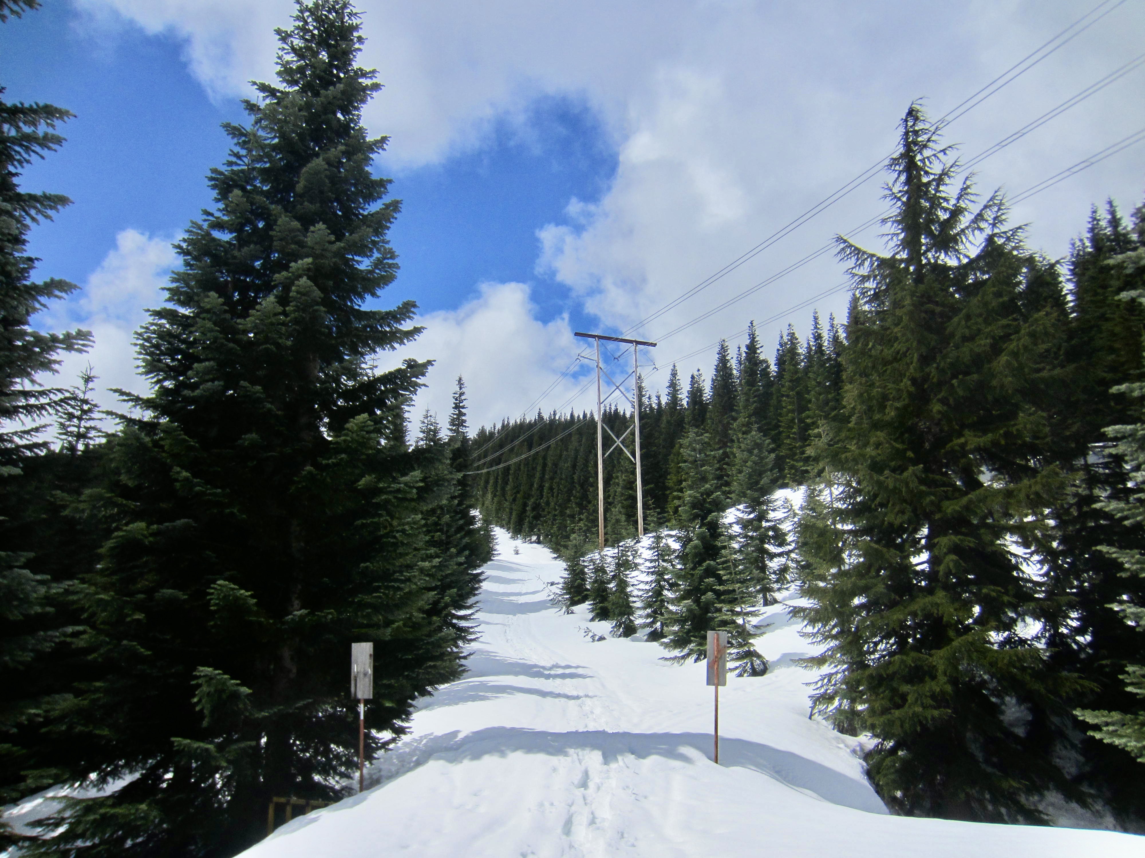 Blue diamonds will lead you on a long traverse to the south, past a huge hemlock tree. Upon encountering a switchback, designated by two or three blue diamonds placed sideways, turn right and make a long, gently rising traverse back to the west. Just before reaching Hyak Creek again, a short, steep ascent takes you up to the InterSummit-90 ski trail, which runs along a row of wooden powerline poles.