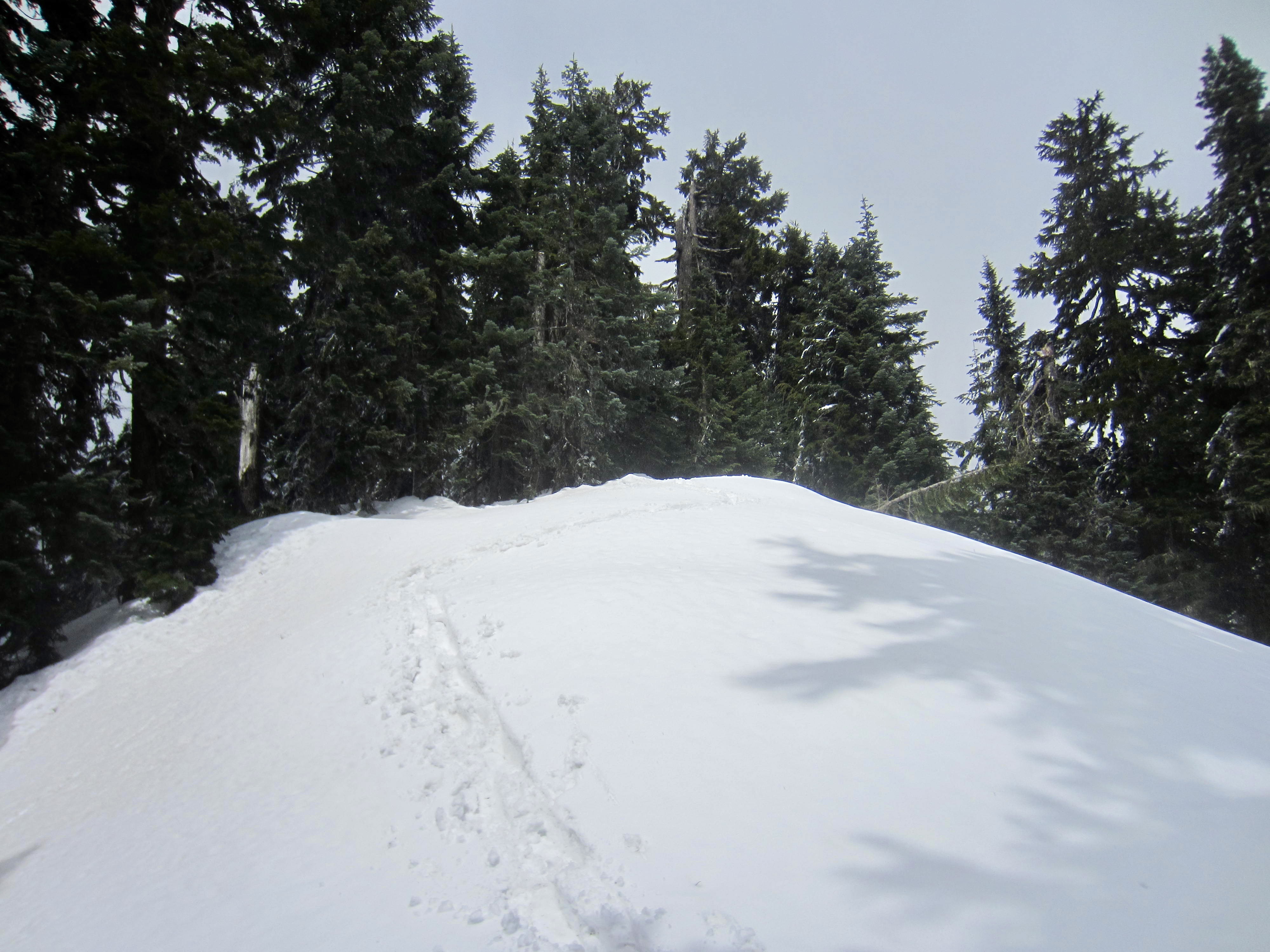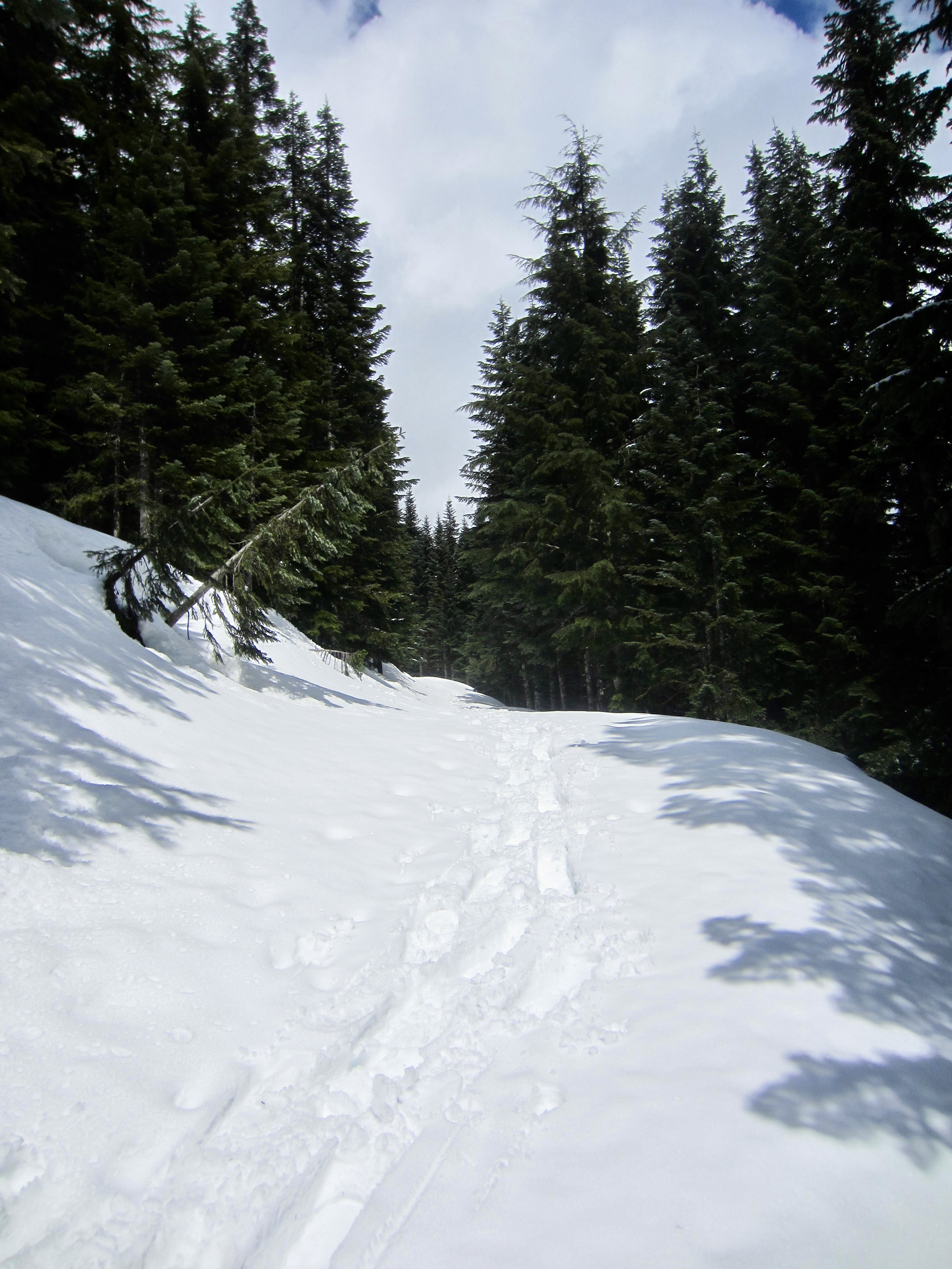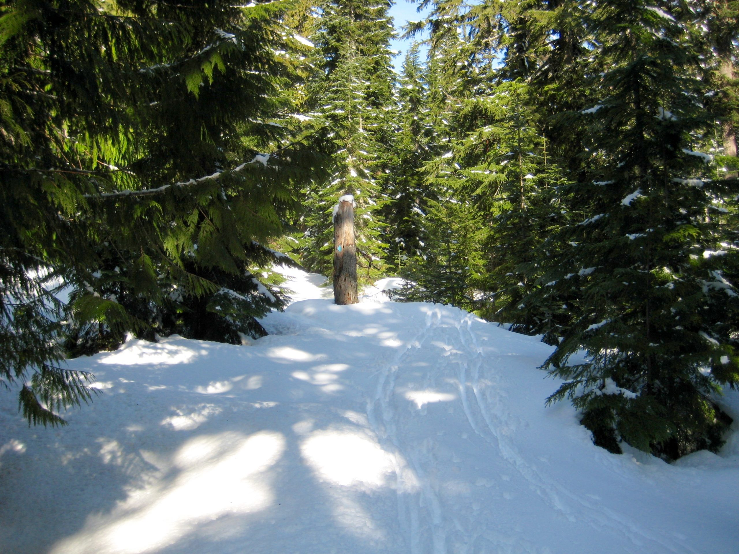 After leaving the old railroad grade, zig-zag up through the forest in a generally westward direction. Soon, you will come to a narrow road (usually grooomed). This is the Lower Crossover ski trail that connects Summit East with Silver Fir Outpost. Look for blue diamonds across the road and keep going.