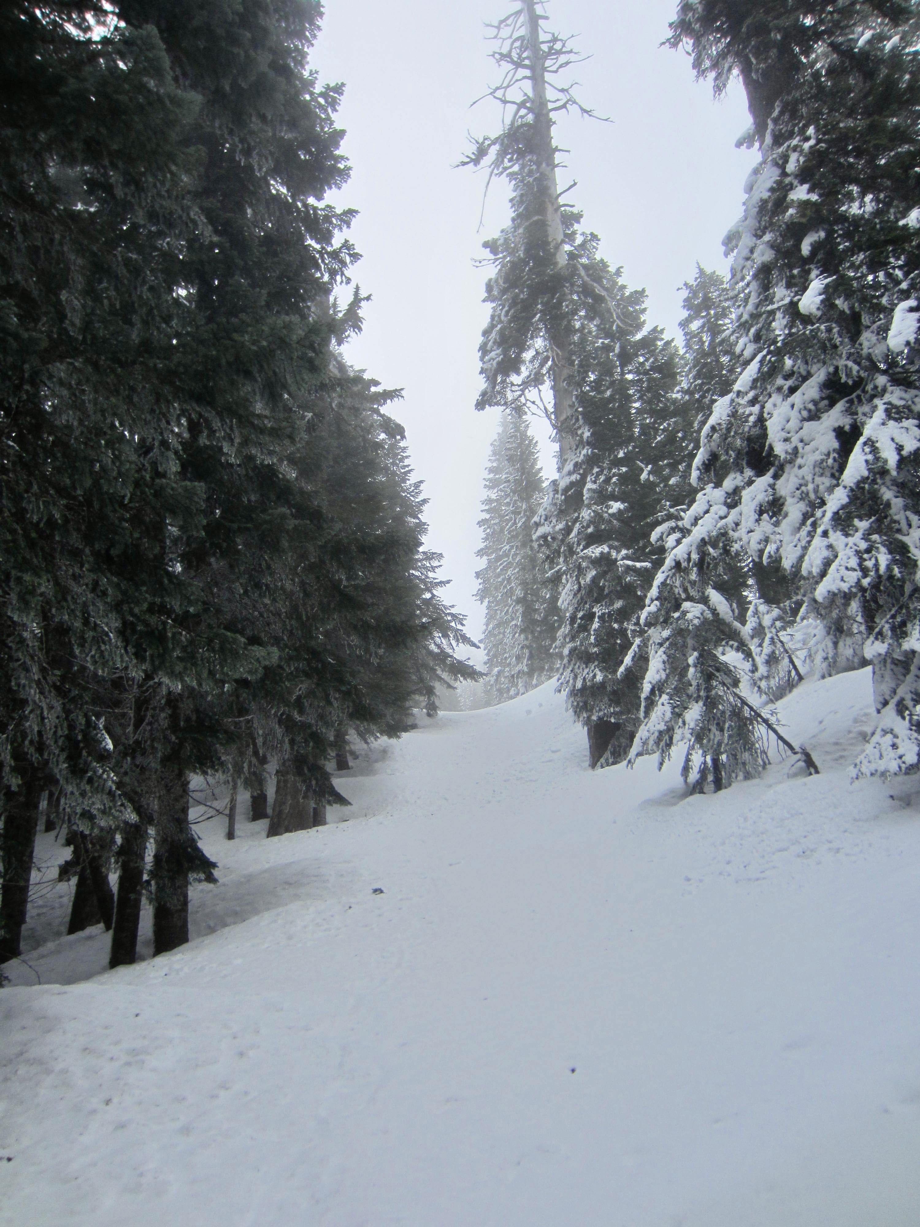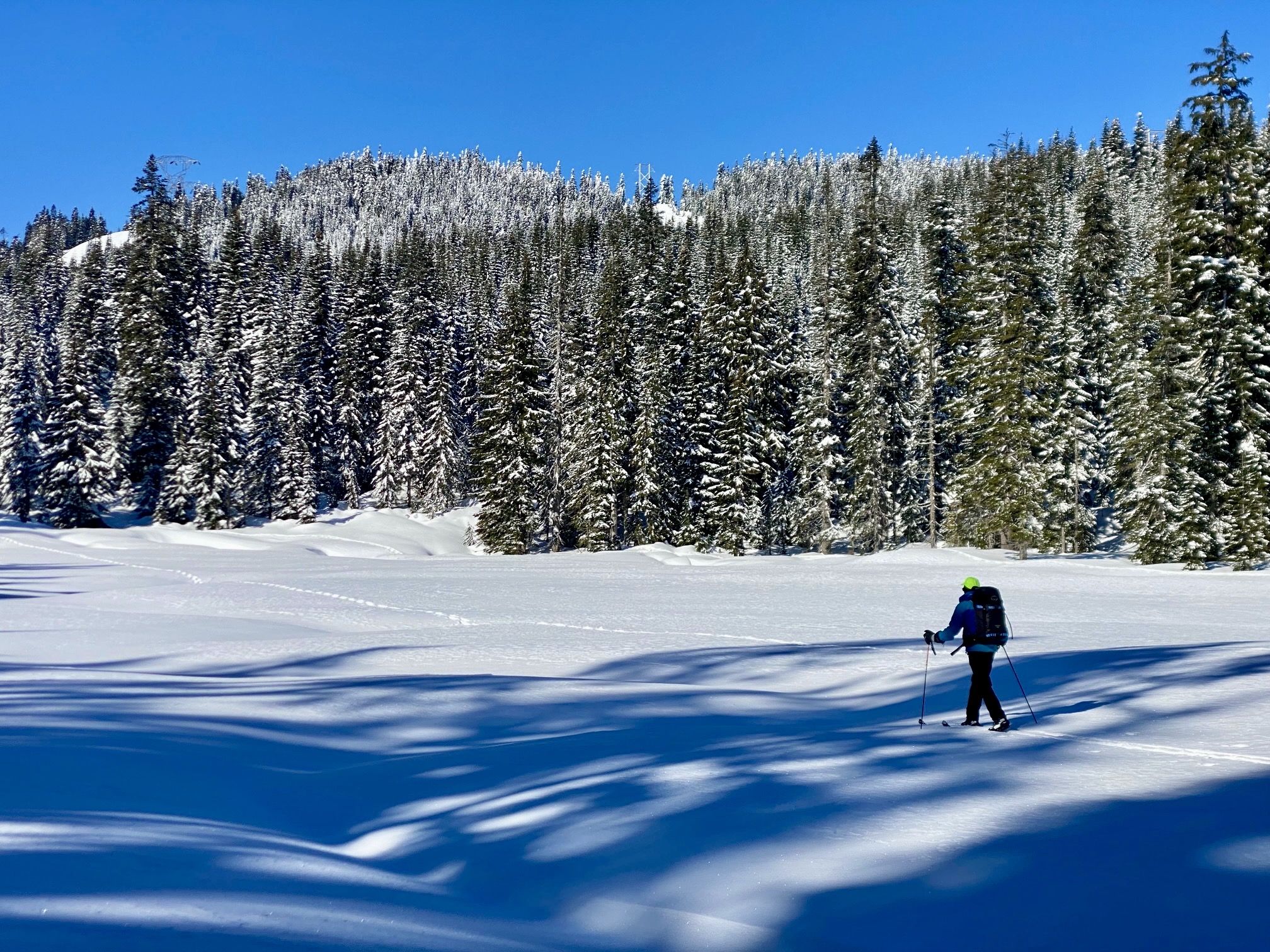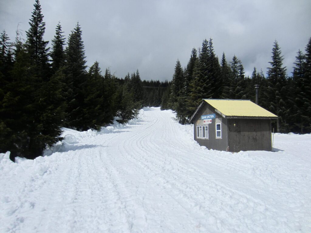 After leaving the old railroad grade, zig-zag up through the forest in a generally westward direction. Soon, you will come to a narrow road (usually grooomed). This is the Lower Crossover ski trail that connects Summit East with Silver Fir Outpost. Look for blue diamonds across the road and keep going.