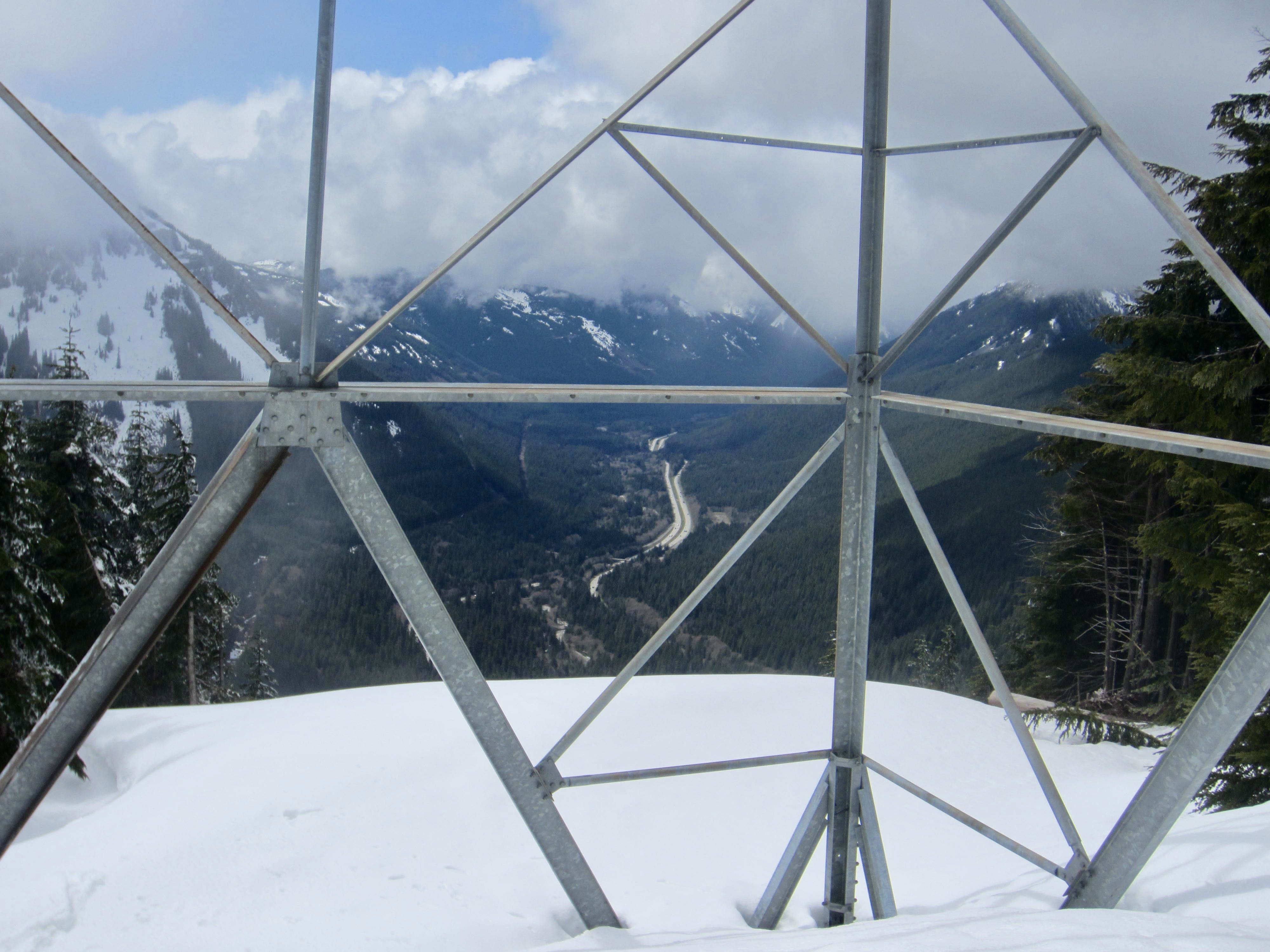 Follow the corridor, which is actually an old access road, northward up to a stubby steel lattice tower perched at the edge of a cliff. Take a moment to look over the edge for an unusual and dramatic view of Interstate-90 in the Snoqualmie River Valley far below.