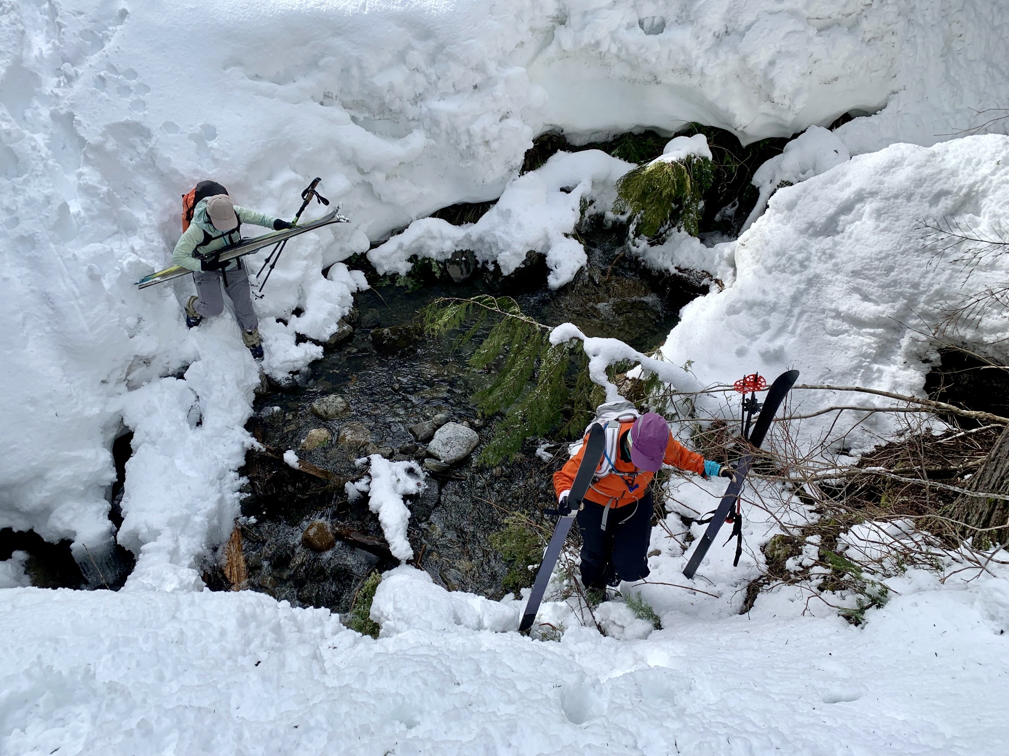 On the opposite side of the snowbank, you will see Little Hyak Creek flowing through a narrow channel. The depth of this channel depends on the snowpack thickness, but the crossing can be a bit tricky under any conditions. Look around for a log or rocks to use, then carefully drop into the channel and climb back up the other side. Most years, this represents the most technically difficult part of the entire trek!