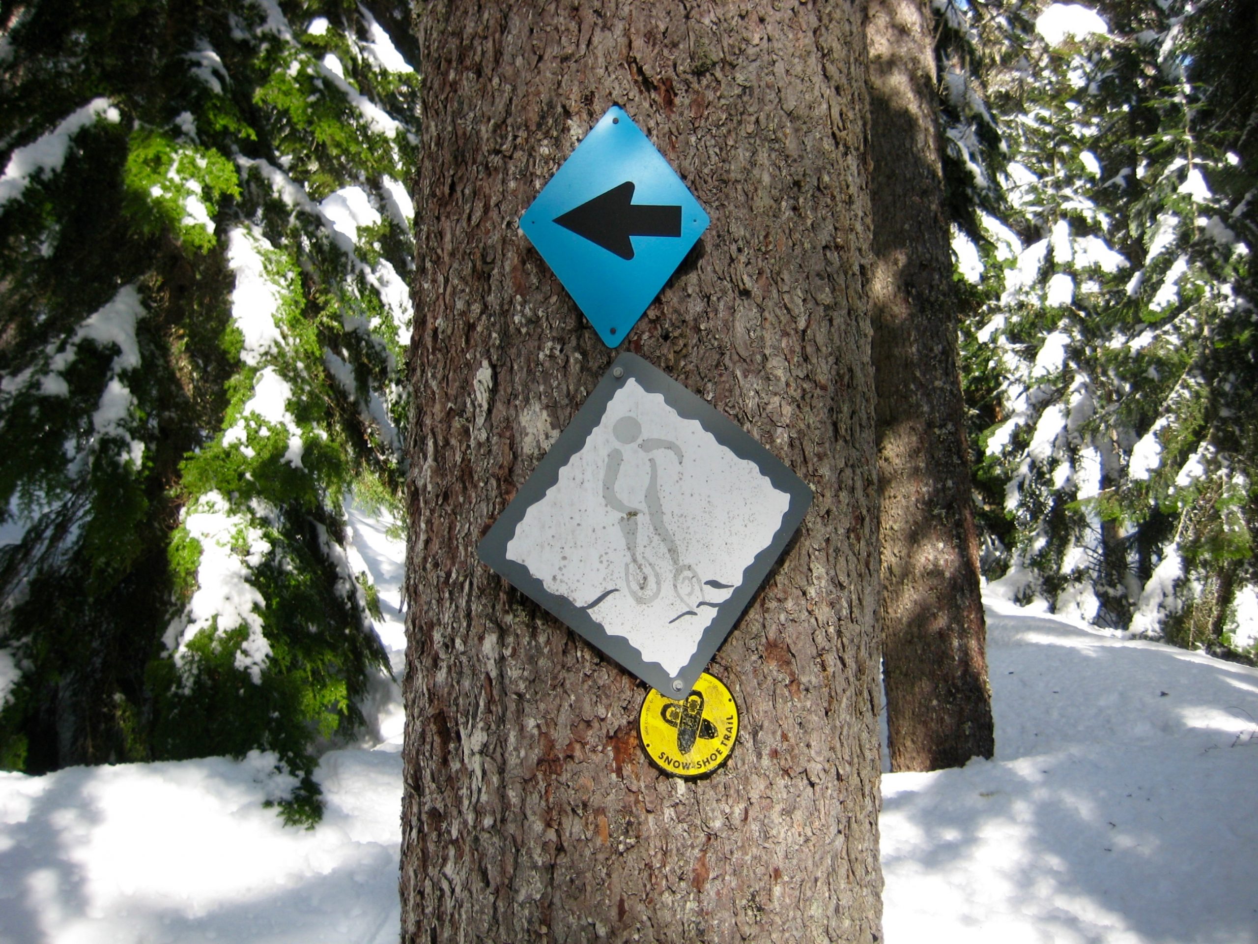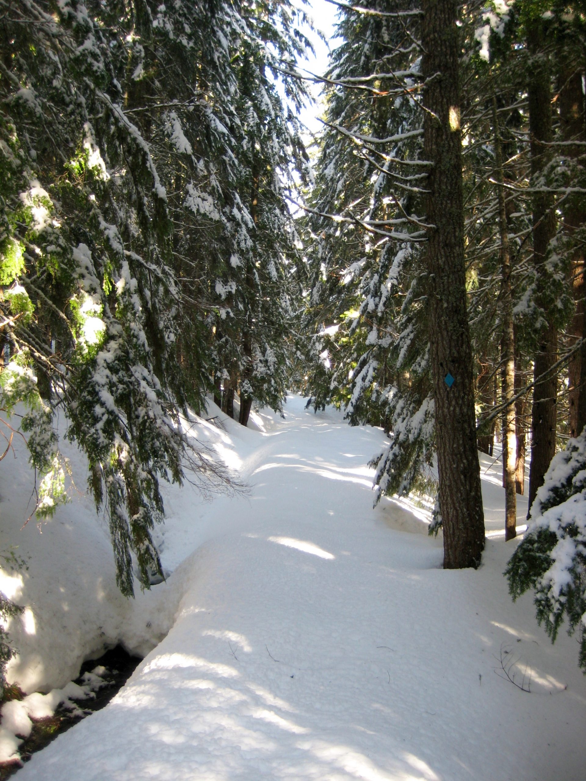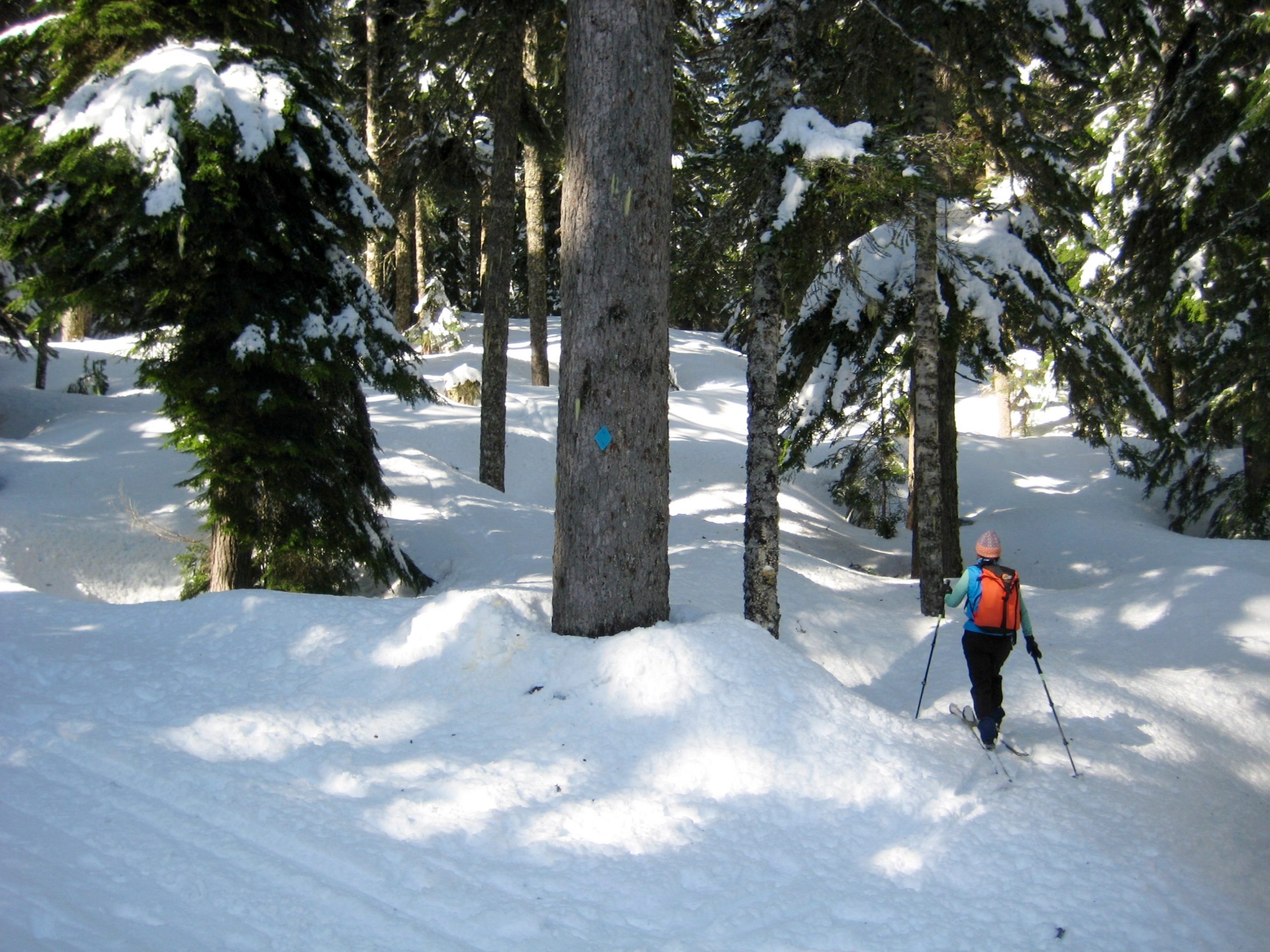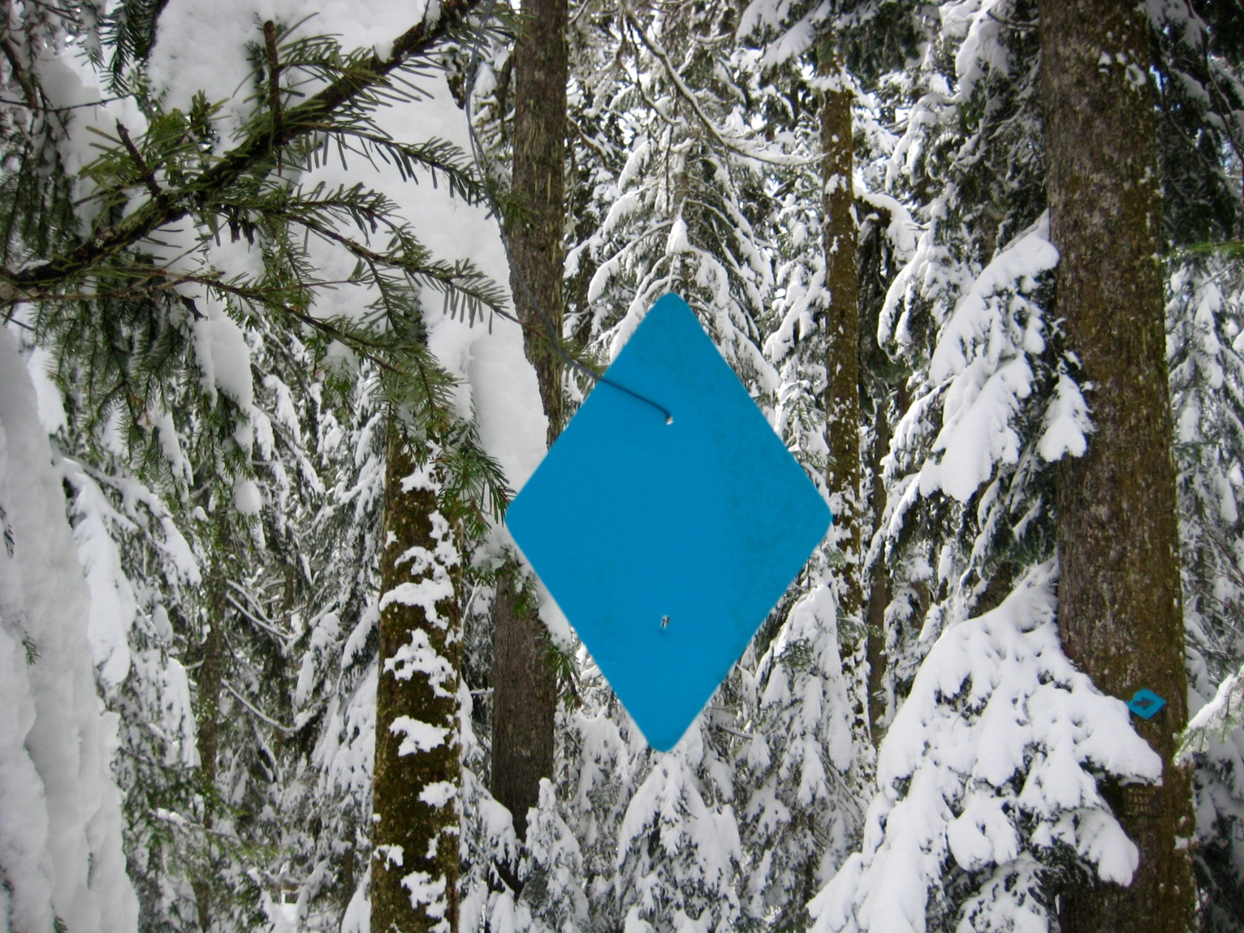 Once across Little Hyak Creek, proceed through the forest in a northwesterly direction. Stay in open areas as best as possible, and keep hunting for blue diamonds attached to tree trunks at sporadic intervals. These diamonds can be particularly difficult to see when the trees are coated with fresh snow. Happy hunting!