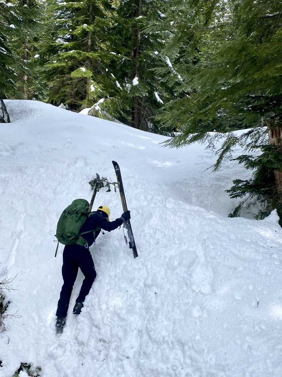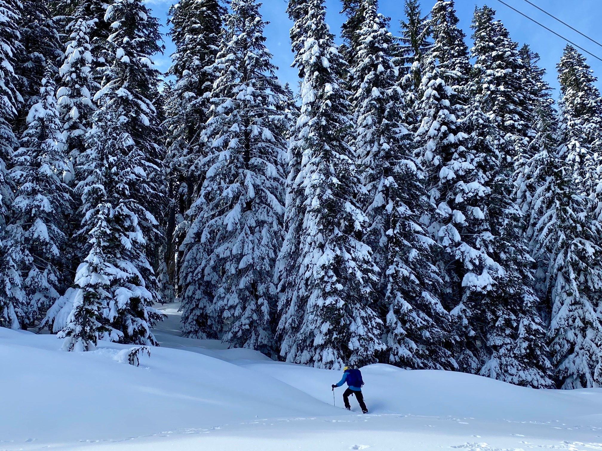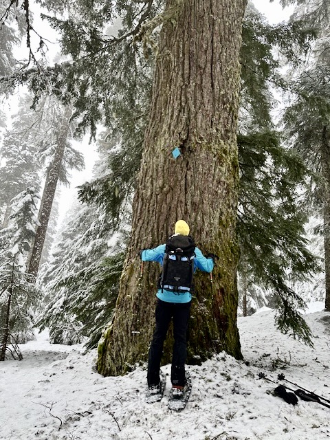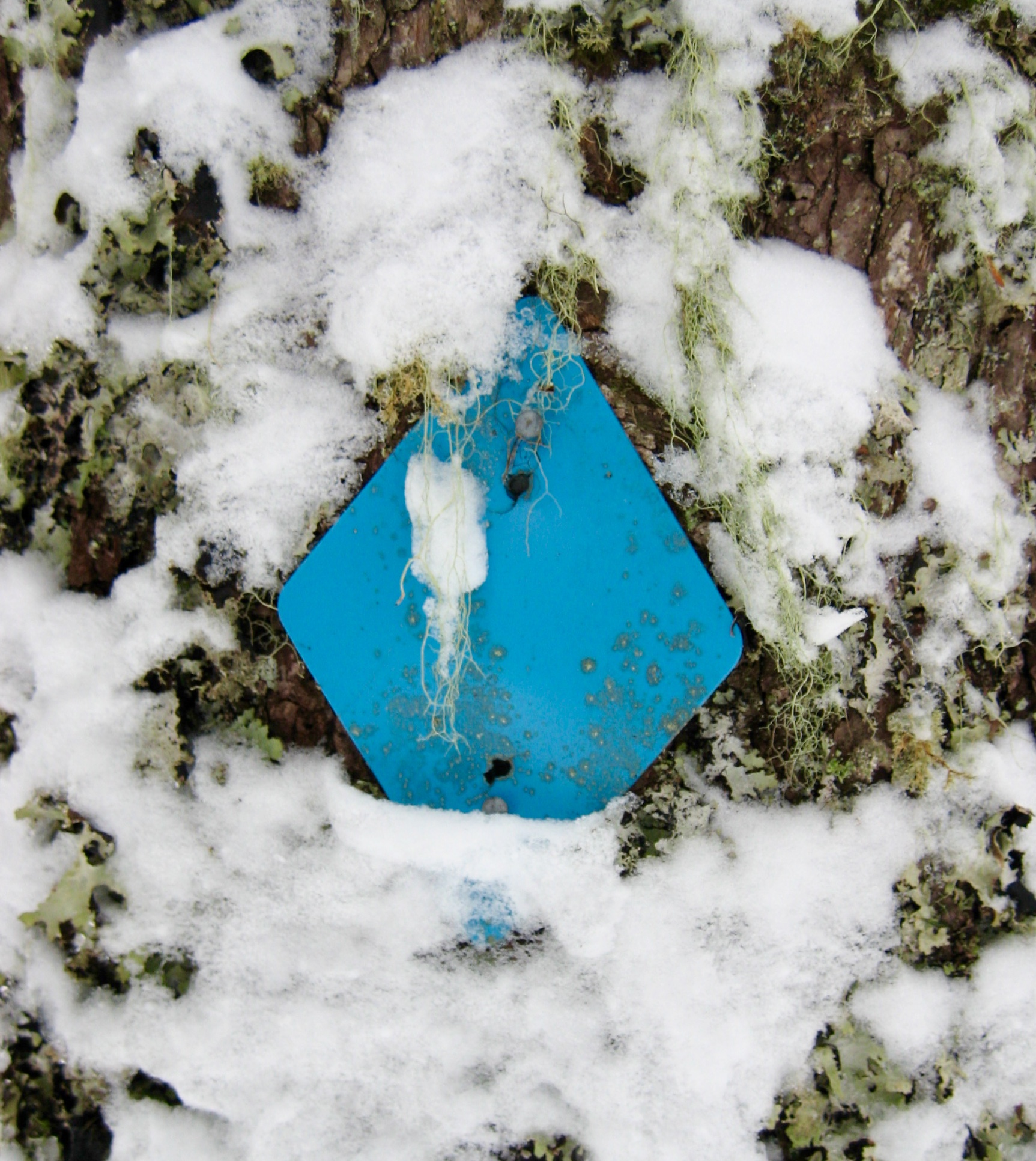 Once across Little Hyak Creek, proceed through the forest in a northwesterly direction. Stay in open areas as best as possible, and keep hunting for blue diamonds attached to tree trunks at sporadic intervals. These diamonds can be particularly difficult to see when the trees are coated with fresh snow. Happy hunting!