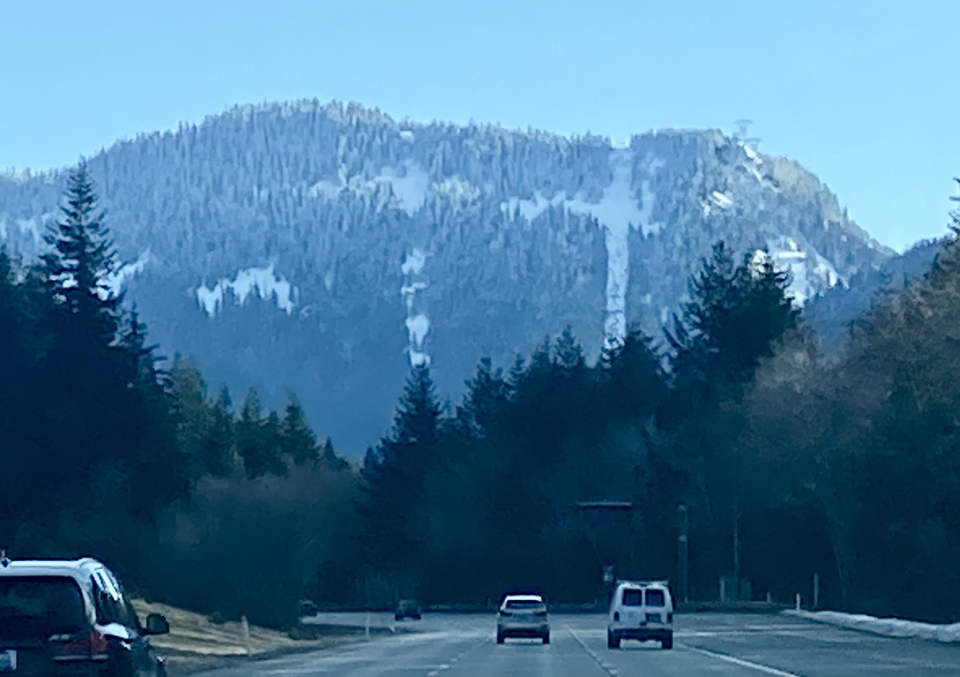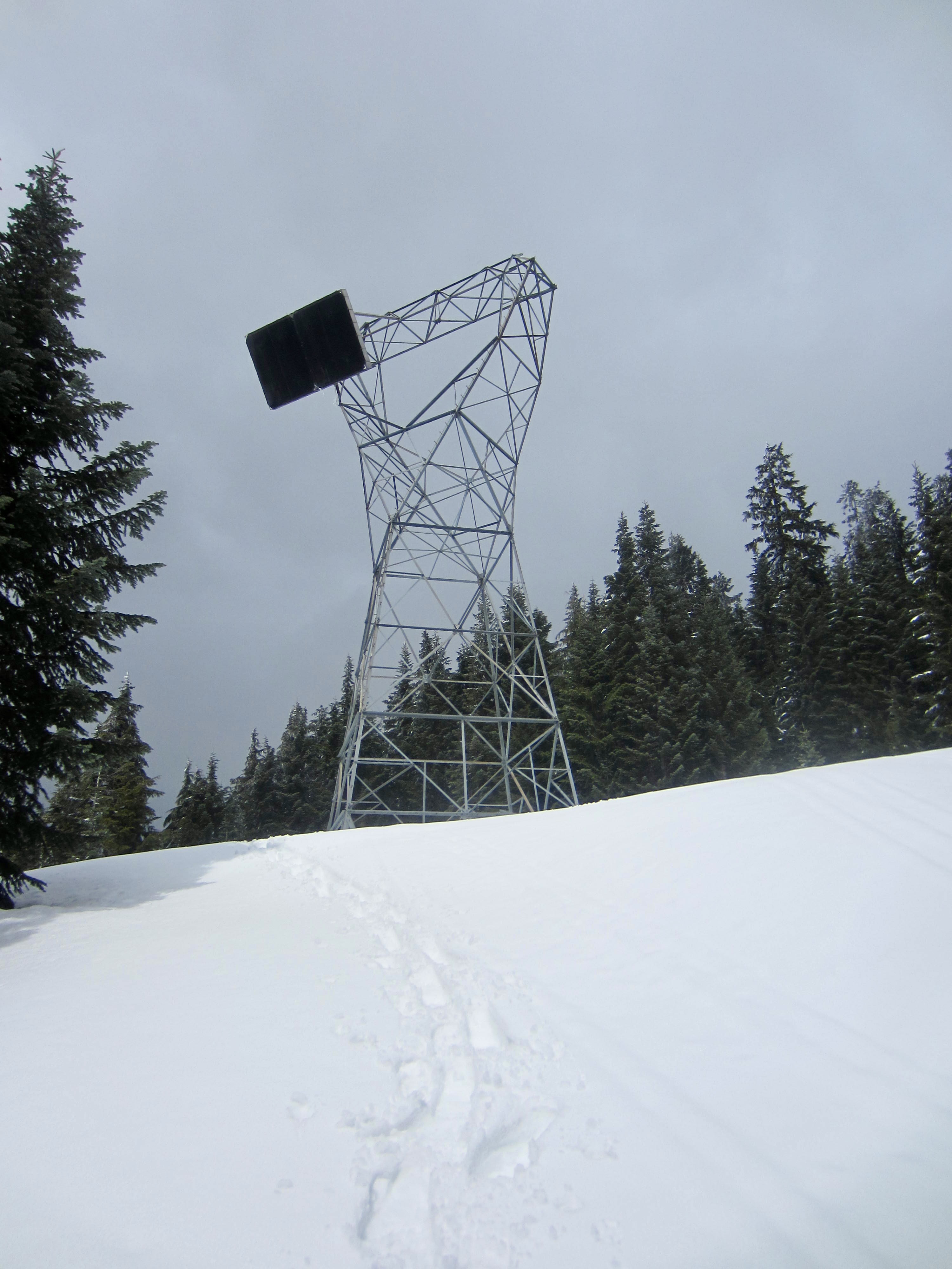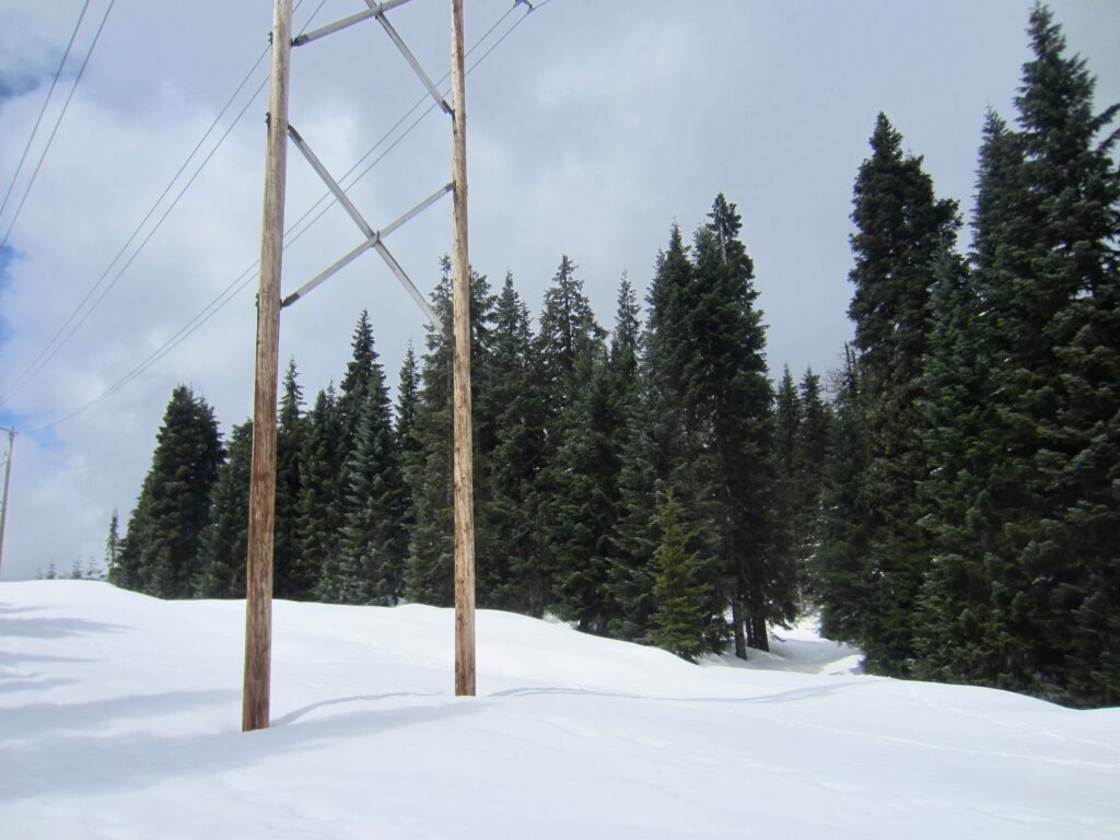 Surveyors Hill is a forested hill located approximately 3 miles south of Snoqualmie Pass. It is clearly visible from eastbound Interstate-90 between Milepost 45 and Milepost 47 and is easily identified by a powerline swath crossing over its shoulder. Despite its proximity to the Summit Central and Summit Nordic ski areas, Surveyors Hill does not seem to be a well-known wintertime destination, yet it makes an excellent snowshoe or ski trek due to varied terrain and interesting navigation. Some maps show the name “Ski Acres Hill” on this summit, as a reference to the former name for Summit Central Ski Area, but “Surveyors Hill” is more appropriate due to its position immediately above Surveyors Lake.