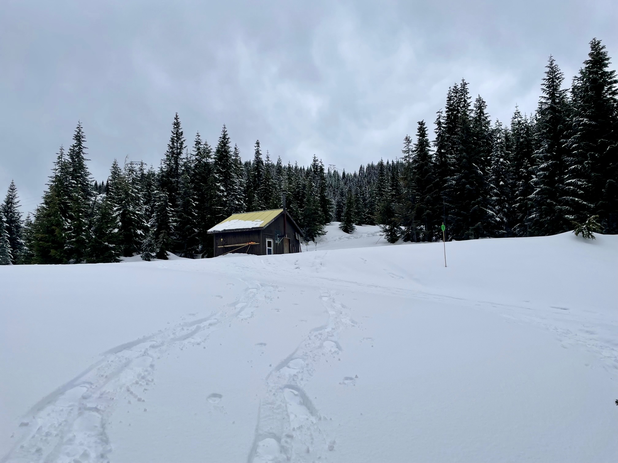 At Hyak Lake, the route to Surveyors Hill diverges from the NPT. Head due west across the lake surface to the far shore, then veer slightly left up a shallow draw. This draw extends upward for 200 yards to the flats of Grand Junction, which forms the hub of numerous radiating ski trails. A warming hut here provides a nice refuge on a stormy day.
