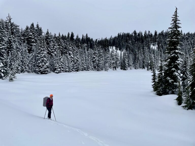The route described here begins at Hyak and follows the Nordic Pass Trail up to Hyak Lake. An alternative starting point is Silver Fir Outpost, which is located about ¾ mile north of Hyak. From there, the Silver Fir Trail can be followed up to Hyak Lake. I prefer to start at Hyak because there is more parking available and the Nordic Pass Trail is more interesting. The Silver Fir Trail is a bit more direct but parking is very limited during the peak ski season, especially on weekends and holidays. Be aware that both trail options are really just marked backcountry routes and, as such, require good navigation skills.