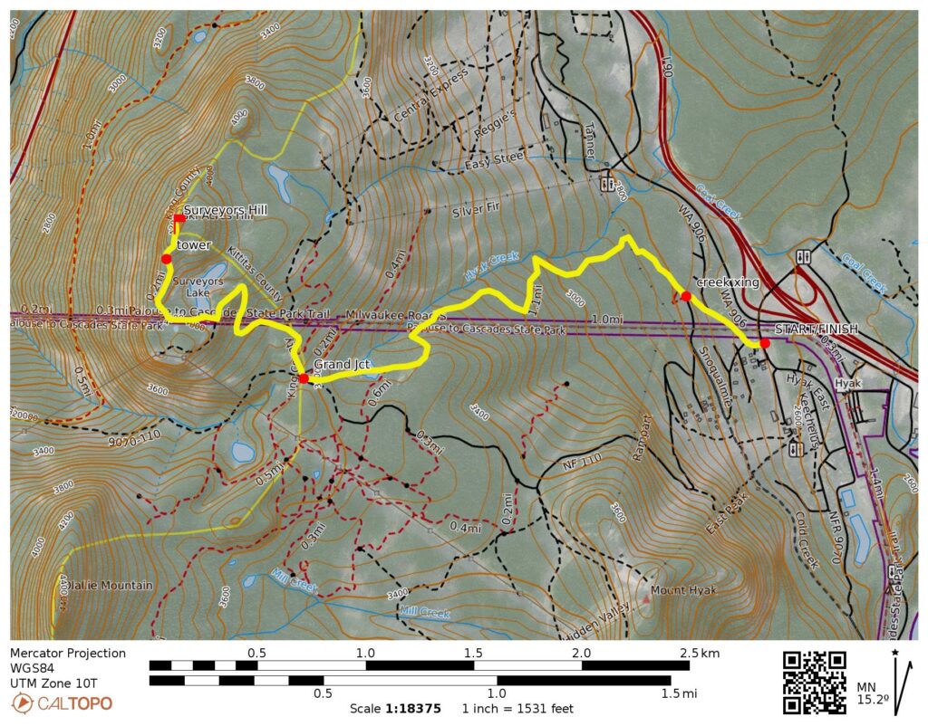 Way Points: Snoqualmie Drive / Cascade Place intersection & Nordic Pass Trailhead (road walk); Little Hyak Creek & Hyak Creek & Lower Crossover Ski Trail & InterSummit-90 Ski Trail & Hyak Lake & Grand Junction & Surveyors Lake & Surveyors Hill summit (snowshoe hike or ski tour)