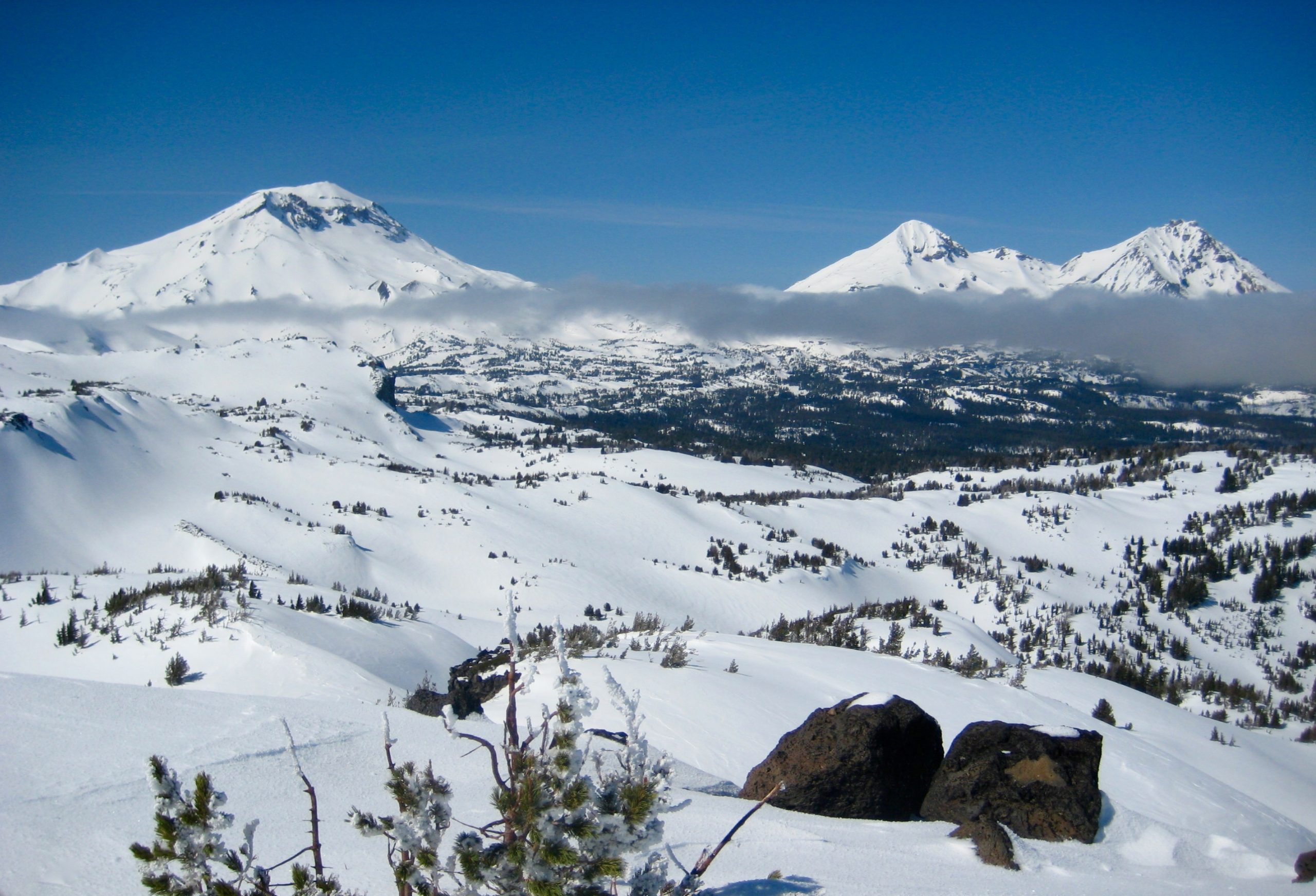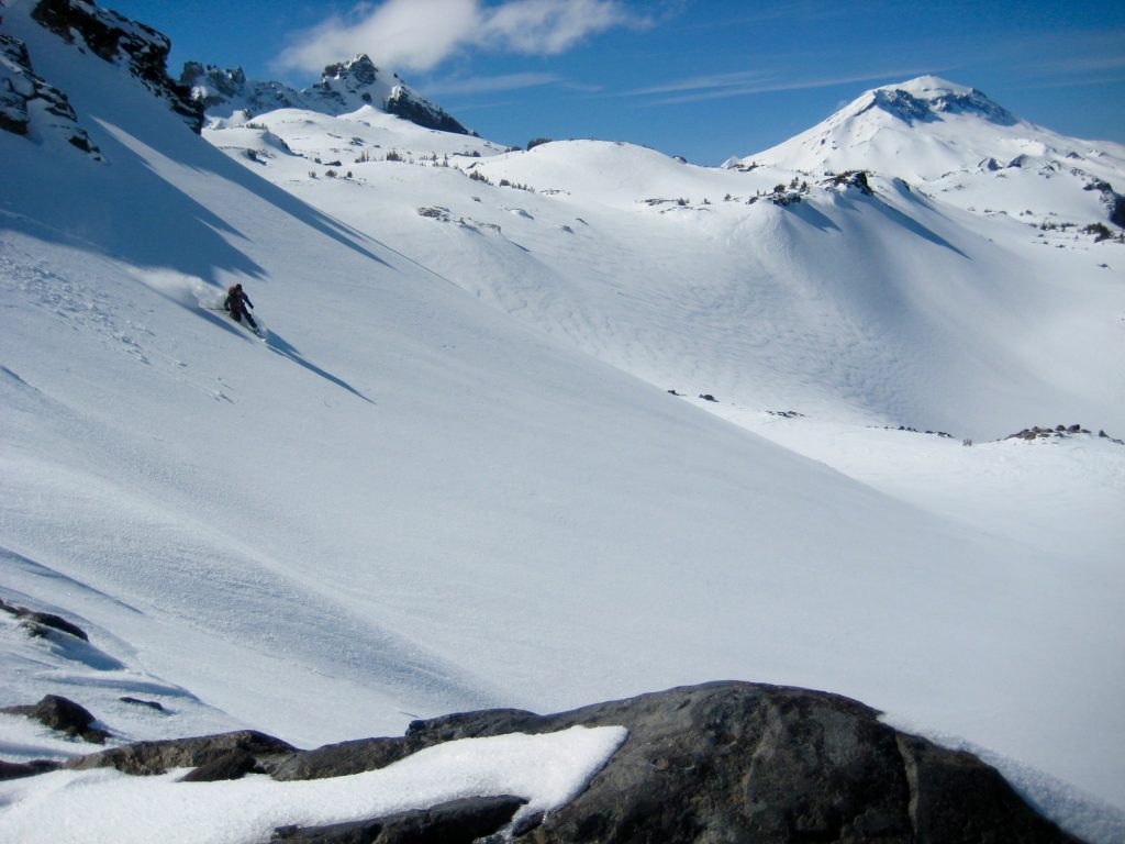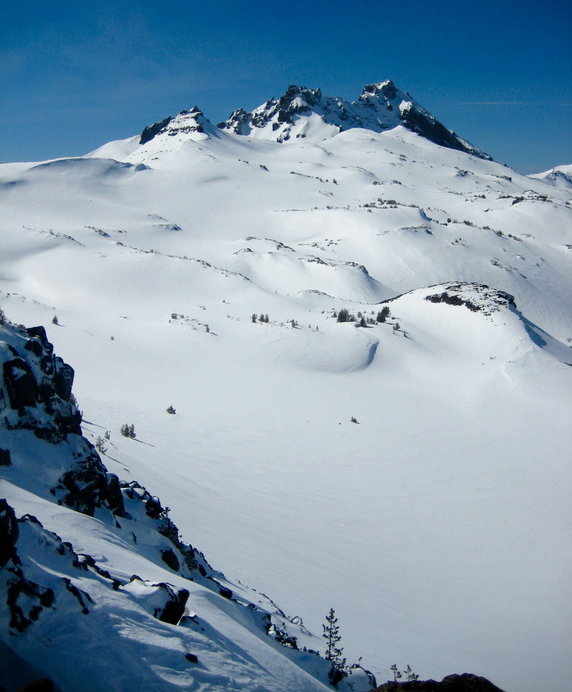 The fog gradually cleared out, and by noon we were standing atop Tam Viewpoint in full sun. This rocky knob overlooks Snow Creek Bowl and provides an excellent vantage for Broken Hand, Broken Top, and The Three Sisters.