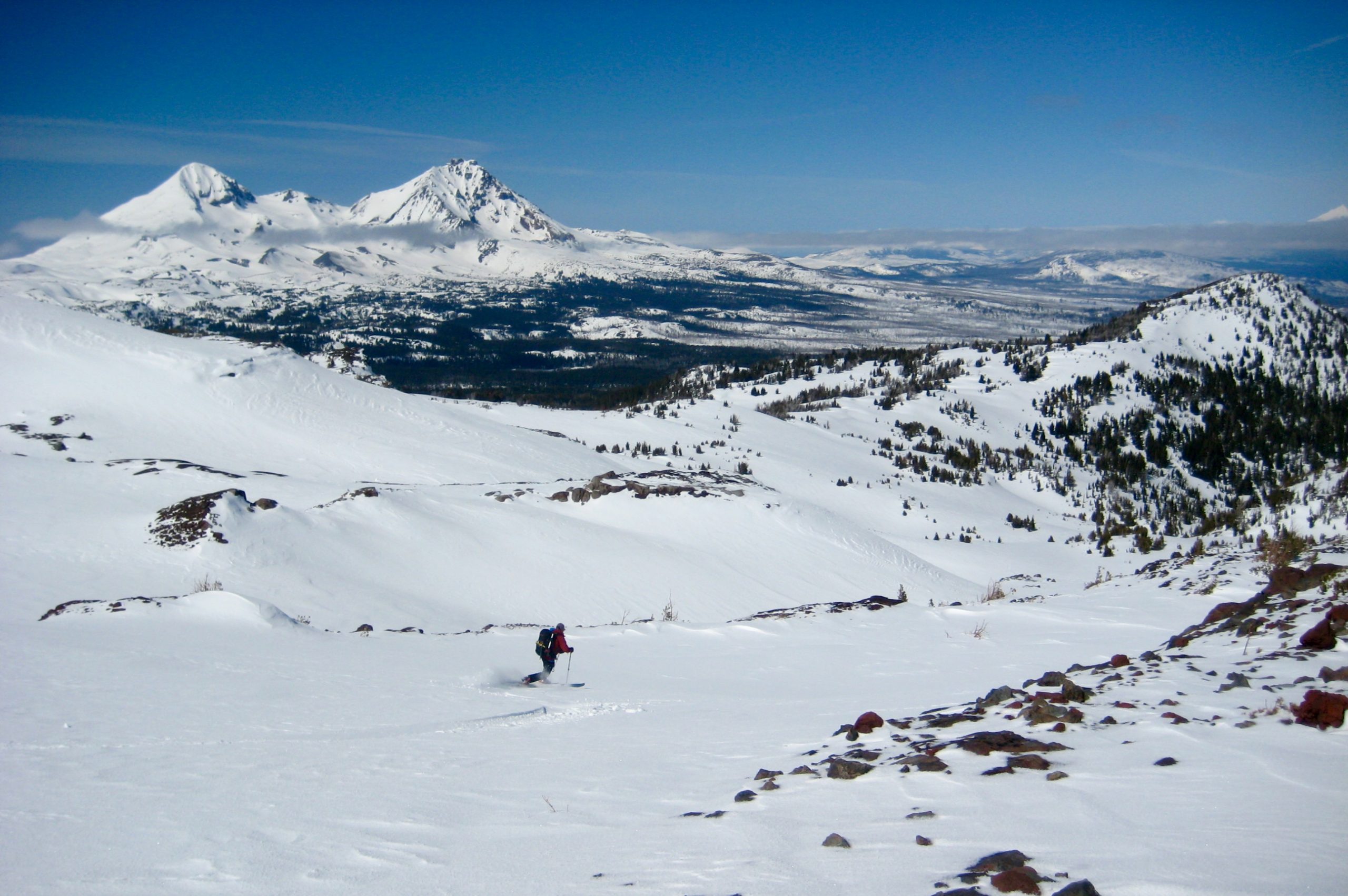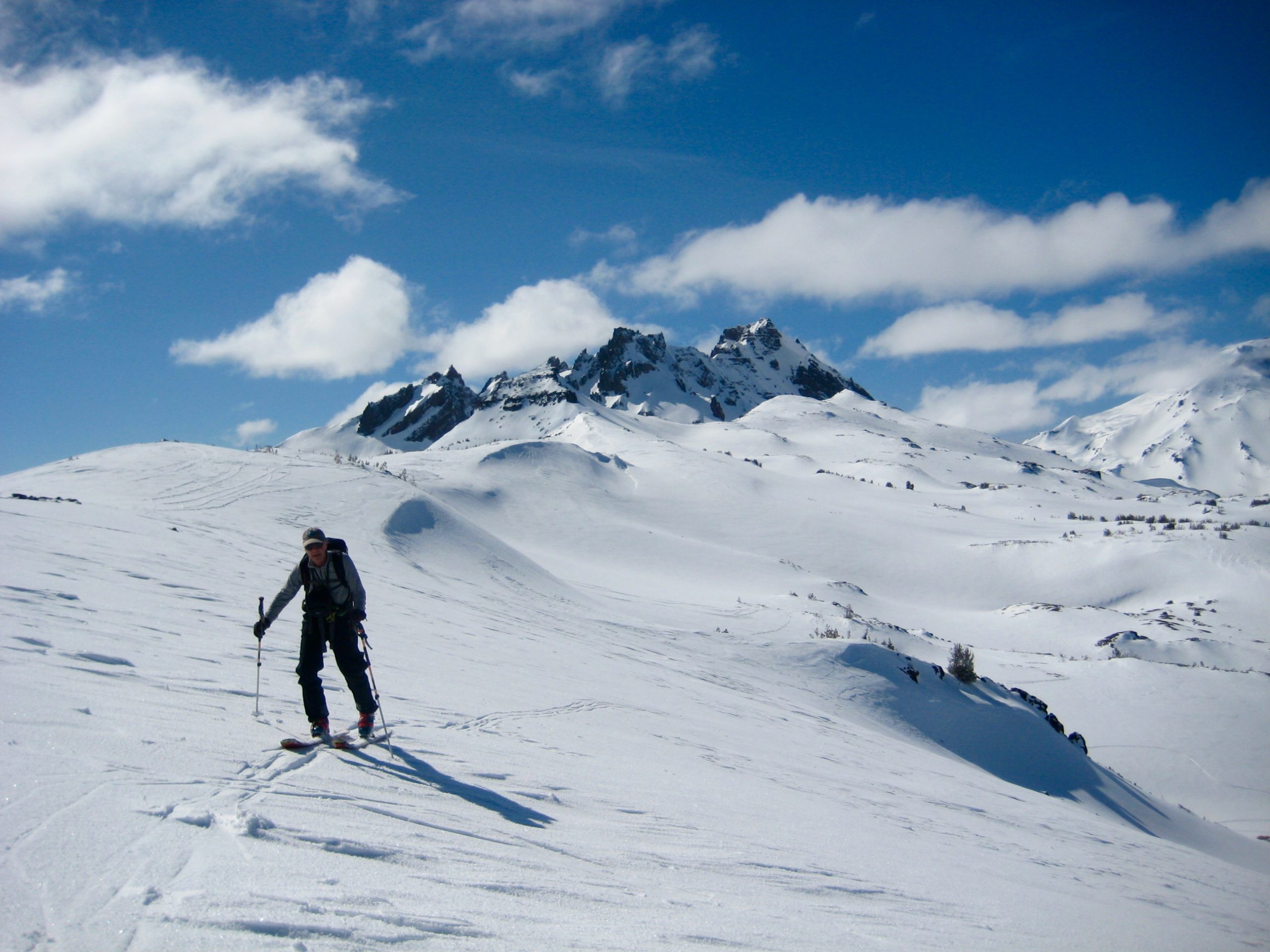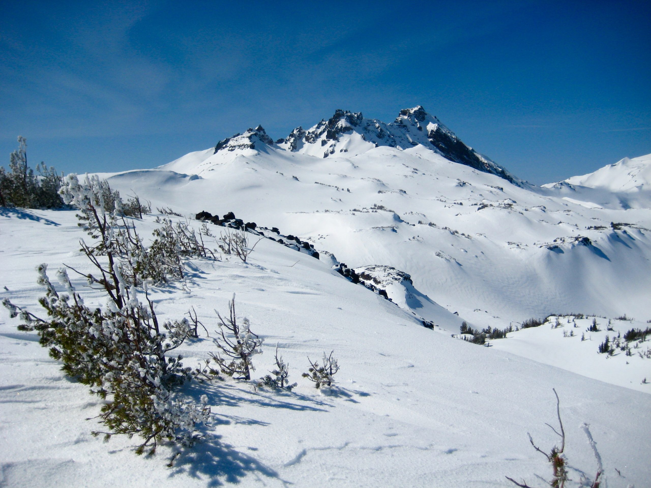 The fog gradually cleared out, and by noon we were standing atop Tam Viewpoint in full sun. This rocky knob overlooks Snow Creek Bowl and provides an excellent vantage for Broken Hand, Broken Top, and The Three Sisters.