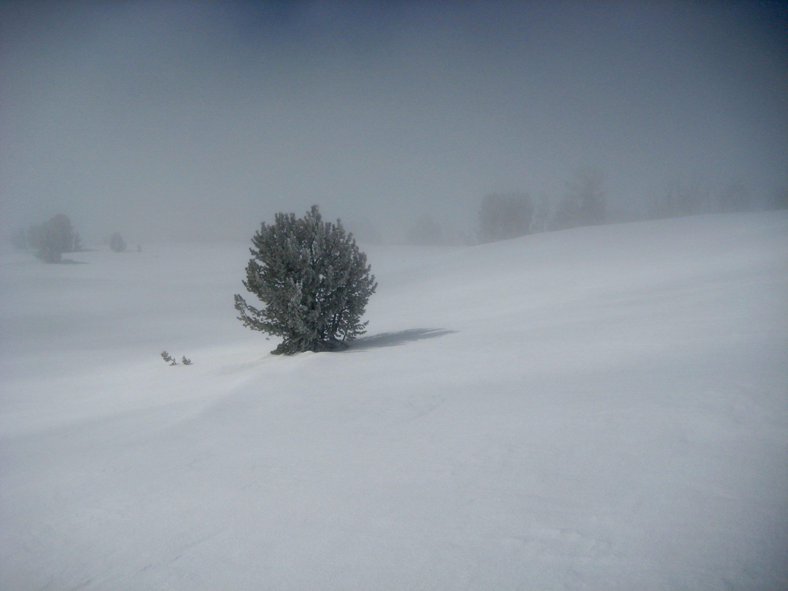 We curved around the rim until above the middle of Snow Creek Bowl and then dropped in for much-anticipated telemark turns. Snow conditions were similar to those found in Orchard Bowl yesterday, but these slopes revealed scarcely a trace of previous ski tracks. Over the next few hours, we made four enthusiastic ski runs down the unblemished bowl. Or maybe it was five.