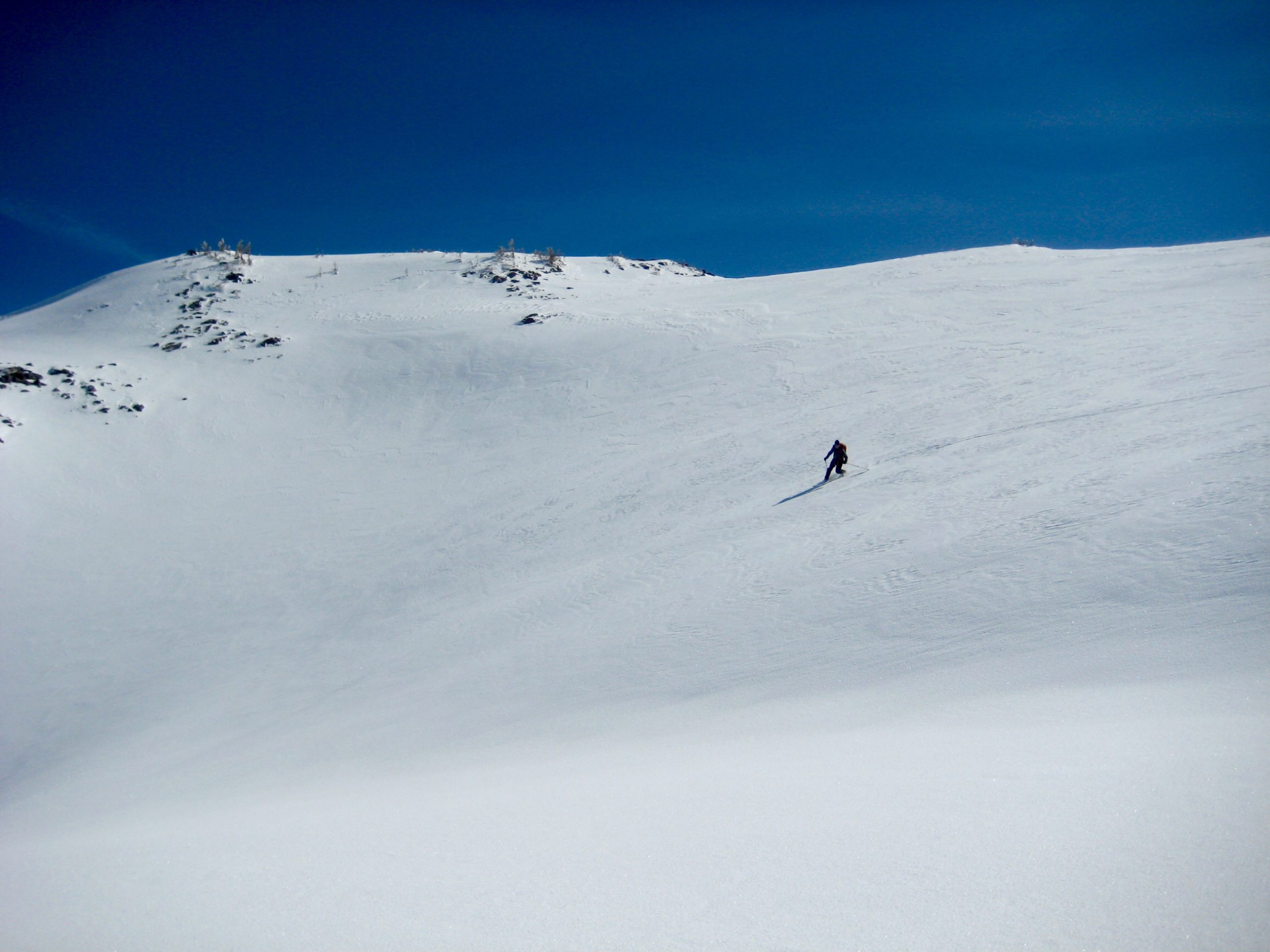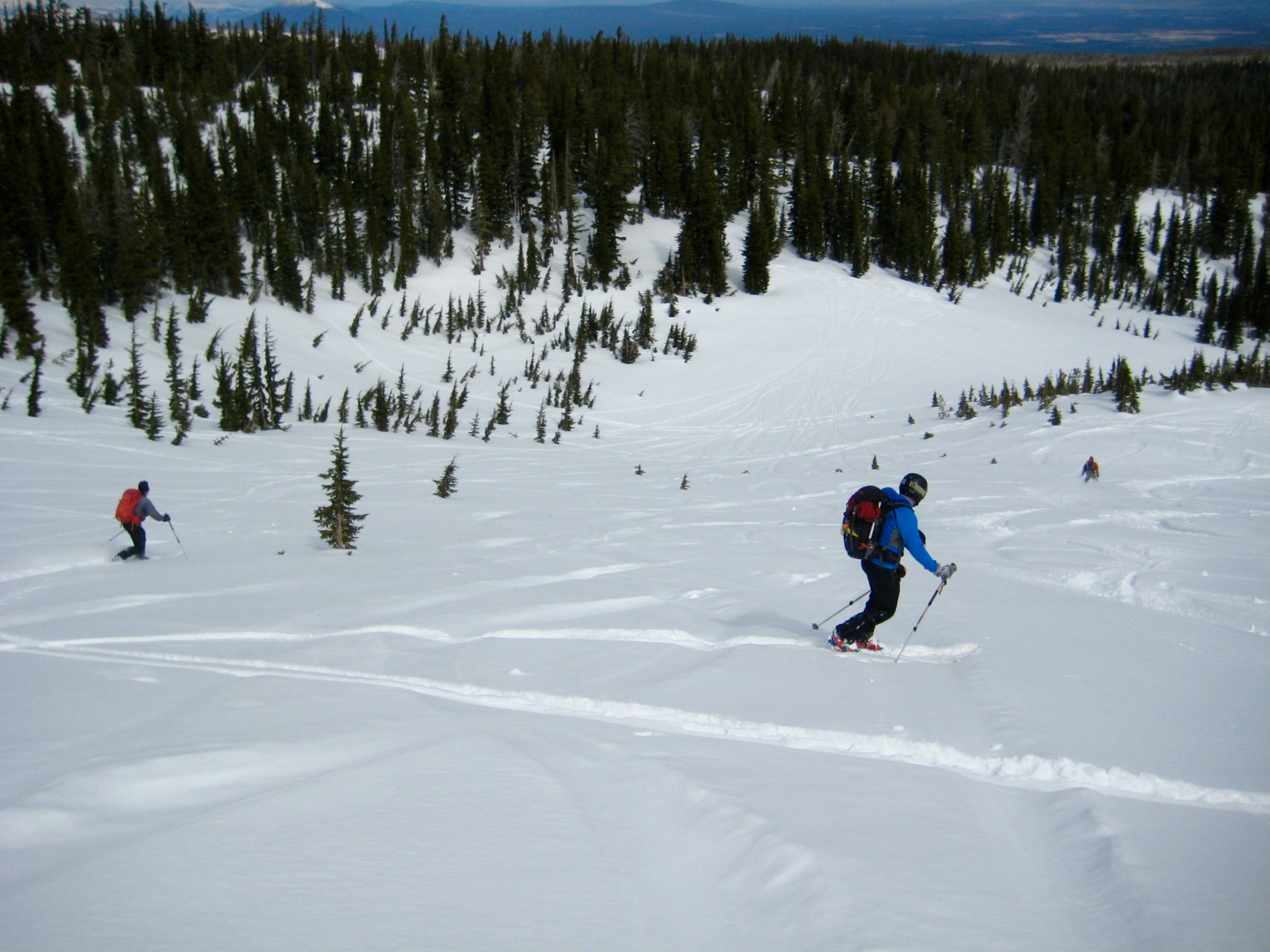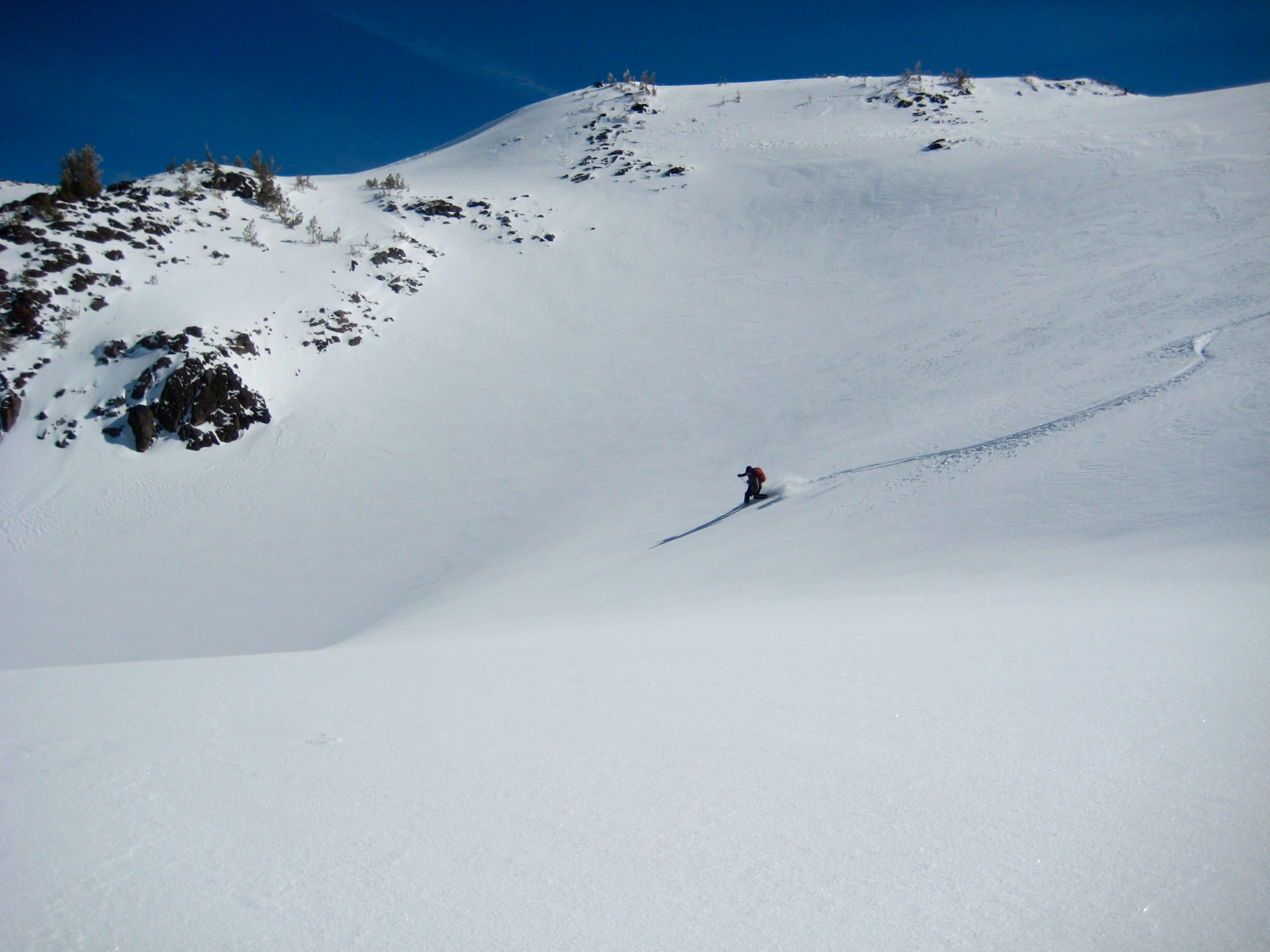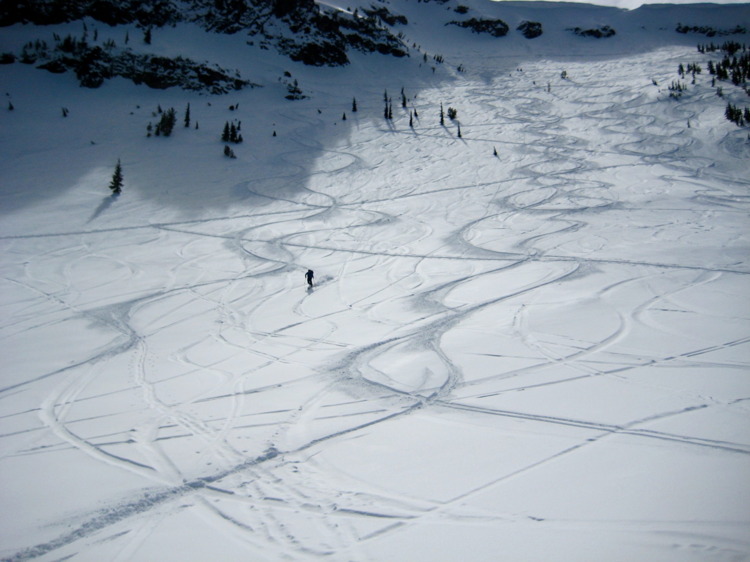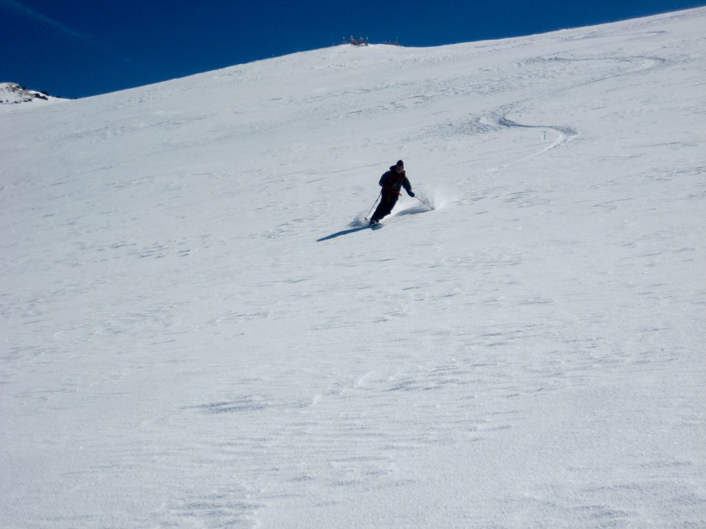 Despite feeling that we were a bit late to the party, we managed to spend several fun hours sneaking runs in between existing tracks. Snow conditions were pretty good, with a light surface crust mantling a foot of heavy powder over a firm base.