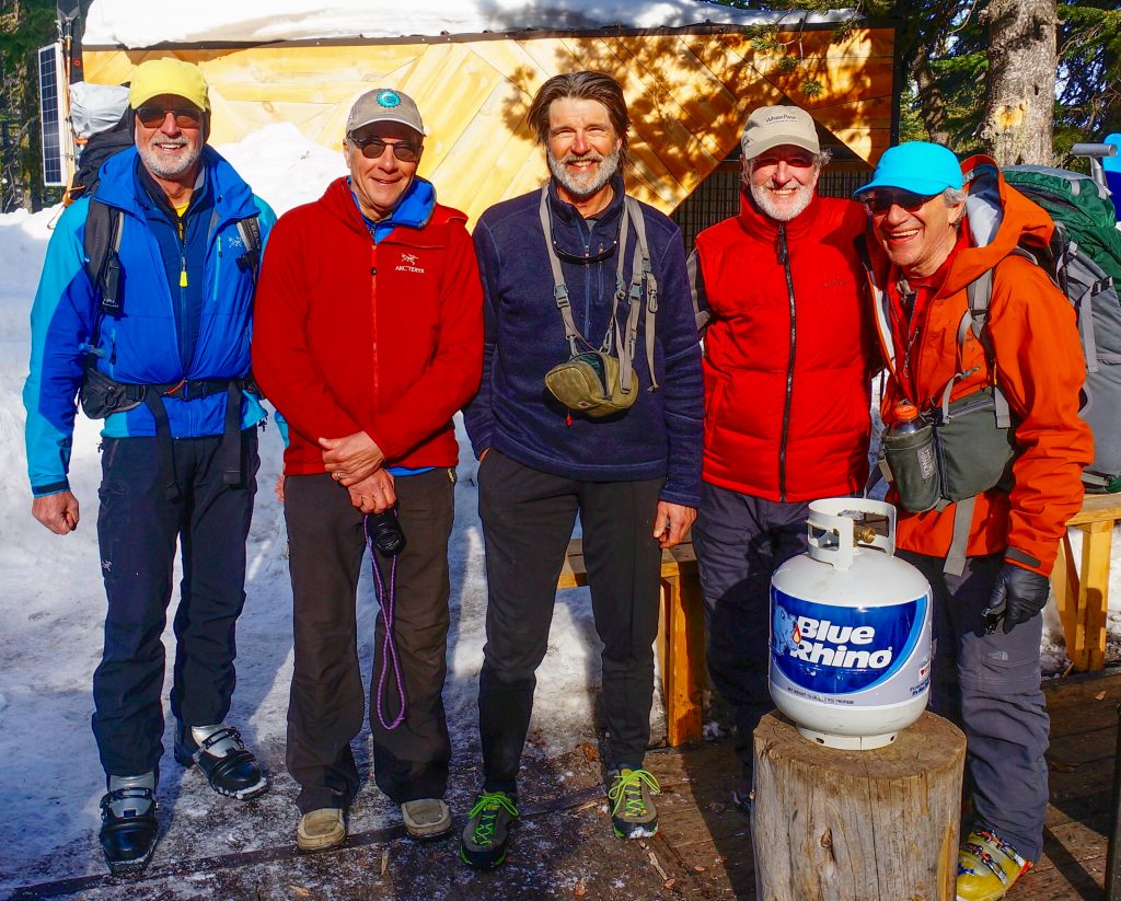 We all returned to the yurt in mid-afternoon (3.9 hours + 1750 feet total tour) for beverages and injury assessments. Both Tony and Bob were experiencing sharp knee pain, so they opted to spend the remainder of the day resting their joints and comparing orthopedic braces. Doug, Greg, and I headed out again for some late-afternoon turns down “Jelly Roll” and “Playground,” two open slopes directly above camp. After this bonus 900-foot ski run, one of my knees prompted me to join Tony and Bob in the Owl Infirmary.