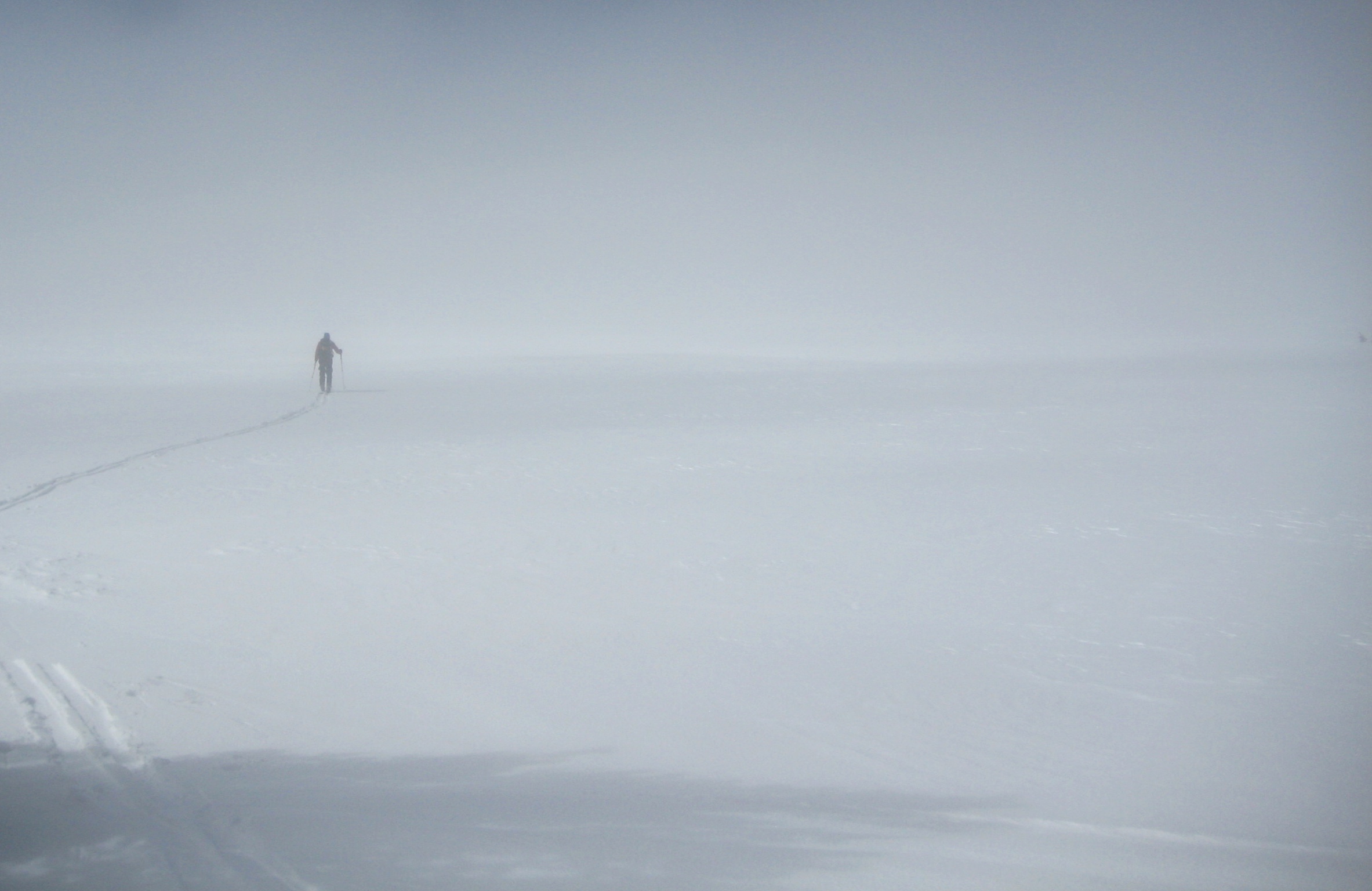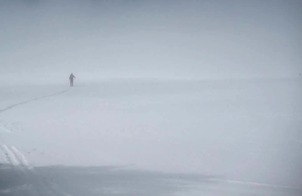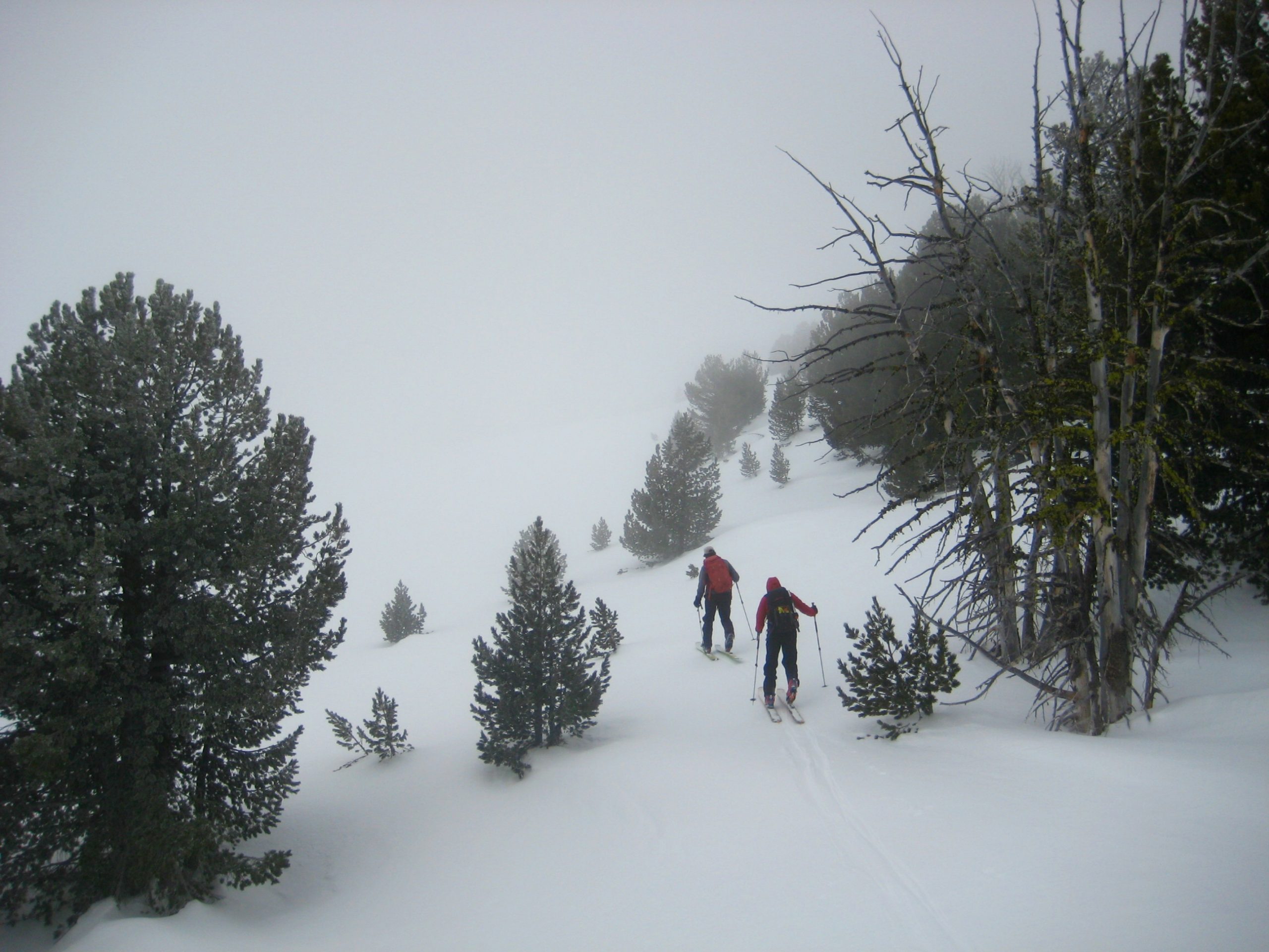 As for today, Bob and Tony chose to take an easier “knee day” by skiing close to camp, whereas Greg and Doug elected for a longer tour out to Snow Creek Bowl. I should have stayed with Bob and Tony, but FOMO got the better of me; I headed out with Greg and Doug at 10:00am. From camp, we skinned up through dense forest and along a large snow ramp called “The Escalator,” which took us to the top of Tam Rim. We then traversed across the plateau through a mile of eerie fog.