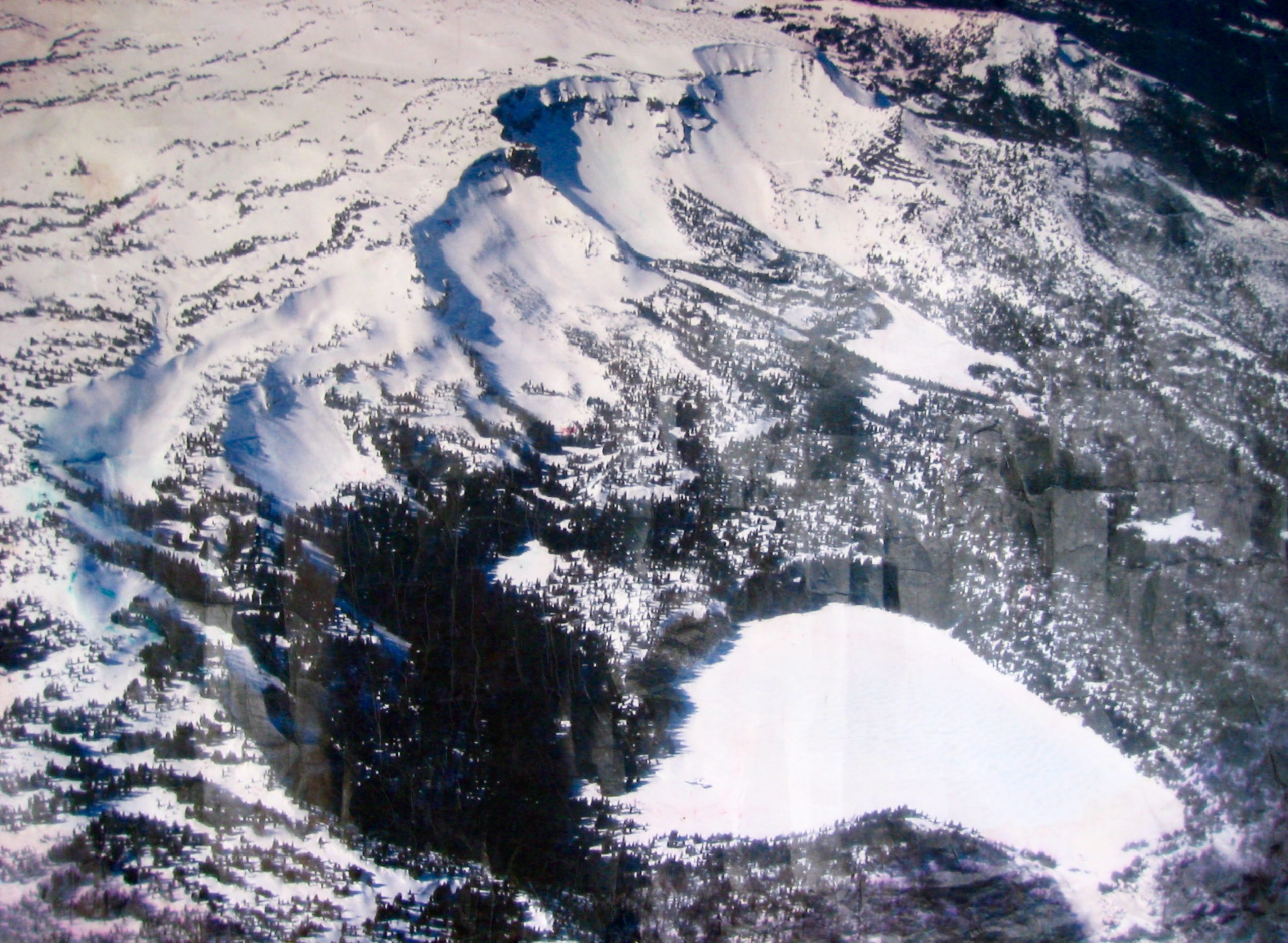 In contrast to yesterday’s bluebird weather and today’s forecast for more of the same, we awoke to a low, gray, overcast sky. Skiing plans were discussed over a breakfast of scrambled eggs. Tony and I reluctantly decided to depart tomorrow morning—a day earlier than the others—due to knee problems, so we packed up our non-essential gear and sent it down to the sno-park on TSBC’s midday snowmobile run.