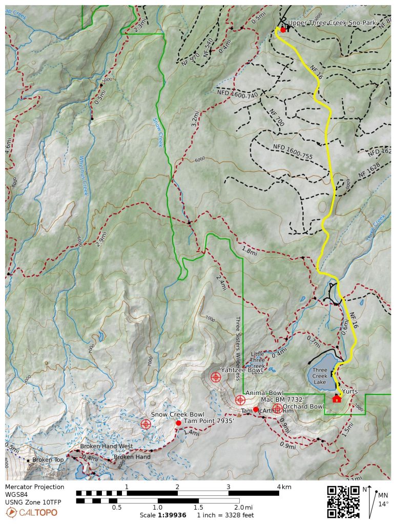 Our group met Jonas and Gabe in the large parking lot of Upper Three Creek Sno-Park at 9:00am on a sunny Monday. Gear and people were loaded onto a snowmobile sled, then Gabe drove us 5½ miles up Forest Road #16 to the yurt camp beside Three Creek Lake. Along the way, we could gander at the tantalizing northeast-facing bowls of Tam McArthur Rim.