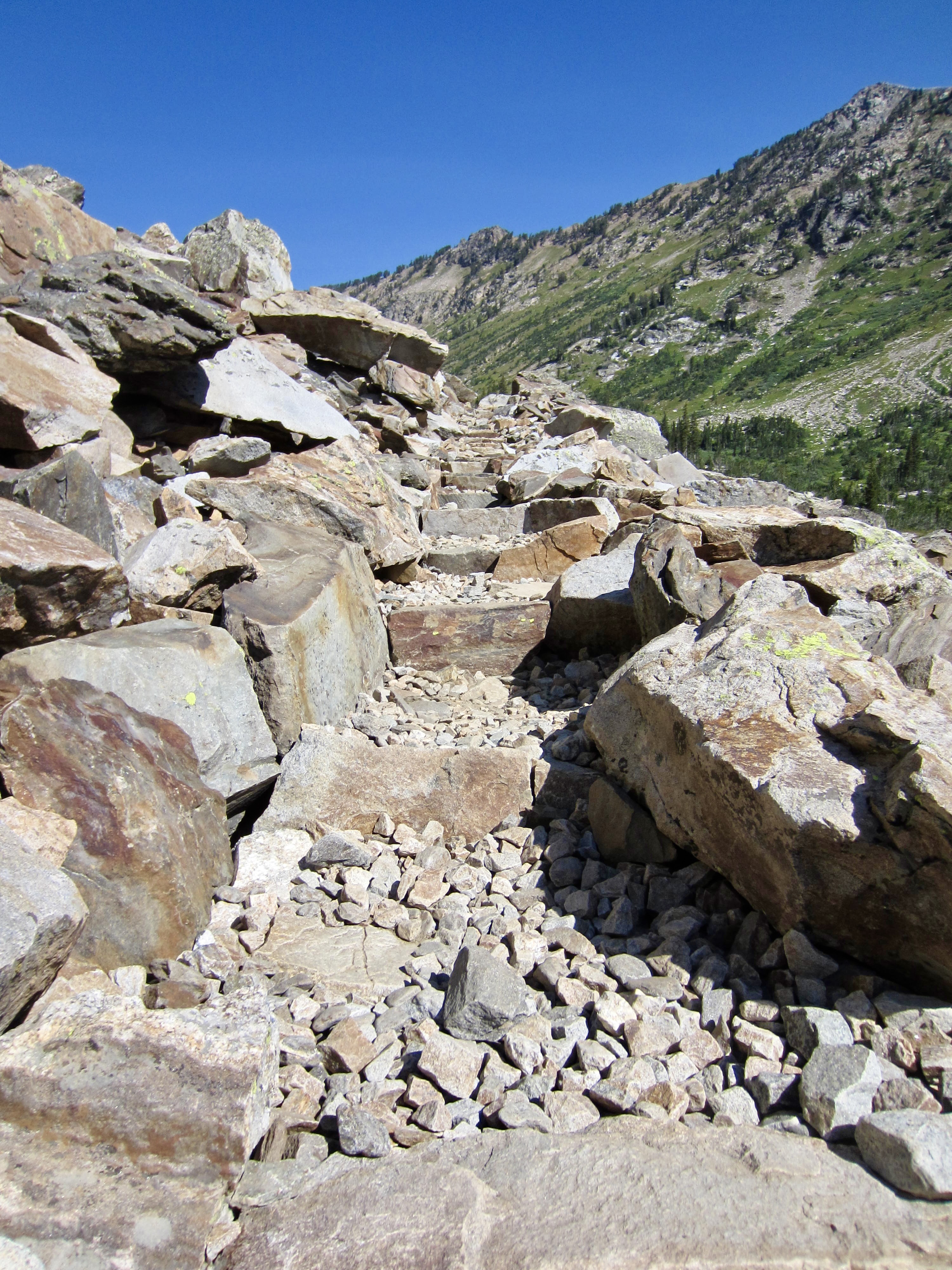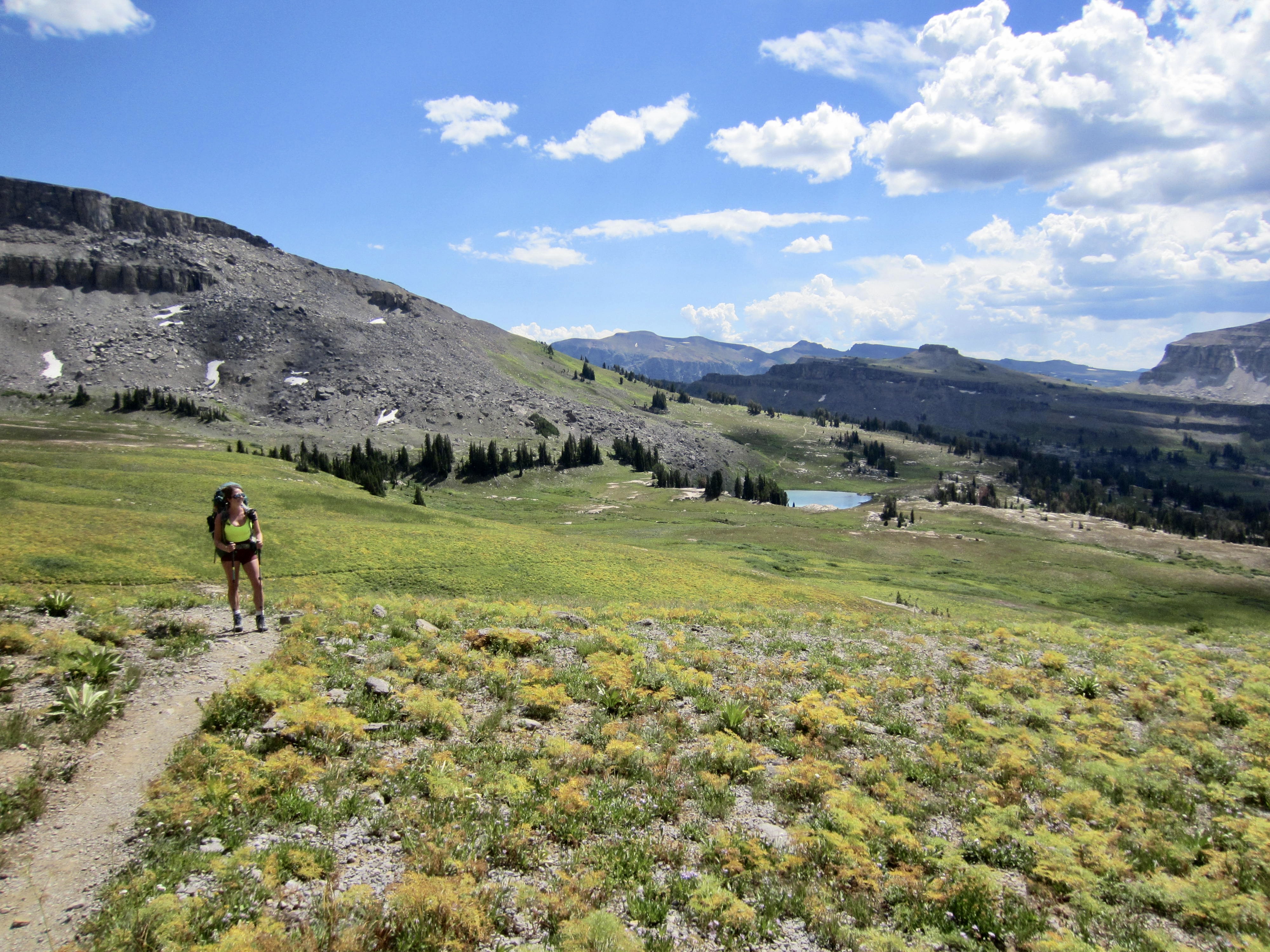 One by one, over the course of an hour, we pried ourselves away from the lake and began a long, hot hike up to Paintbrush Divide on a rocky trail. This 10,700-foot pass represents the high point of the entire TCT and marked the final ascent of our traverse. It was all downhill from here!