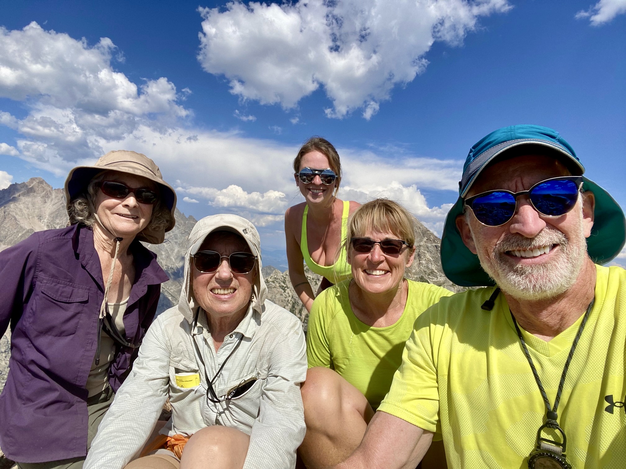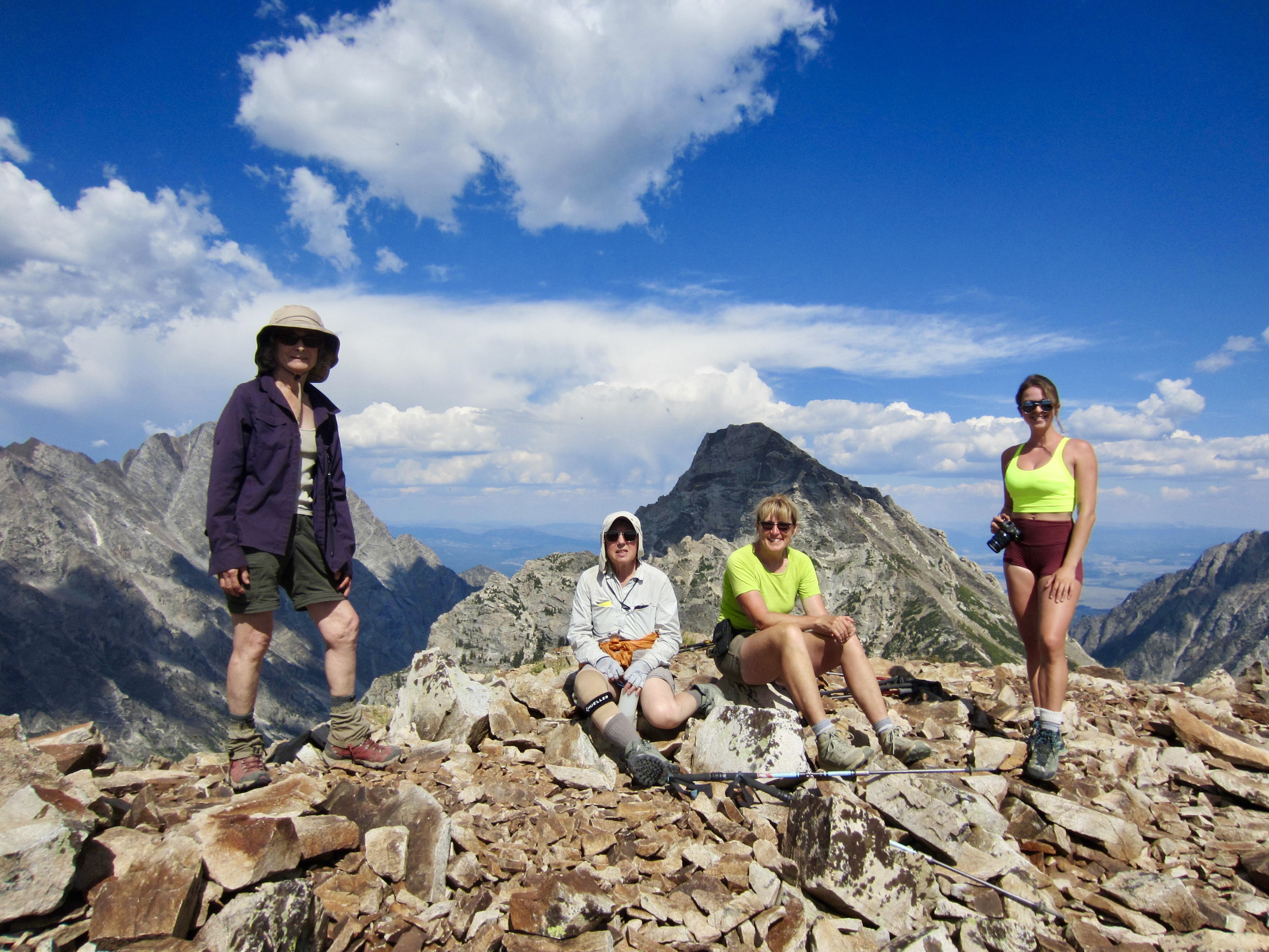 Fay, Beth, Eileen, Brooke, and I took advantage of our high position by making a short climb of nearby Paintbrush Peak. From this 10,900-foot summit, we could see all of the northern Teton peaks, including Mt. Moran and the Grand. More importantly, this was Fay’s first real summit of the year, and she was pretty darn happy about it!
