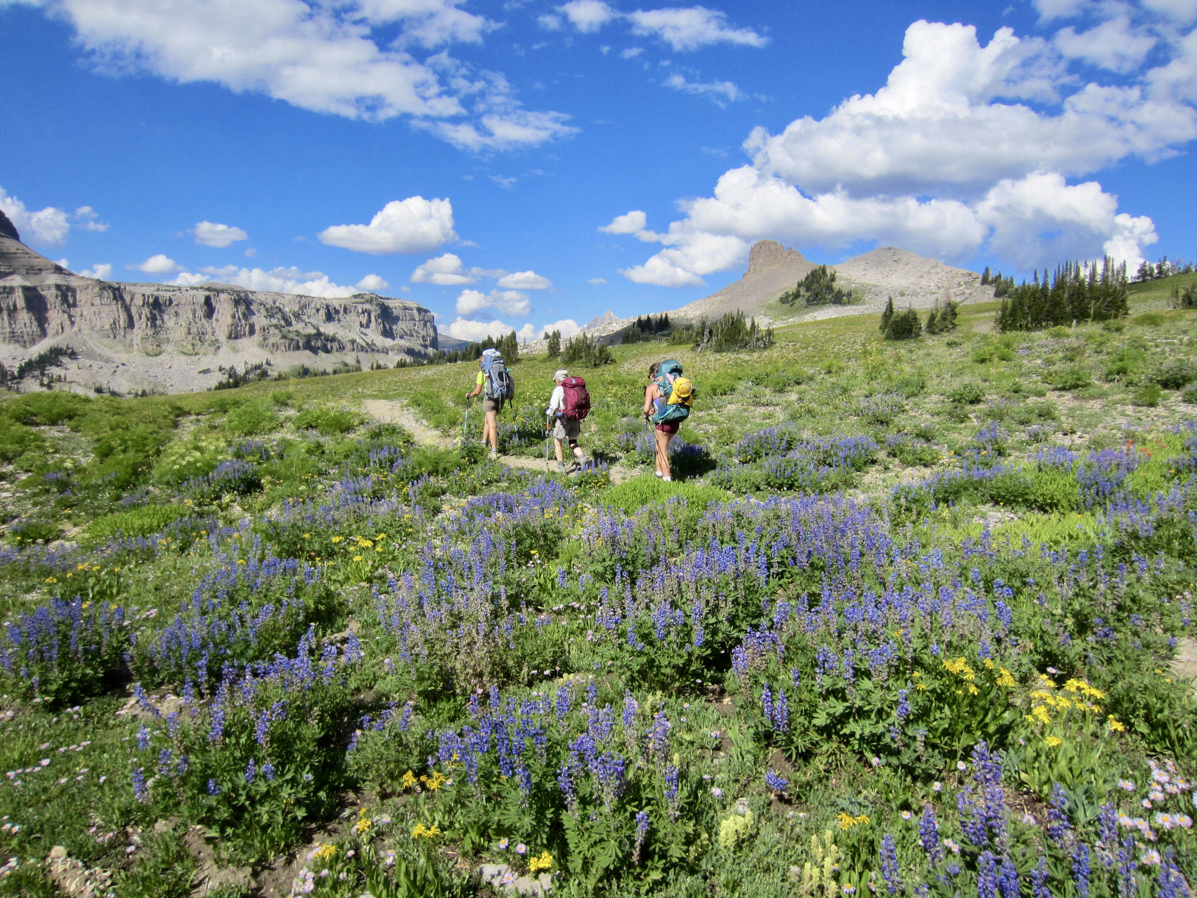We began our morning with a hike northward on Death Canyon Shelf. Don’t let the morbid name alarm you; this broad, 3-mile-long, natural “shelf,” or bench, is a visual delight. The TCT undulates gently through wildflower fields, passing textured limestone boulders and small groves of evergreen trees.