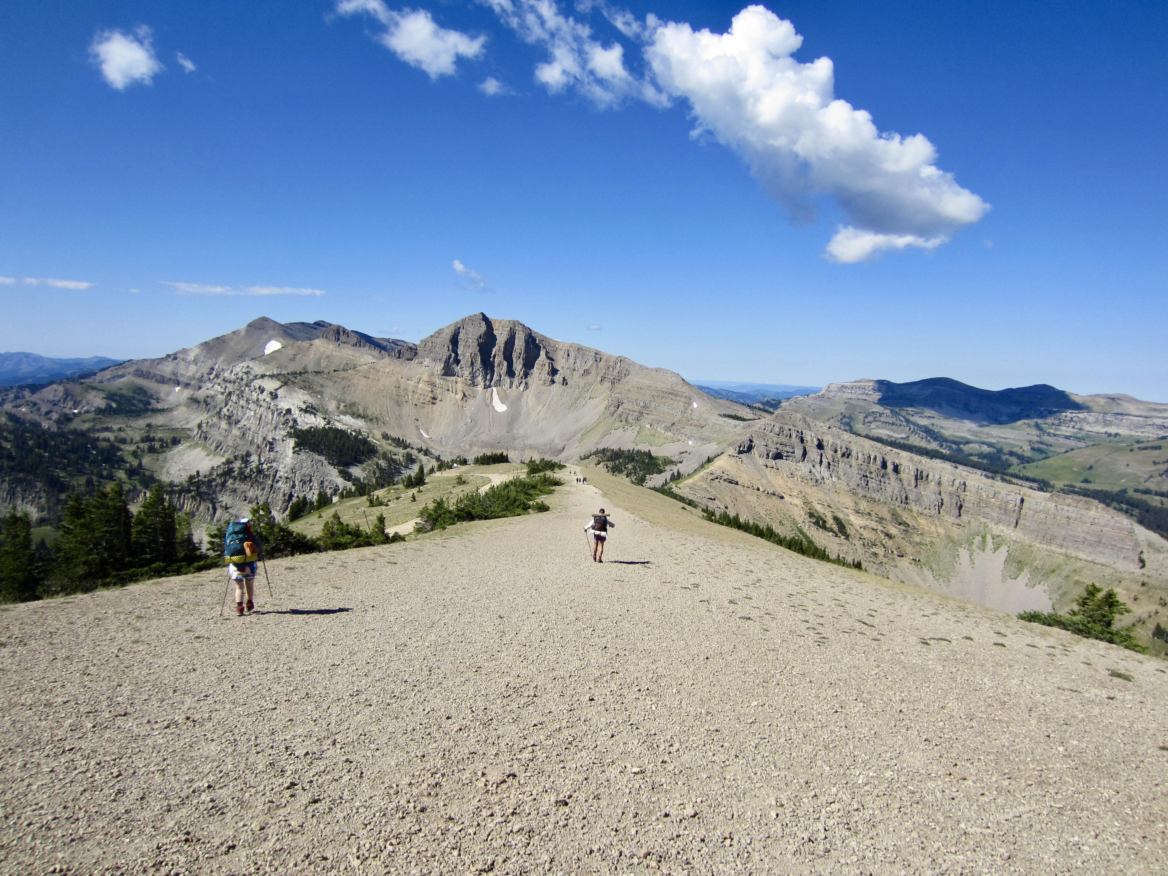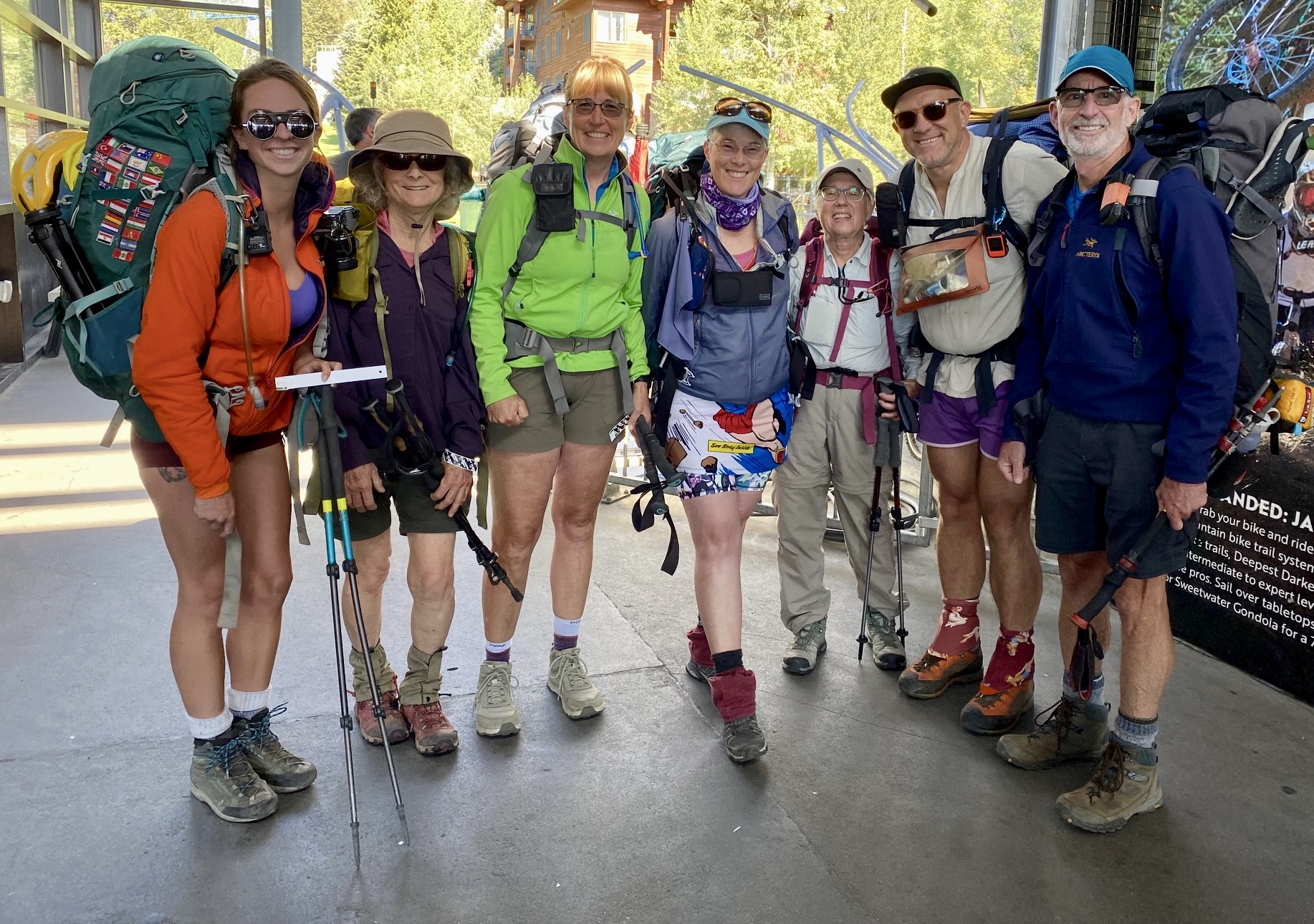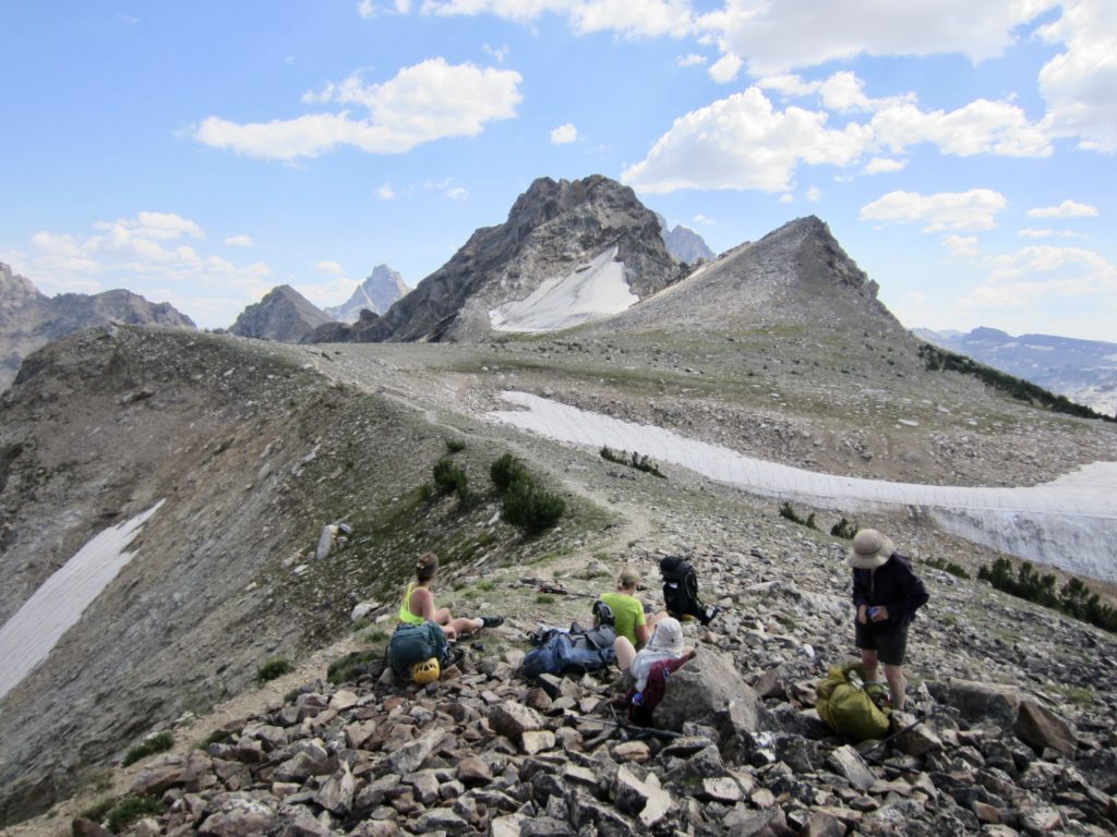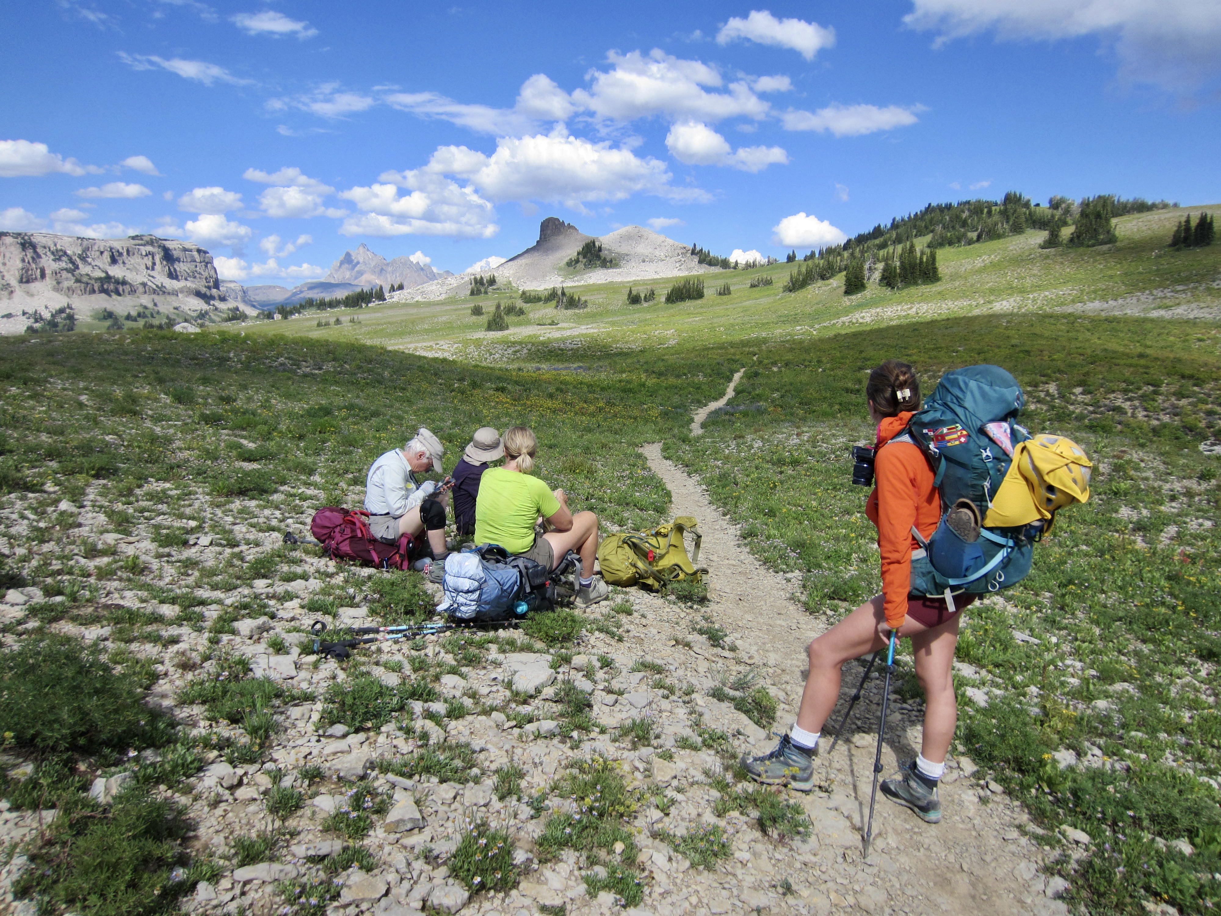 During four days of hot and sunny weather in northwestern Wyoming, Eileen, Brooke, Fay, Beth, Kevin, Maria, and I completed a 35-mile backpacking traverse along the Teton Crest Trail. This scenic trail lies entirely within Grand Teton National Park except for two short segments that cross through the Jedediah Smith Wilderness just outside the park.