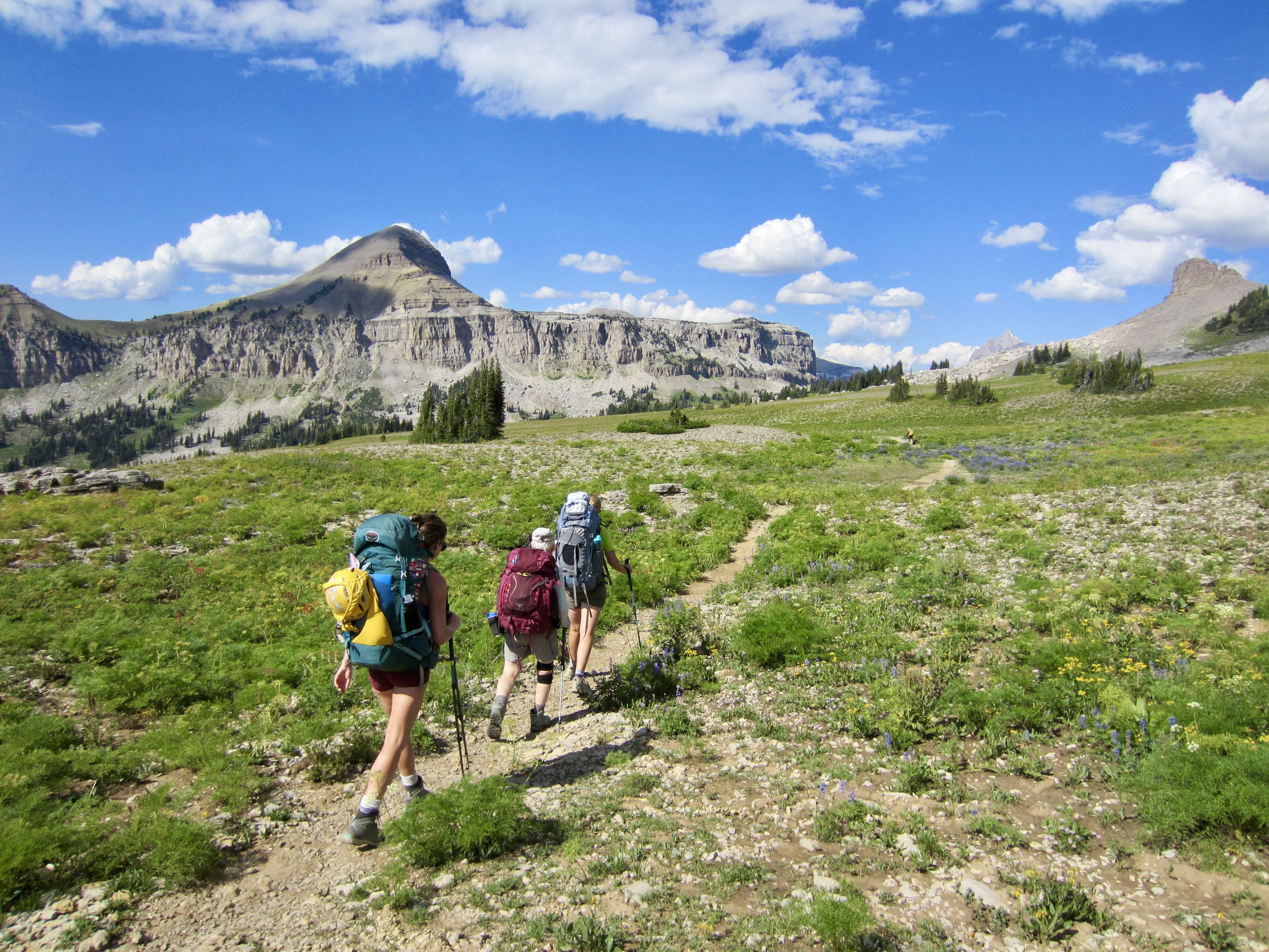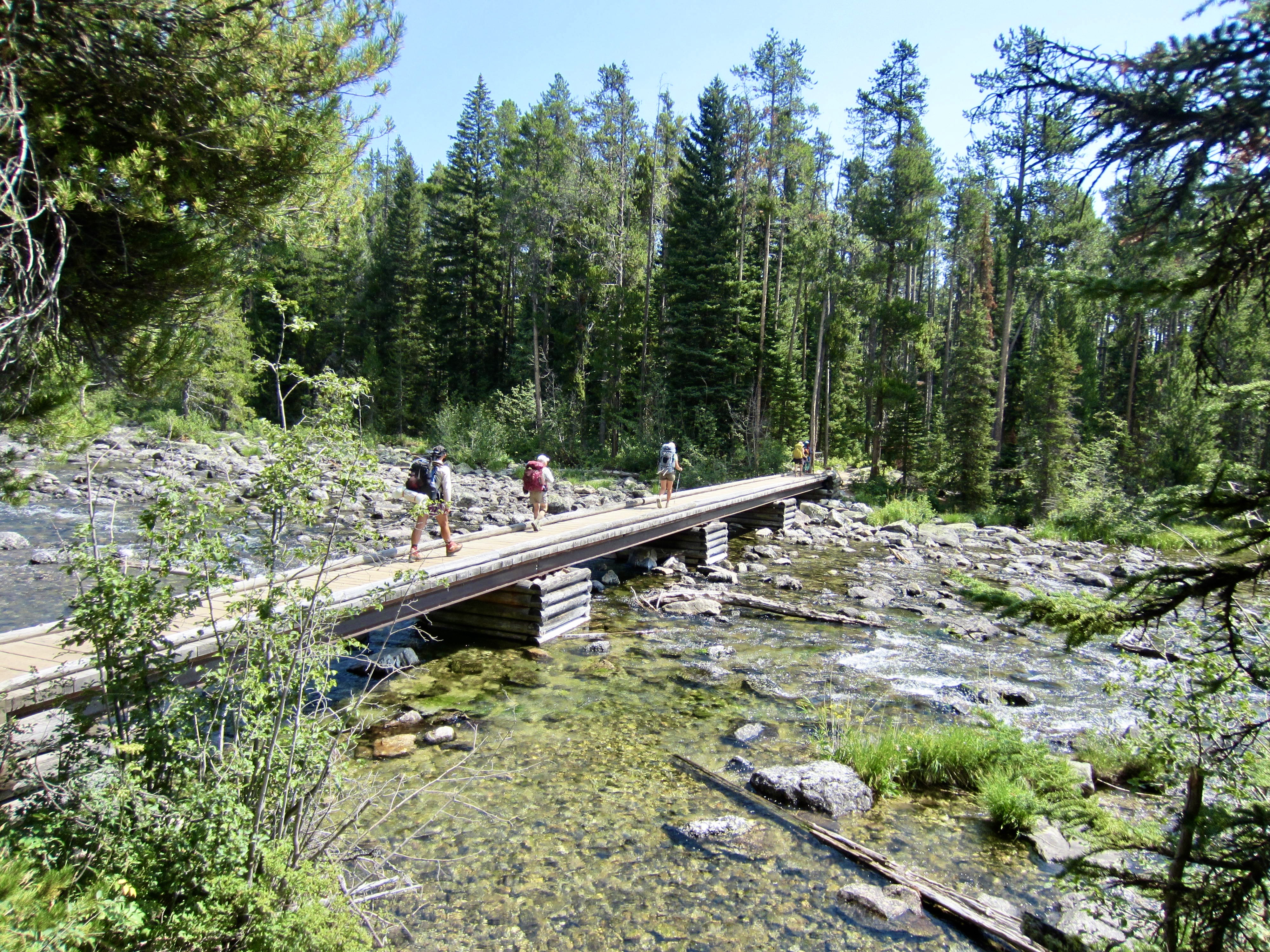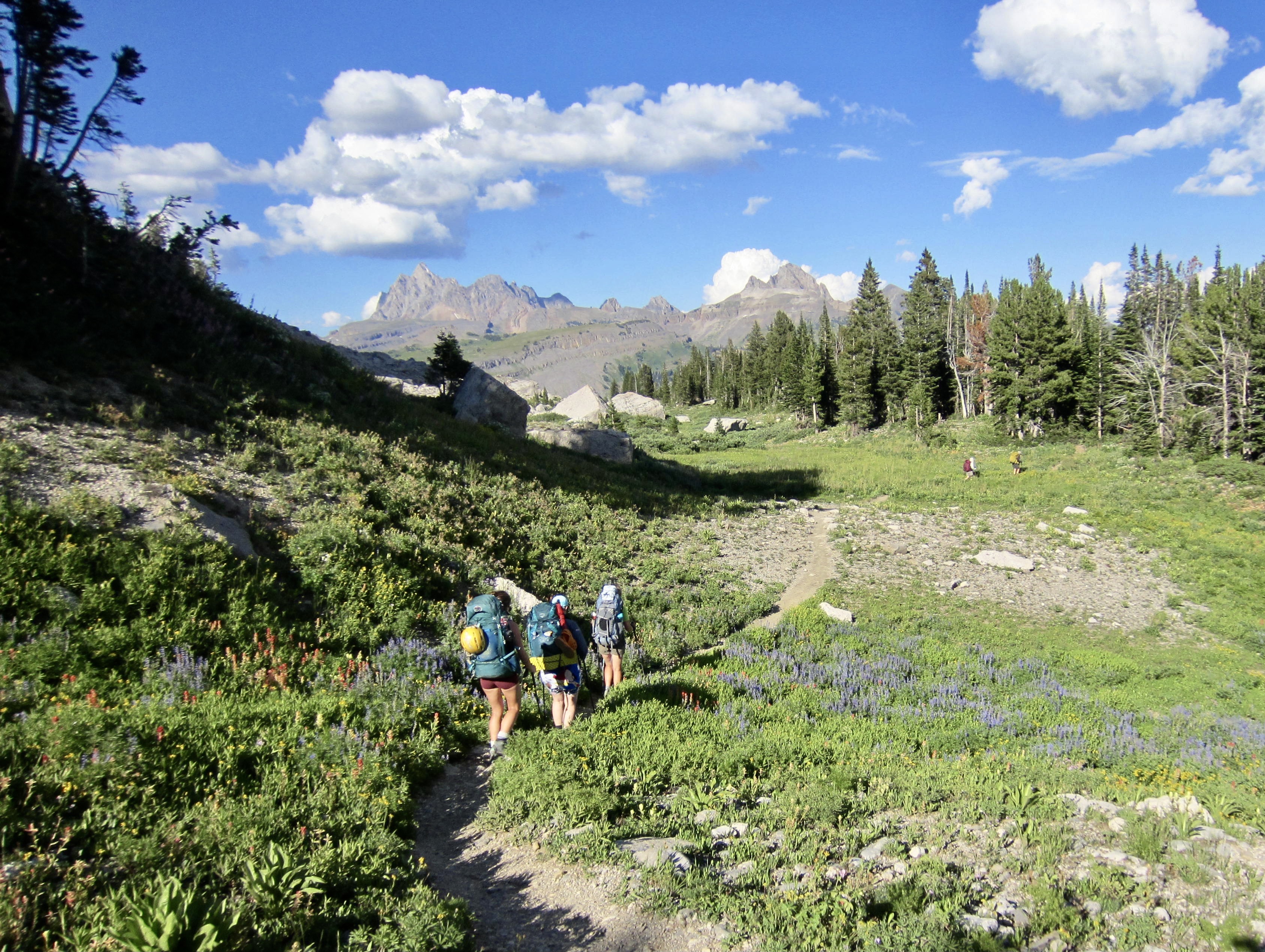 During four days of hot and sunny weather in northwestern Wyoming, Eileen, Brooke, Fay, Beth, Kevin, Maria, and I completed a 35-mile backpacking traverse along the Teton Crest Trail. This scenic trail lies entirely within Grand Teton National Park except for two short segments that cross through the Jedediah Smith Wilderness just outside the park.