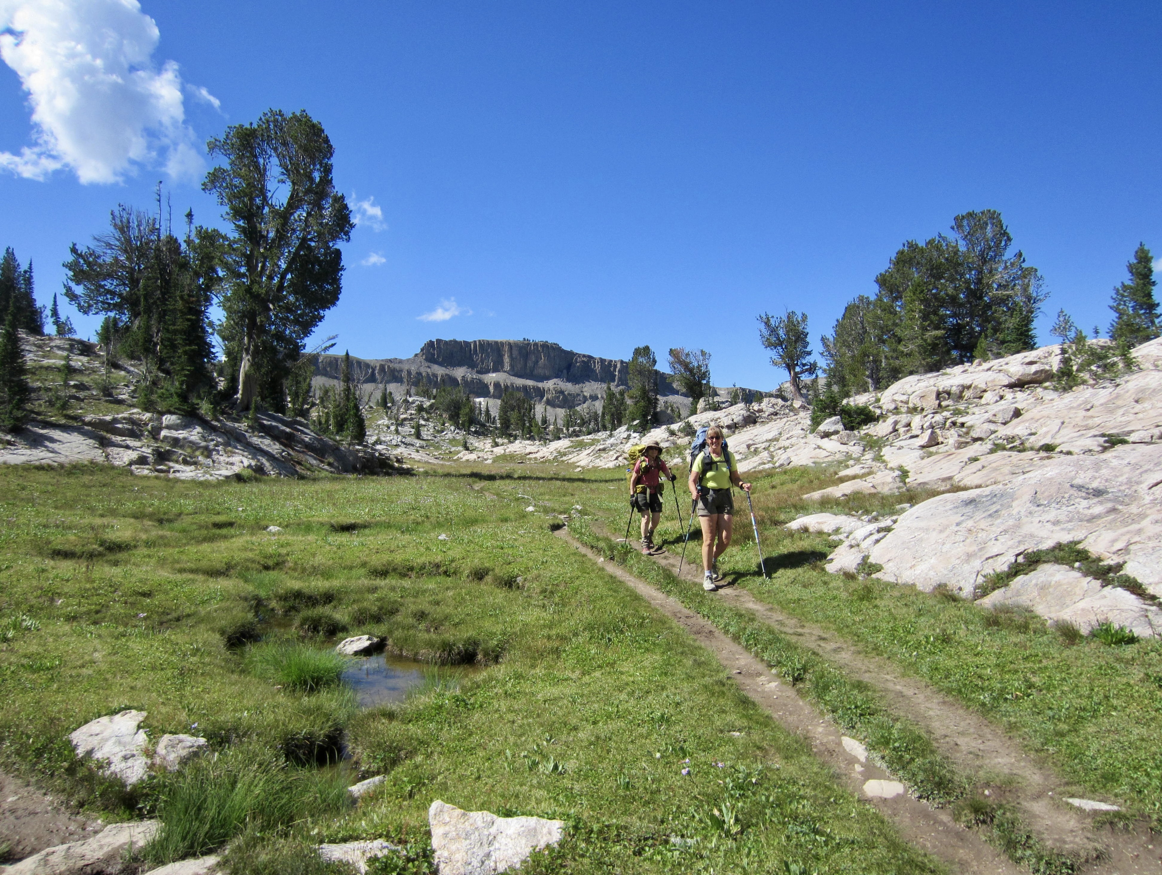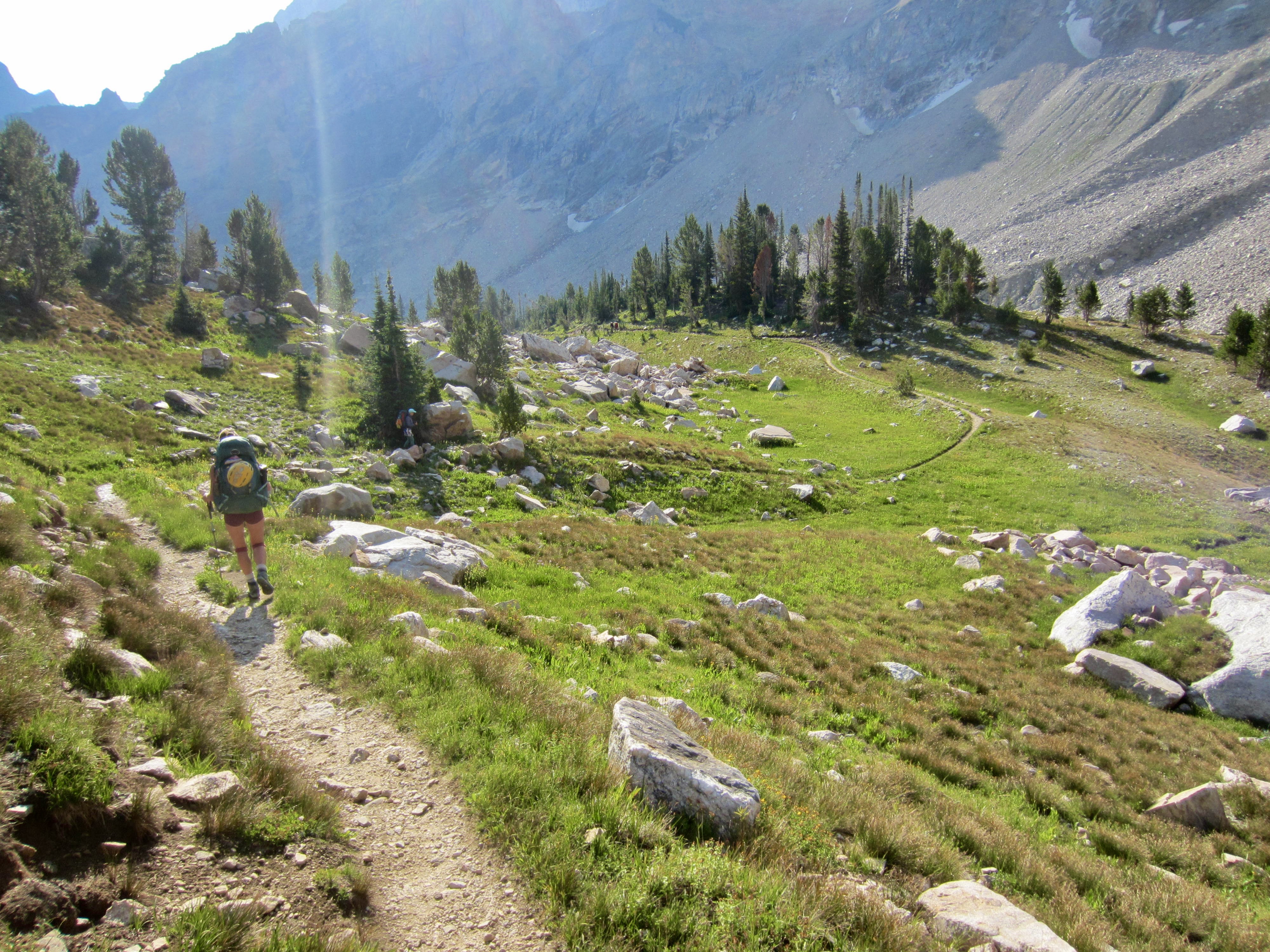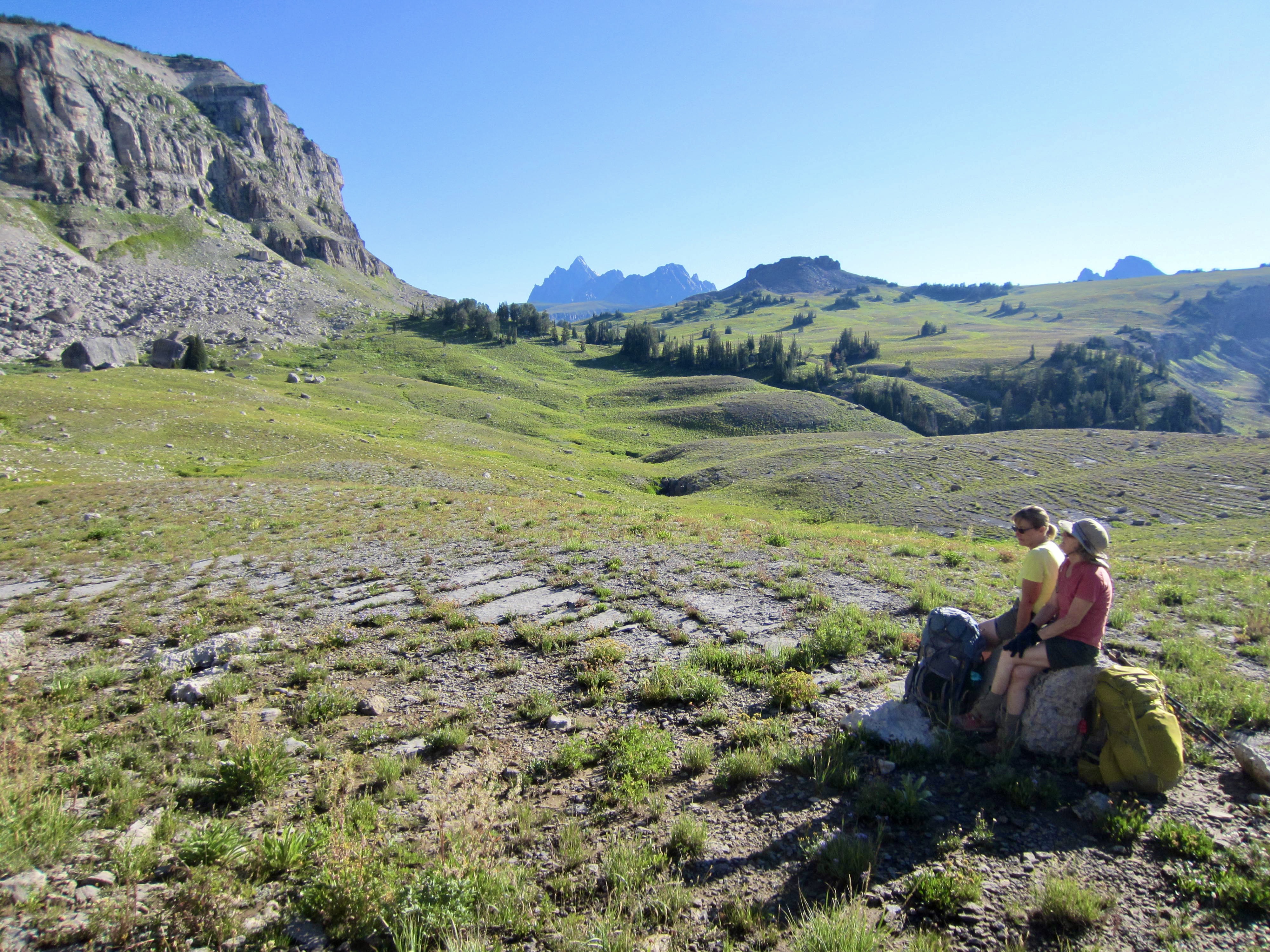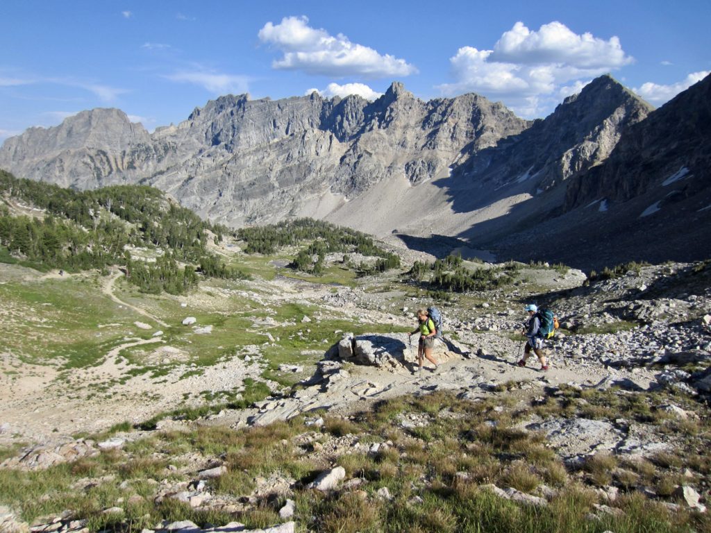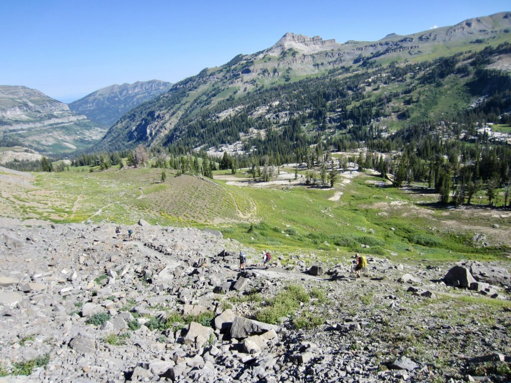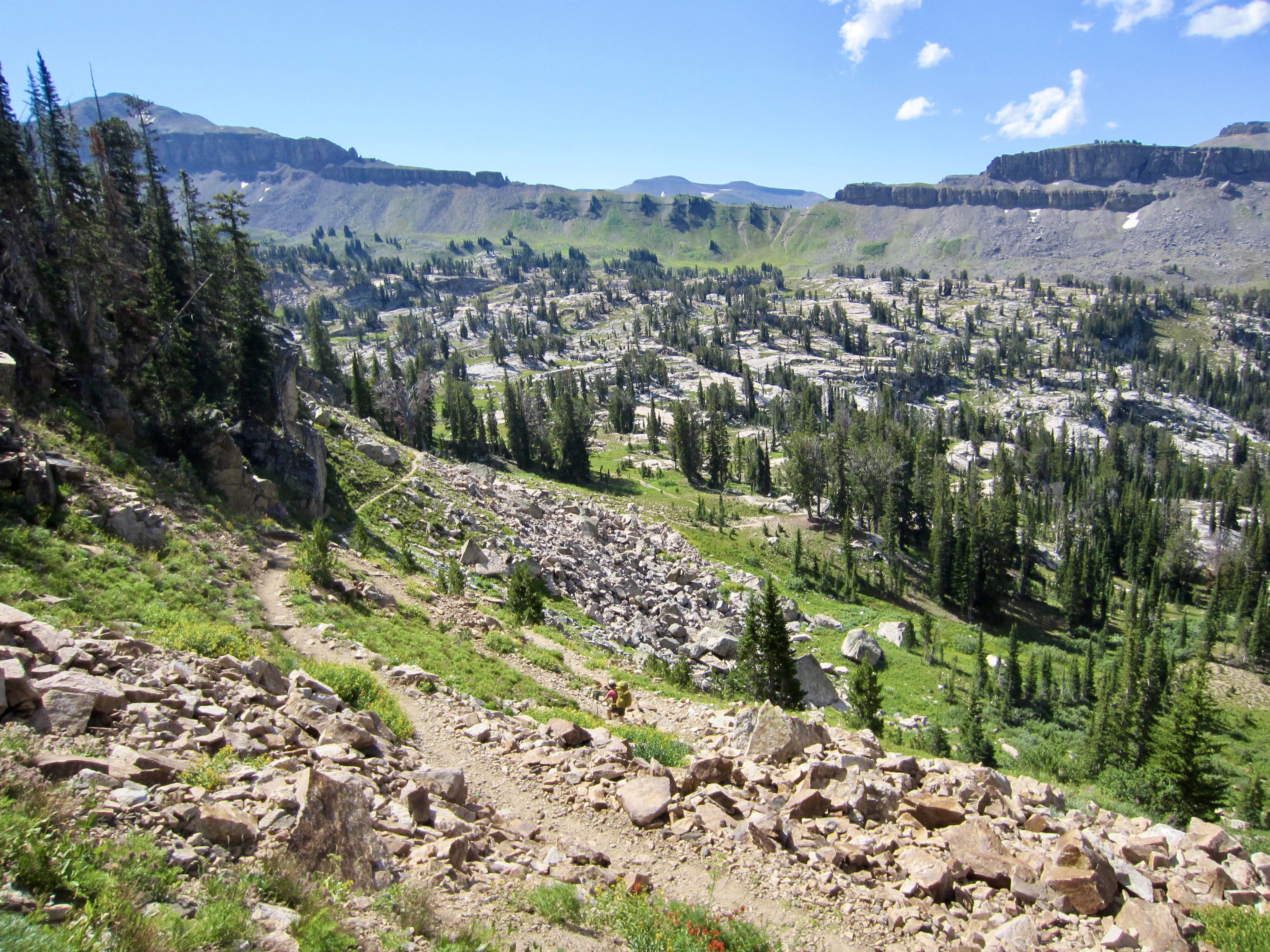 A series of switchbacks known as the Sheep Steps led us down to the floor of Alaska Basin, which forms the headwaters of Teton Creek. This basin features expansive meadows, bedrock slabs, and a cluster of small lakes, all guarded by towering Buck Mountain located closely to the east.