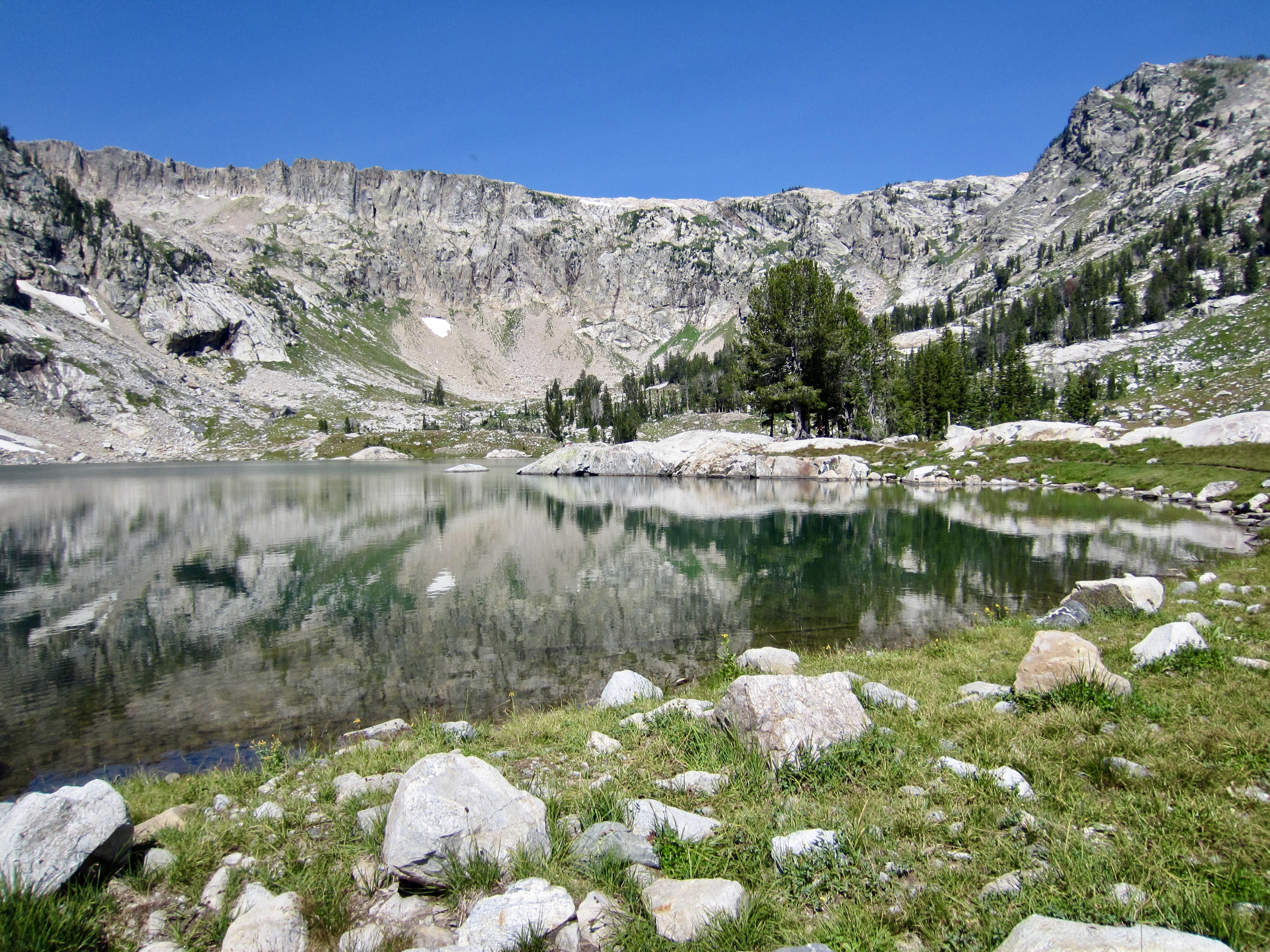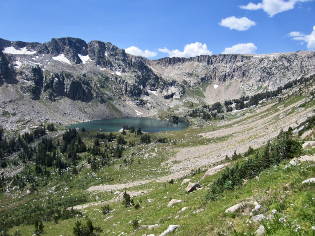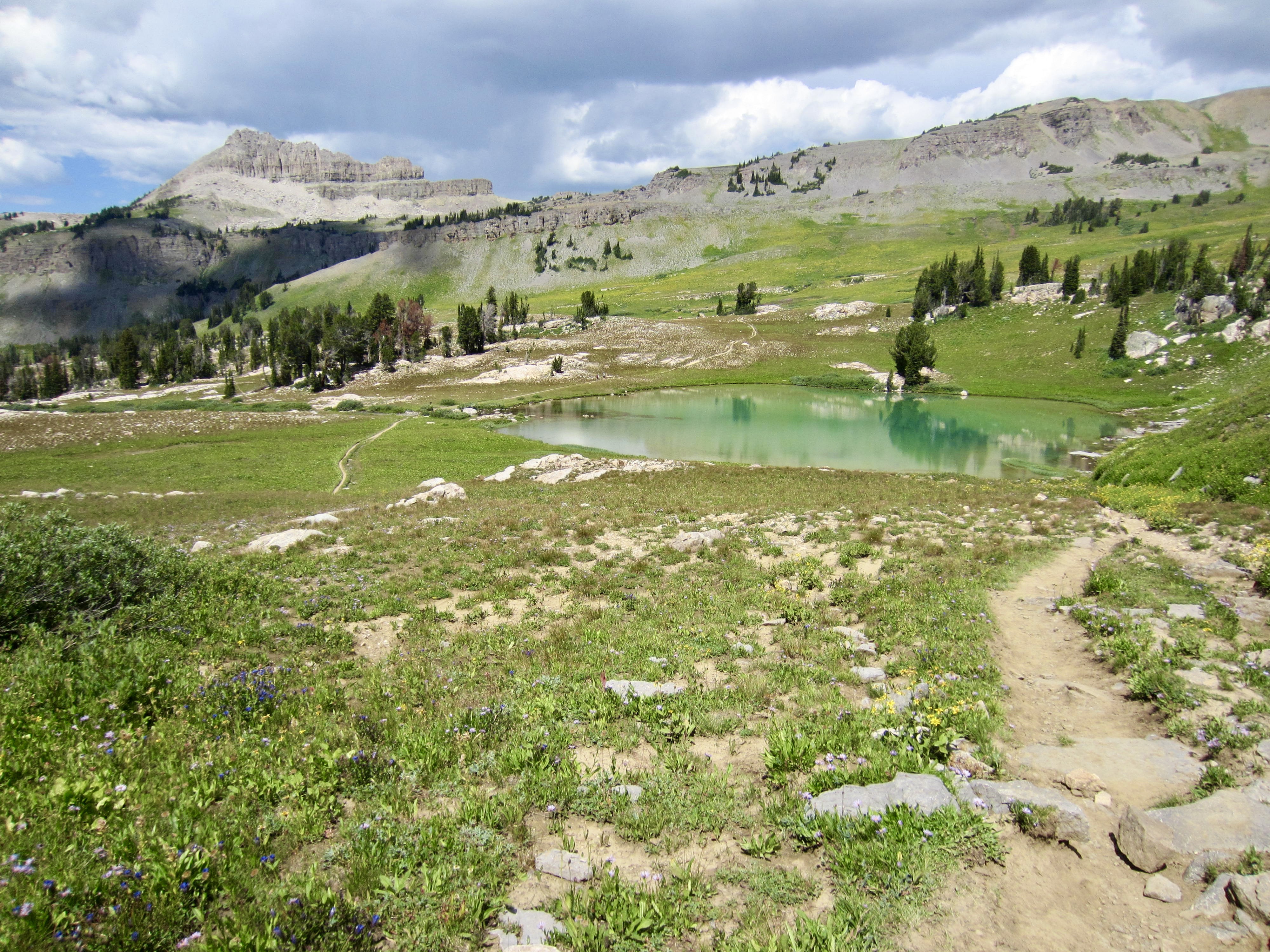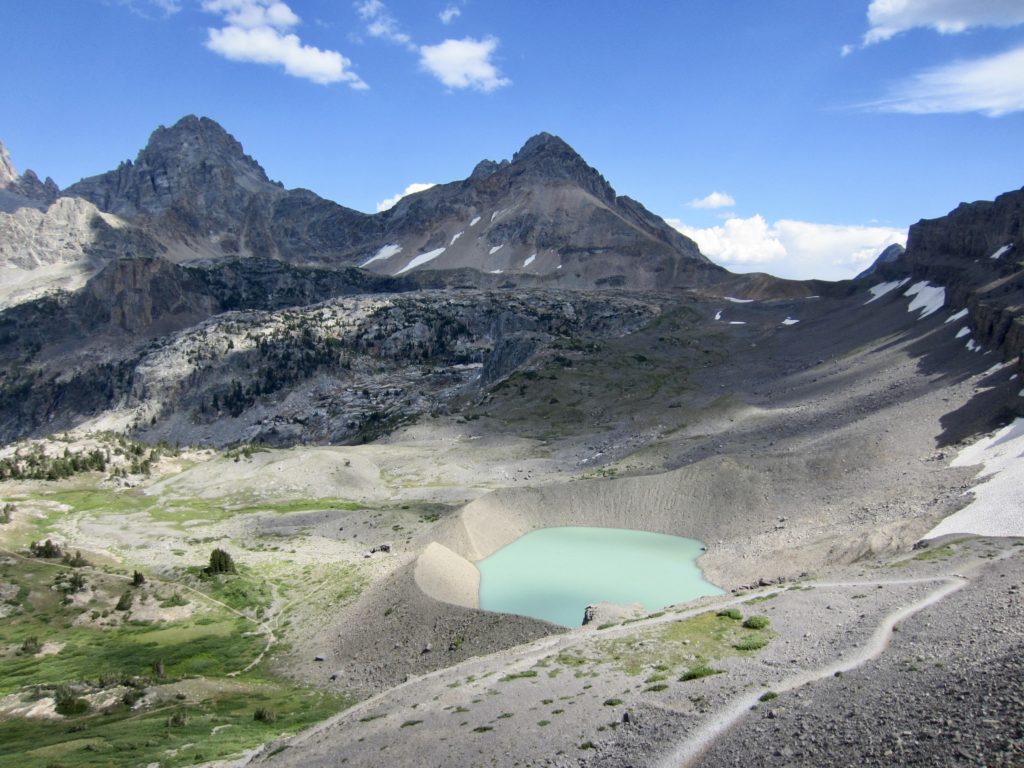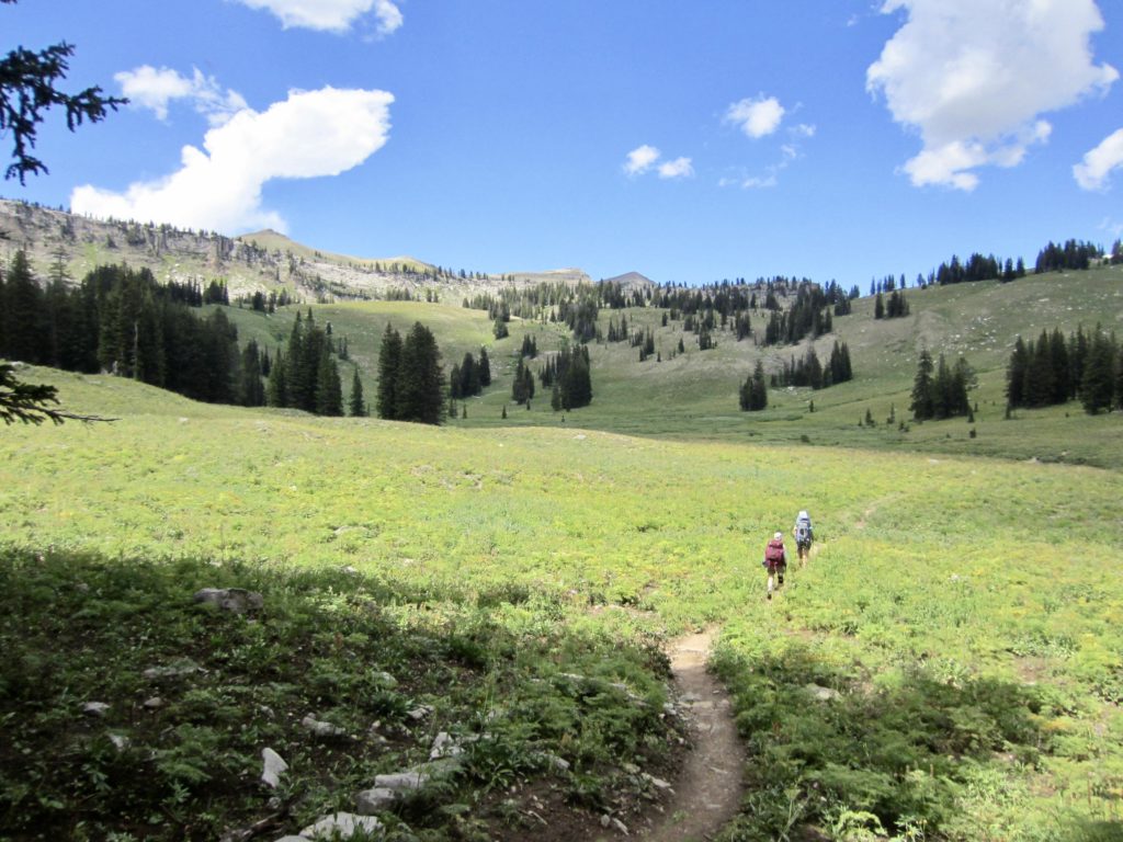 A series of switchbacks known as the Sheep Steps led us down to the floor of Alaska Basin, which forms the headwaters of Teton Creek. This basin features expansive meadows, bedrock slabs, and a cluster of small lakes, all guarded by towering Buck Mountain located closely to the east.