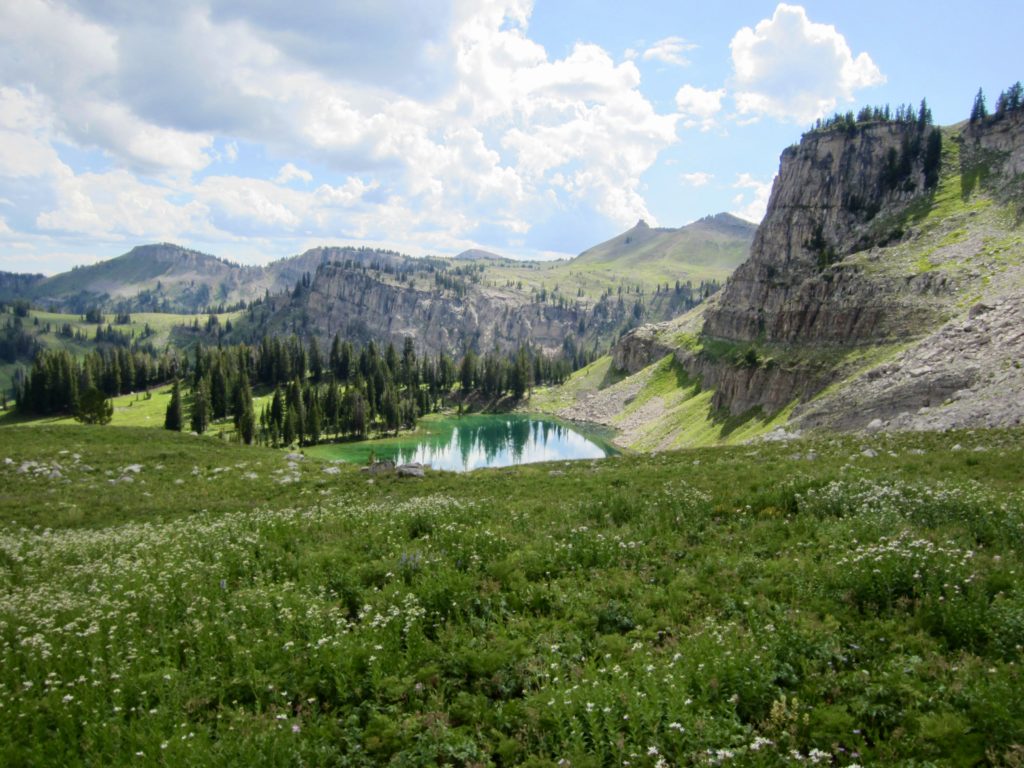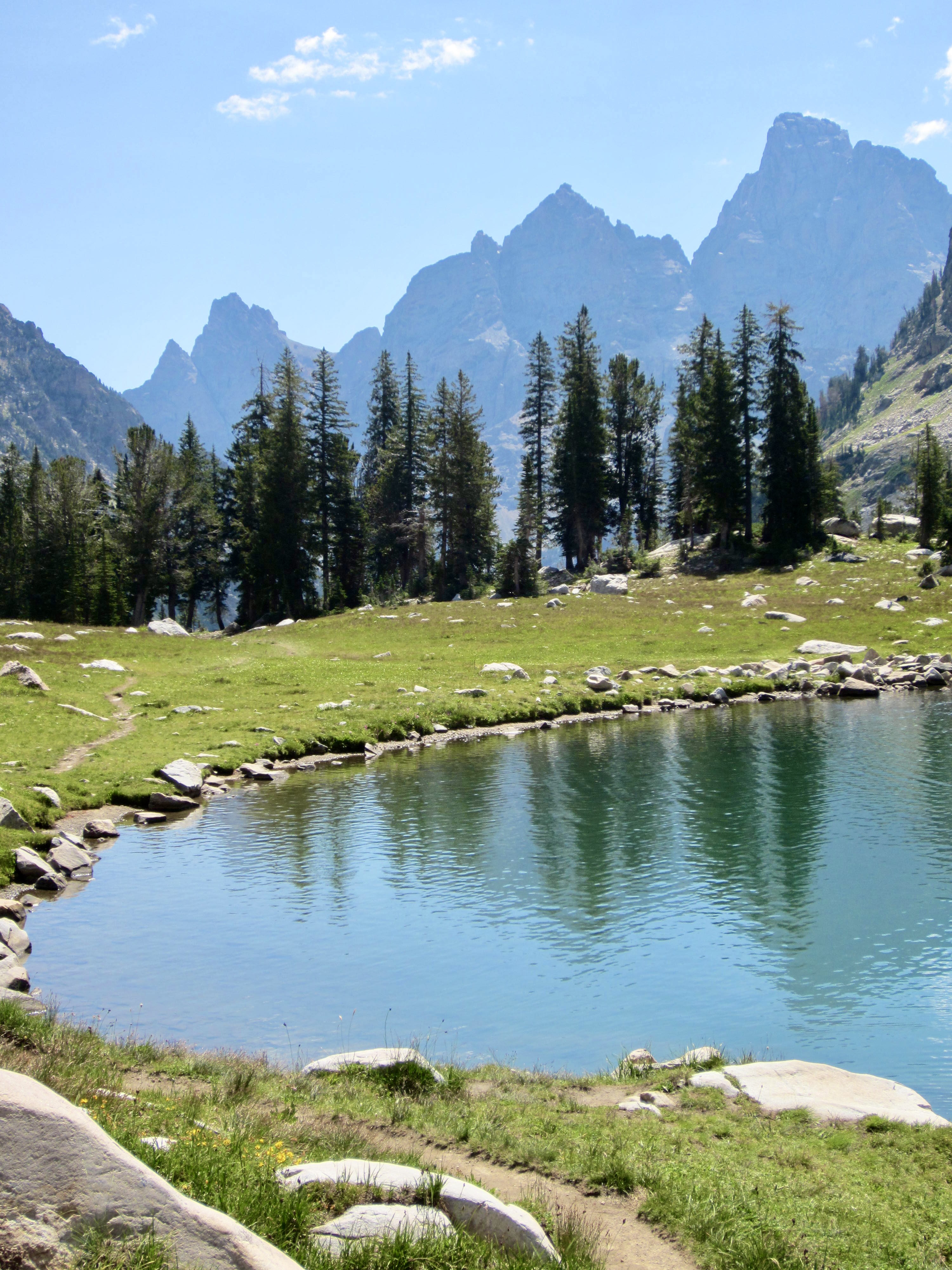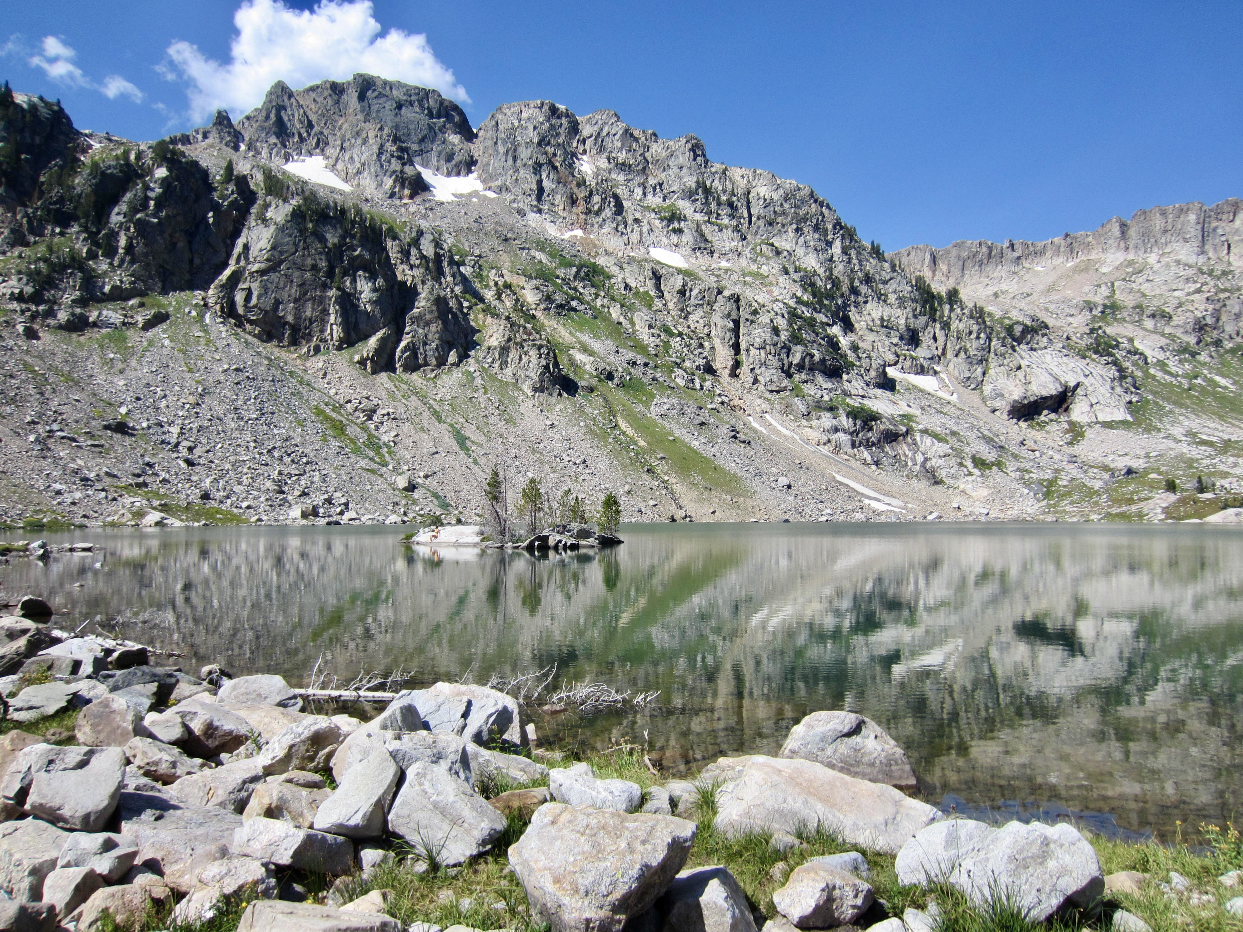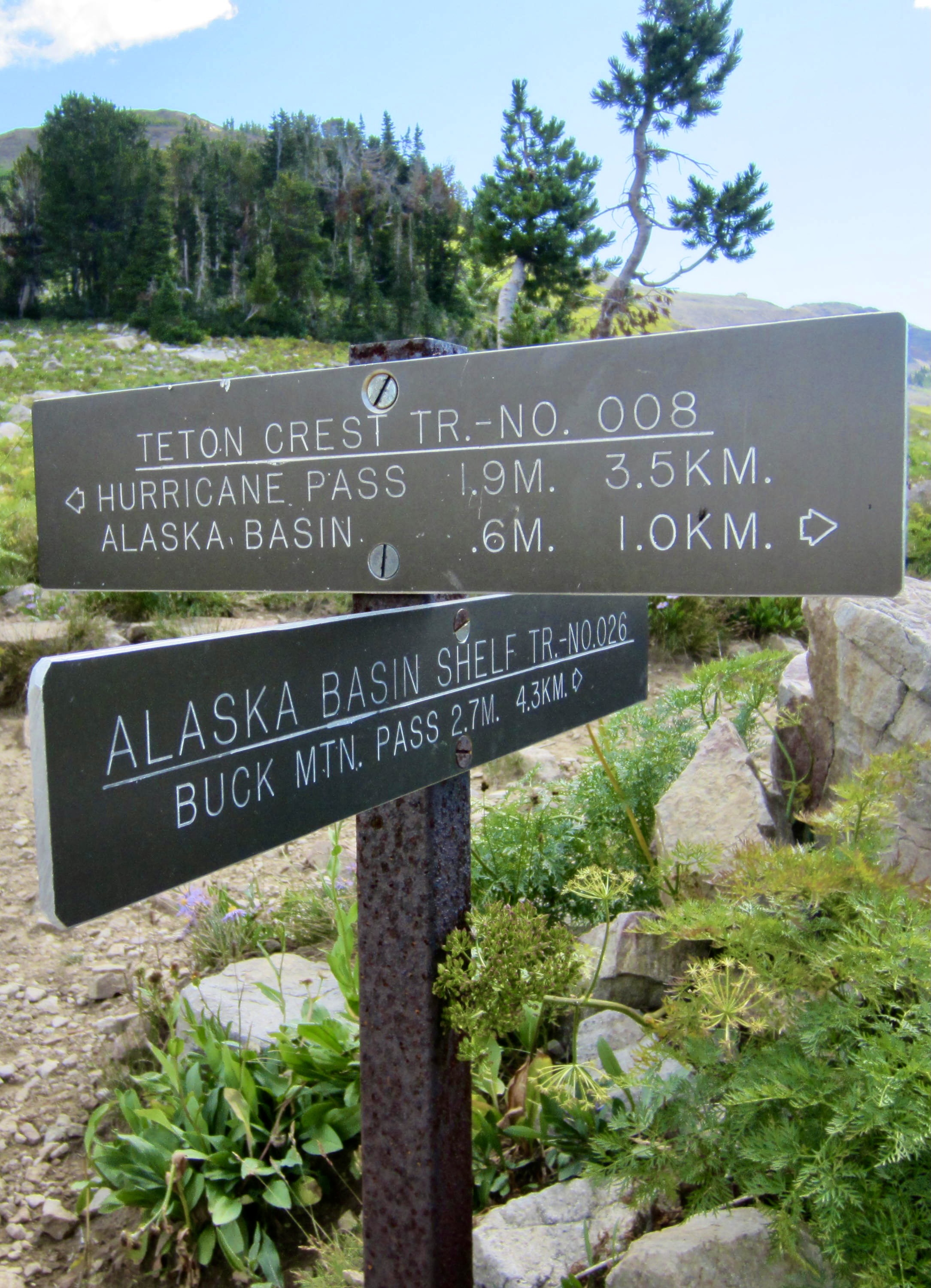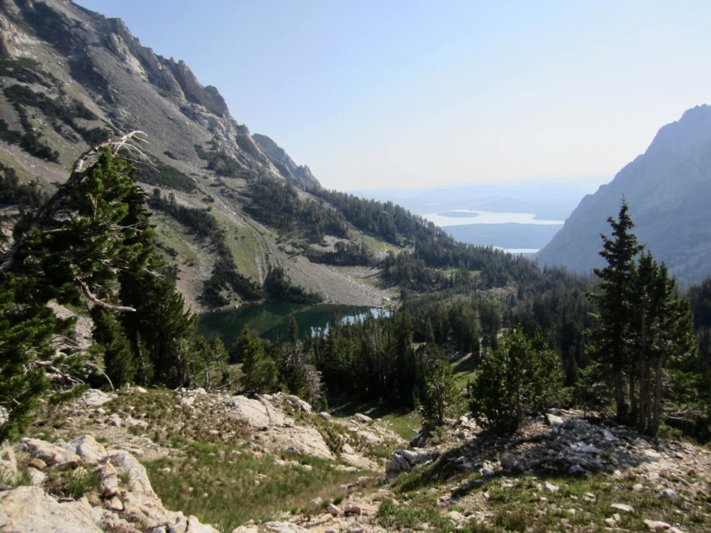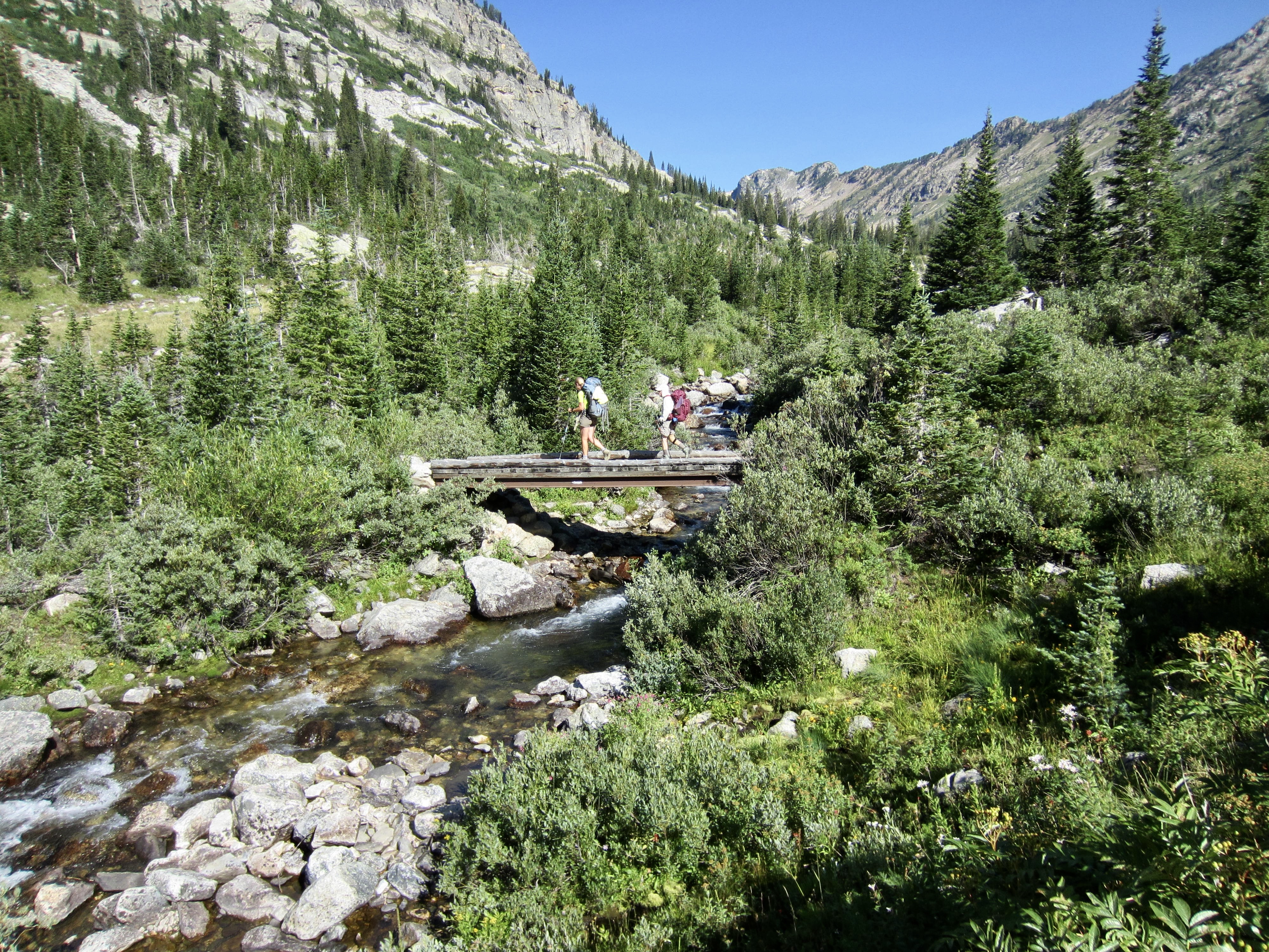 A series of switchbacks known as the Sheep Steps led us down to the floor of Alaska Basin, which forms the headwaters of Teton Creek. This basin features expansive meadows, bedrock slabs, and a cluster of small lakes, all guarded by towering Buck Mountain located closely to the east.
